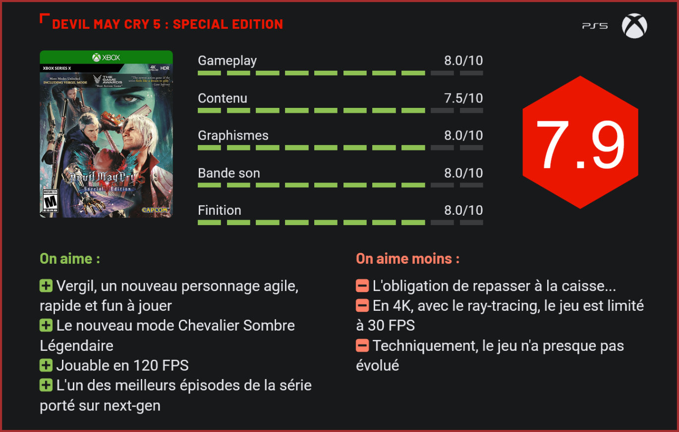 Parmi les meilleurs beat them all sur la dernière génération de machines, Devil May Cry 5 était sans doute l’un des jeux qui avait le plus à y gagner dans un portage sur next-gen. Capcom ne s’est pas fait prier pour ça et nous livre un portage en bonne et due forme, avec la promesse du 120 FPS. Si la plupart des éditeurs ont choisi d’offrir des mises à jour gratuites de leurs jeux sur next-gen, tous ne se sont pas montrés si généreux. Outre Activision, qui facture un léger supplément pour une version optimisée du dernier Call of Duty sur PS5, Capcom a lui aussi choisi de ne pas livrer un upgrade gratuit pour l’excellent Devil May Cry 5. L’éditeur tente de justifier ce choix avec la sortie d’une “Special Edition” qui introduit plusieurs petites nouveautés au niveau du contenu. Le jeu est bien jouable en 120 FPS, mais oubliez le ray-tracing et la 4K. Devil May Cry 5 Special Edition ajoute ainsi principalement un nouveau personnage, Vergil, qui sera également proposé sous la forme d’un DLC payant pour les propriétaires de la version PS4/Xbox One, à 4,99€. Extrêmement rapide, Vergil est également très agile, puisqu’il est littéralement capable de se téléporter à côté de ses adversaires durant les combats. Il est équipé de quatre armes différentes, deux sabres, des poings et des flèches d’énergie et est capable de créer un clone qui combat à ses côtés. Il se révèle être une jolie addition au casting du jeu, et surtout une belle façon de tester les capacités de cette version next-gen, censée mettre l’accent justement sur la vitesse. Esthétiquement, DMC 5 reste très joli, mais ne tire pas forcément parti des capacités des consoles next-gen. L’autre grande nouveauté, c’est le mode Chevalier sombre légendaire, qui est cette fois une exclu next-gen. Dans ce mode de jeu, les ennemis seront beaucoup plus nombreux et les combats seront également plus intenses. DMC 5 prend alors des allures de beat them all extrême. Très clairement, on lui préférera le mode classique pour un premier playthrough, mais pour les fans, ce nouveau mode de jeu ajoute un réel plus à l’expérience puisqu’il y devient possible de se lâcher complètement dans la partie combat. Pas forcément révolutionnaire, mais un joli ajout en endgame. S’il s’agit de deux jolis ajouts, on regrette très clairement que Capcom ne nous livre pas plus de nouveautés dans cette édition spéciale, vendue presqu’au prix plein (39,99€), ni ne donne la possibilité aux propriétaires de l’original d’upgrader leur version du jeu pour quelques euros… Le passage à la caisse est obligatoire pour profiter des améliorations. Les cinématiques du jeu sont superbes en 4K. Outre le personnage de Vergil, les propriétaires de l’ancienne version du jeu pourront également profiter d’une amélioration notable sur next-gen avec des temps de chargement plus courts. Mine de rien, cela change beaucoup de choses, les niveaux du jeu étant très courts. En revanche, ils devront faire l’impasse sur les améliorations techniques, qui apportent un plus non-négligeable à l’expérience avec le support du 120 FPS. Mine de rien, à 120 images par seconde, DMC 5 prend une allure très différente. Le jeu paraît beaucoup plus joli et nous en met plein les yeux dès que les personnages bougent à l’écran. Les joueurs seront toutefois obligés de faire des choix… Pas de ray-tracing en 120 images par seconde. Ce sera soit la 4K et le ray-tracing en 30 images par seconde, soit le ray-tracing, les 60 images par seconde mais une résolution Full HD, soit la 4K et le 120 images par seconde mais pas de ray-tracing. Cette dernière option nous a semblé d’ailleurs être la meilleure option, le ray-tracing n’apportant pas ici de véritable plus à l’expérience de jeu en-dehors de quelques jolis effets visuels dans quelques niveaux. Dante reste bien sûr la star du jeu. On ne va pas vous le cacher, à 39,99€, la pilule passera assez mal pour tous ceux qui avaient déjà craqué pour Devil May Cry 5. Pour ceux qui étaient passés à côté en revanche, cette Special Edition est un joli cadeau et incontestablement l’un des musts du lancement des consoles de nouvelle génération. En atteste encore notre test complet de cet excellent beat them all, qui n’a rien perdu de sa superbe. Conclusion Avec Devil May Cry 5 : Special Edition, Capcom livre une version next-gen très convenue de l’un des meilleurs beat them all de la précédente génération de consoles. Avare en nouveautés, cette réédition du jeu ajoute un nouveau personnage au casting et un nouveau mode de jeu pour le moins “dantesque”. C’est surtout au niveau des performances que le jeu s’offre un lifting, avec le support du 120 images par seconde, de la 4K et du ray-tracing. Il ne faudra toutefois pas rêver : ce sera l’un ou ce sera l’autre. Si vous étiez passé à côté de cet excellent jeu au moment de sa sortie, la Special Edition vous permettra de jouer les séances de rattrapage. Dans le cas contraire, vous pesterez sans doute contre la politique de Capcom, de refacturer 39,99€ pour ce qui aurait dû être un upgrade gratuit…