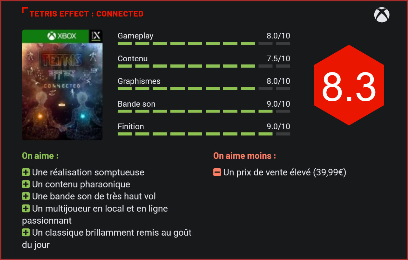 Parmi les jeux de lancement des Xbox Series, Tetris Effect Connected s’impose comme l’une des meilleures surprises de cette fin d’année. Né en 1984 en Union Soviétique, Tetris aura connu une multitude de déclinaisons à toutes les sauces. Presque tombée dans l’oubli durant une décennie, la franchise a récemment eu droit à un regain d’intérêt avec la sortie d’un battle royale sur Switch et d’une déclinaison en réalité virtuelle sur PS4, le très sympathique Tetris Effect. Celui-ci nous revient aujourd’hui dans une version revue et corrigée qui introduit une pléthore de modes multijoueurs. Tetris Effect: Connected est avant tout un voyage sensoriel. Exit donc la réalité virtuelle pour Tetris Effect et place au multijoueur. Un choix intelligent de la part de Microsoft, d’autant plus que le jeu est intégré au Gamepass. A ce sujet, on vous conseille plutôt d’y jouer via cette formule à la place d’un achat – le titre étant facturé 40€. Aussi excellent puisse-t-il être, Tetris Effect: Connected reste un jeu Tetris et cette tarification est à ce titre très difficile à justifier. On ne va pas vous mentir, personne n’achète une nouvelle console pour jouer à Tetris. Tetris Effect: Connected est pourtant, étonnamment, le jeu sur lequel vous risquez de passer le plus de temps si vous venez de craquer pour une Xbox Series. Car en dépit des apparences, il ne s’agit pas d’une simple refonte de Tetris. Tetris Effect: Connected propose une expérience solo “sensorielle”, avec une succession de défis à la difficulté croissante en solo, dans lesquels les sons et l’esthétique se marient parfaitement. Dans certains niveaux, ce sont les mouvements des blocs qui composeront la mélodie. Dans d’autres, l’esthétique du jeu changera progressivement, au fil des points qui s’accumulent. Chaque nouveau tableau représente à la fois un nouveau défi mais également une nouvelle expérience, avec des visuels inédits à chaque fois et des compositions musicales d’une beauté à couper le souffle. Le son n’influencera en revanche jamais les mécanismes du jeu. Chaque nouveau tableau est l’occasion de découvrir un nouveau background, un nouveau skin et une nouvelle mélodie… Dans son gameplay, Tetris Effect: Connected reste très classique. Le but est le même que dans le tout premier jeu Tetris : “éliminer un maximum de lignes possible”, en empilant correctement des blocs de formes différentes. Le joueur peut choisir d’accélérer leur chute, changer l’orientation des blocs, voire en zapper un pour passer au suivant. Le concept reste très simple donc. Les créateurs du jeu ont toutefois introduit une petite nouveauté avec la “zone”, une fonction qui permet de geler le temps durant quelques secondes pour multiplier les combos. Durant ces instants, les lignes complétées ne disparaissent pas de l’écran, elles descendent tout en bas, débarrassant une partie de l’écran de jeu, et ne disparaîtront qu’une fois la barre de zone vide. Plus il y en aura, plus le joueur marquera de points bonus. Et mine de rien, ce power-up ajoute pas mal de piquant aux parties. Esthétiquement, le jeu se révèle étonnamment varié. S’il perd le mode VR sur Xbox Series, le jeu d’Enhanced gagne en revanche des modes multijoueurs. Il s’agissait très clairement du plus gros défaut du jeu originel, qui se présentait comme un titre solo uniquement, alors que Tetris est un concept qui fonctionne particulièrement bien à plusieurs. Tetris Effect: Connected est à ce titre une version beaucoup plus riche que son ainé puisqu’on retrouve du multijoueur en local (jusqu’à quatre) et du multijoueur en ligne. Si on regrette quelque part l’absence d’un mode battle royale qui aurait eu tout son sens, les quelques modes de jeu proposés n’en restent pas moins très réussis. On retrouve le traditionnel mode Score Attack, dans lequel deux joueurs s’affrontent dans un bras de fer, sans pouvoir utiliser la fonction “zone”. Il s’agit du mode multijoueur le plus classique. Vient ensuite la variante hardcore avec “Classic Score Attack”, qui supprime toutes les aides et indicateurs : le joueur n’aura pas d’indice sur la prochaine pièce, il ne pourra pas accélérer sa chute ni mettre de côté un tetrimino. Le mode “Zone Battle” propose quant à lui des affrontements beaucoup plus vindicatifs puisqu’ici, compléter une ligne en ajoute une à l’adversaire, compliquant sa tâche. Les parties peuvent se terminer très rapidement si les deux adversaires ont des niveaux différents. Enfin, on retrouve également un mode plus original baptisé “Connected”, dans lequel trois joueurs devront coopérer pour venir à bout de non pas un, ni deux mais trois boss différents. Dans ce mode, les joueurs devront s’entraider pour faire un max de dégâts à l’adversaire en cumulant des lignes en mode Zone. C’est fun, terriblement efficace pour animer une soirée entre amis, et suffisamment original pour vous tenir scotché à votre manette durant des heures. Si les 3 boss sont gérés par défaut par une IA à la difficulté paramétrable, il est possible qu’un joueur prenne sa place. Le multijoueur représente un très gros ajout dans cette version “next-gen” du jeu. Tetris Effect: Connected n’aurait sans doute pas été le jeu qu’il est aujourd’hui sans le formidable travail de ses créateurs, qui ont travaillé très dur pour lui donner un style unique. Oui, c’est un jeu Tetris, mais c’est aussi une formidable expérience solo et multijoueur, propulsée par une superbe direction artistique et une réalisation sans bavures. Rien de très surprenant en soi puisque c’est aux parents de Lumines que l’on doit ce très grand jeu. Conclusion Plus proche d’une expérience sensorielle que d’une refonte du grand classique du jeu vidéo, Tetris Effect: Connected est une formidable relecture de Tetr