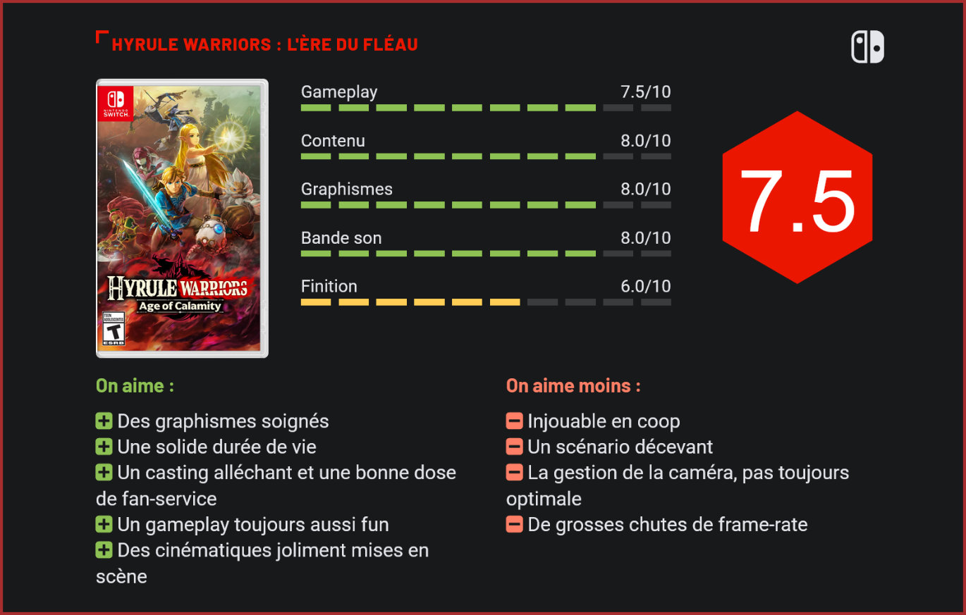 C’était la sortie événement de cette fin d’année sur Switch. Hyrule Warriors 2, le musô spin-off de la série culte des Zelda, débarque en exclusivité sur la petite console de Nintendo. L’année 2020 aura été “compliquée” pour Nintendo. Si sa console nomade continue à très bien se vendre, les consommateurs se sont rapidement tournés vers les consoles de nouvelle génération, qui promettent des performances encore plus impressionnantes. Nintendo, qui continue à jouer la carte de l’originalité, a bien du mal à proposer des expériences pour gamers et se repose aujourd’hui sur les studios externes pour cette approche. C’est ainsi qu’il avait confié à la Omega Force (Dynasty Warriors) le développement d’un spin-off de Zelda baptisé Hyrule Warriors reprenant les codes du musô. Esthétiquement, le jeu a très joli. Il pousse dans ses derniers retranchements la petite console de Nintendo. Le succès quelque peu inattendu du premier volet a naturellement conduit Nintendo à renouveler son partenariat avec la Omega Force, qui nous livre aujourd’hui un nouveau volet directement lié à l’arc narratif de Breath of the Wild. Hyrule Warriors : L’Ère du Fléau se déroule 100 ans avant les événements narrés dans Breath of the Wild, à l’époque du Grand Fléau, période durant laquelle Hyrule a été dévasté par une force maléfique. Sur fond de voyage dans le temps, l’intrigue de L’Ere du Fléau est timidement reliée à l’histoire de Breath of the Wild. Si elle lève le voile sur une période méconnue de l’histoire d’Hyrule, cette nouvelle aventure n’est scénaristiquement pas la plus passionnante à suivre. La connexion avec Breath of the Wild reste également minimaliste. Inutile de vous le préciser : il n’est pas indispensable de jouer à ce jeu en anticipation de la sortie du prochain Zelda. Ceci étant dit, les développeurs ont fait de gros efforts pour rendre le divertissement aussi intéressant que possible avec des cinématiques très bien mises en scène, une bonne dose d’héroïsme et du fan-service à gogo. Et à ce niveau, c’est déjà plutôt une belle réussite. Clairement, Hyrule Warriors : L’Ère du Fléau est une formidable lettre d’amour à la série culte de Nintendo. On le sent, les développeurs ont choyé leur projet dans les moindres détails : les cinématiques en mettent plein les yeux, la narration est soignée, on retrouve toutes les musiques les plus épiques de la saga, le travail de représentation est fidèle aux précédentes productions de la série et le casting réunit un nombre impressionnant de personnages principaux et secondaires de la saga. Les fans en auront donc largement pour leur argent. Les combats impliquent plusieurs centaines d’unités. Côté gameplay, la recette reste finalement assez proche du premier volet, qui se présentait déjà comme une copie des bons vieux Dynasty Warriors à la sauce Zelda. Le joueur est transporté à travers une série de batailles qui prennent place dans des niveaux inspirés des lieux cultes de la série, dans lesquels il faudra réaliser différentes missions : protéger une position, éliminer un boss ennemi, se rendre à tel endroit,… Hyrule Warriors 2 exploite tous les codes du genre mais brille toutefois par la technicité de son gameplay qui ne se limite pas ici à qui frappe le plus fort. Comme dans les autres Dynasty-Warriors-likes, le joueur sera amené à massacrer des centaines d’ennemis dans des combats massifs. Seuls les boss et demi-boss représentent un véritable challenge. Les autres sont purement et simplement de la chaire à canon. Pour vaincre les boss, il faudra non seulement maîtriser les différents coups et combos, mais aussi et surtout activer les attaques spéciales au bon moment, ne pas rechigner à utiliser des bombes et sortilèges de feu, de glace et de foudre, que vous récupérerez en massacrant certains ennemis qui lâcheront une baguette derrière eux. Un nouveau mécanisme lié à Breath of the Wild qui ajoute un peu de profondeur au jeu car c’est bien au niveau de la diversité des combos que ce Hyrule Warriors 2 se distingue des autres musôs. Le jeu est beaucoup plus profond et fun que ses modèles et dans l’ensemble mieux structuré également. Il va de soi que les mécanismes de jeu restent toutefois assez répétitifs. Les attaques spéciales sont variées et le jeu se révèle plus profond que la plupart des musôs. Hyrule Warriors 2 offre un joli casting avec un nombre impressionnant de personnages jouables qui se dirigent tous différemment et disposent tous d’attaques uniques. La rejouabilité du jeu est donc excellente, pour peu que vous ne vous lassiez pas du concept. Chacun y trouvera en tout cas chaussure à son pied. De façon générale, le contenu du jeu est d’ailleurs très généreux. Comptez une bonne vingtaine d’heures pour en voir le bout, plus si vous cherchez à le compléter à 100%. En revanche, carton rouge pour ce qui est de la technique. Si Hyrule Warriors 2 est beaucoup plus fin que son ancêtre et dans l’ensemble un jeu à la fois très joli et très fidèle au style graphique de Breath of the Wild, la Switch n’est tout simplement pas capable de le faire tourner dans des conditions optimales. En coop à deux, le jeu est tout simplement injouable avec des baisses de frame-rate permanentes. Quand on connait l’importance du mode coop dans ce type de jeu, il est évident que cela va faire grincer des dents… En solo, on note également des baisses de frame-rate récurrentes. La plupart du temps, le jeu tourne à 30 images par seconde. Dès que le nombre d’adversaires augmente à l’écran, il baisse facilement de moitié. Les coups sortent au ralenti et l’expérience en prend un sacré coup. Même lors des déplacements du personnage on regrette d’ailleurs que les animations paraissent aussi lentes… Et c’est bien là le principal reproche que l