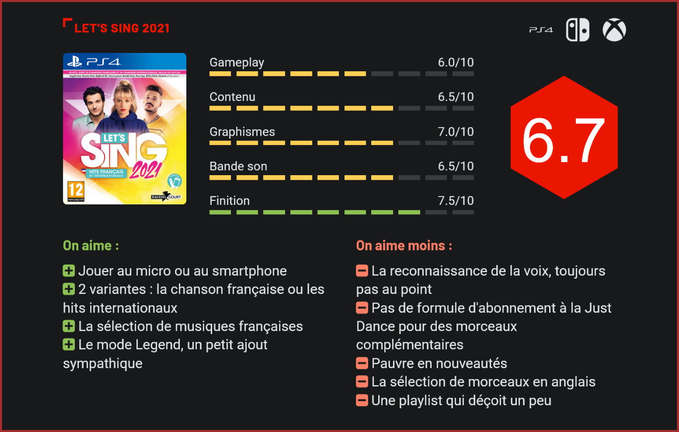 Après un épisode dédié à l’oeuvre de Queen, Let’s Sing nous revient avec une nouvelle cuvée qui fait la part belle à la chanson française. La série Voxler prendra-t-elle enfin son envol? Face à l’absence de concurrent, Voxler a pratiquement le champ libre pour sa série des Let’s Sing. L’éditeur avait livré une cuvée 2020 plutôt convaincante déjà, malgré un gros manque de nouveautés. Il poursuit sur sa lancée avec une cuvée 2021 séduisante mais qui n’apporte finalement que très peu de nouveautés. L’interface reste très sobre. Cette année encore en Belgique, les acheteurs auront le choix entre deux versions : la version standard, qui n’intègre que des morceaux internationaux et aucun titre de chanson française, et la version francophone, qui intègre majoritairement des titres de la variété française et quelques hits internationaux. Votre choix se portera donc davantage sur l’un ou l’autre en fonction de vos affinités. Contrairement à la cuvée 2020, on trouve moins d’équilibre au niveau des playlists dans les deux éditions, avec des morceaux plus marquants du côté de la version française, avec des titres de Stromae, Angèle, Orelsan, Soprano, Christophe Maé ou encore Jean-Jacques Goldman. La version francophone comprend 20 titres en anglais et 20 en français. La version anglophone comprend étrangement seulement 30 titres en anglais – à la qualité de surcroit plus discutable. Il est toujours possible de jouer à plusieurs, en utilisant son smartphone comme micro. Il y a quelques excellents morceaux dans la playlist française, moins dans la playlist anglaise. Si vous avez le choix entre les deux versions, privilégiez donc la version francophone du jeu. Les deux jeux sont de toute façon vendus au même tarif : 39,99€, ce qui reste très correct comme prix. L’ennui, c’est que si vous voulez plus de morceaux, il faudra soit les acheter en packs de 5 autour de thématiques parfois un peu douteuses (80’s, 90’s, country,…), soit avec un pass qui débloquera l’intégralité des morceaux supplémentaires, au prix de 44,99€ (ouch!) Contrairement à Ubisoft, qui propose des abonnements de plusieurs jours / mois pour accéder à l’intégralité du catalogue en ligne de morceaux sur ses titres Just Dance, l’éditeur a fait le choix d’un modèle économique plus classique, et moins intéressant pour le consommateur – les morceaux étant facturés au prix plein et n’étant pas “réutilisables” avec des versions ultérieures du logiciel. Let’s Sing privilégie une playlist très jeune. Autre précision importante : en fonction de la plate-forme que vous choisirez, le jeu ne proposera pas la même prise en main. Sur Xbox One par exemple, il n’existe pas de version bundle du jeu avec un micro. Il faudra donc impérativement utiliser son smartphone pour la reconnaissance vocale. Sur Switch et PS4 en revanche, le consommateur aura le choix entre utiliser un microphone dédié ou utiliser son smartphone. Si dans la pratique utiliser son smartphone permet d’économiser une bonne vingtaine d’euros, il faut bien admettre que le concept ne fonctionne qu’à moitié. D’une part parce qu’il faudra s’assurer que tous les convives aient une batterie de smartphone chargée et d’autre part parce que chaque invité devra télécharger l’appli dédiée pour jouer à plusieurs. Pour le reste, le jeu fonctionne plutôt bien même si la reconnaissance vocale est plutôt moyenne. Trop souvent, murmurer sur la bonne intonation suffit pour marquer des points. Peu importe finalement ce que vous dites, le système validera tous vos mots pour peu qu’ils soient dits sur la bonne intonation. Le contenu du jeu est très riche avec des modes de jeu en pagaille qui vont du classique au duo en passant par des medleys qui mixent différents morceaux, des duels en ligne et un nouveau mode Légende dans lequel le joueur devra affronter l’IA dans des défis à la difficulté croissante. Dans le mode Let’s Party, les joueurs découvriront également un nouveau mini jeu baptisé « Pop Chicken », dans lequel ils obtiendront des bonus-surprises en cours de partie. C’est plutôt fun et bien pensé, mais dans l’ensemble, on reprochera surtout à ce Let’s Sing de ne pas proposer un vrai mode solo scénarisé et de ne pas apporter de grosses nouveautés. Conclusion Peu de nouveautés pour cette cuvée 2021 du jeu de karaoké de Voxler, toujours aussi efficace pour animer une soirée entre amis avec ses nombreux modes de jeu et son système ingénieux de microphone digital, qui fonctionne avec l’installation d’une app sur le téléphone des participants. L’éditeur se contente de quelques petits ajouts avec le nouveau mode Légende qui permet d’affronter une IA dans des défis à la difficulté croissante et un nouveau mini-jeu qui donne des bonus inattendus en cours de partie. C’est léger pour justifier de repasser à la caisse si vous aviez déjà craqué pour l’une des éditions précédentes, mais pour ceux qui chercheraient un bon jeu de karaoké, Let’s Sing s’impose comme un bon investissement. L’interface est propre, la playlist de la version francophone est séduisante (celle de la version anglophone l’est beaucoup moins cette année), et le prix relativement attractif de l’édition de base (39,99€) fait qu’on ne regrette pas son achat. Seul bémol : si la playlist ne vous convient pas, il faudra passer par des packs payants, peu nombreux et à la qualité variable. Pas d’offre illimitée comme sur Just Dance pour Let’s Sing, au grand désarroi des fans.