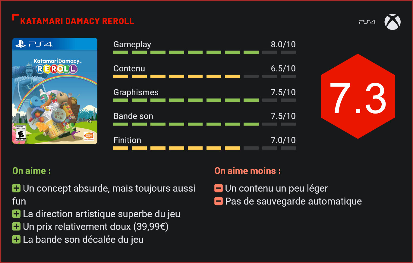 Près de deux ans après être sorti sur PC et Switch, le remake du tout premier Katamari Damacy a droit à une sortie sur PS4 et Xbox. L’occasion de redécouvrir l’un des plus gros O.V.N.I. du paysage vidéoludique. Rappelez-vous, en 2004 sortait sur PlayStation 2 un étrange jeu de réflexion baptisé Katamari Damacy, qui proposait au joueur d’incarner un curieux petit lutin baptisé « Prince du Cosmos », chargé par le seigneur de la galaxie de recréer les corps célestes disparus de la voie lactée. A l’époque, le jeu avait séduit les critiques par sa direction artistique si particulière, son concept accrocheur et son scénario totalement improbable. Le concept du jeu est simple : dans la peau d’une sorte de petit lutin qui dirige une petite boule de quelques centimètres, le joueur devra faire augmenter la taille de sa boulette en la faisant entrer en contact avec des objets de plus petite taille. Plus il y en aura autour, plus sa circonférence augmentera, et plus il sera possible de venir accrocher des objets de plus grande taille. On commence avec une boule de la taille d’une balle de baseball pour diriger dans les derniers niveaux du jeu une boule d’une taille gigantesque, sur laquelle viendront se greffer voitures, arbres, maisons et immeubles. Dans les premiers niveaux du jeu, la boulette que vous déplacez ne fait que quelques centimètres… Chaque niveau propose un objectif particulier qu’il faudra remplir : en l’occurrence faire augmenter la circonférence de sa boule de quelques centimètres ou mètres. Les débuts de partie sont lents, les fins de partie beaucoup plus rapides puisque votre boule grandira de façon exponentielle. Et mine de rien, il faudra faire preuve d’une certaine stratégie pour voir le bout en de l’aventure, la difficulté étant au rendez-vous dans chaque niveau. Chaque mission est chronométrée et il faudra donc faire preuve d’une bonne mémorisation des niveaux pour savoir où dans le niveau récupérer les objets qui vous permettront d’augmenter votre boule à chaque palier… Terriblement accrocheur, le concept gardera scotché à son pad même le plus blasé des joueurs. La bande sonore déjantée, l’univers coloré et la direction artistique inspirée du jeu n’y sont pas pour rien. Difficile de ne pas craquer pour un titre qui n’a rien perdu de son charme à travers les années. La direction artistique du jeu lui donne un certain cachet. Au pad, les contrôles se révèlent également beaucoup plus précis que sur Switch ou sur PC. Il ne faudra en revanche pas en attendre trop de l’optimisation, minimaliste pour les supports. Techniquement, ce n’est pas forcément très beau, mais la direction artistique unique de Katamari Damacy lui confère un charme certain. Ici, pas d’effets visuels spectaculaires ni de modélisations ultradétaillées. Le studio avait opté à l’époque pour un style animé très réussi qui donne au jeu l’allure d’un manga interactif. Si les décors sont minimalistes, ils regorgent d’éléments inertes et animés qui viendront progressivement faire grossir votre boule. Des pts de fleur, navires télécommandés, craves, tables, tabourets ou des petites souris qui tenteront de fuir leur cruelle destinée. La bande son n’est pas en reste avec des musiques complètement décalées qui collent parfaitement au style du jeu. Si ce remake est donc solide au niveau du contenu et de sa réalisation, on regrette toutefois que les développeurs n’aient pas ajouté quelques petites nouveautés et que certains mécanismes du jeu n’aient pas été améliorés. Pas de sauvegarde automatique par exemple, il faudra impérativement sauvegarder de façon manuelle entre chaque niveau… Pas de mode multijoueur en ligne malgré le support… Katamari Damacy propose bien un mode duel mais uniquement en local… Les cinématiques ont en revanche bien eu droit à une remise au goût du jour et l’affichage est passé à la haute définition. Le jeu devient particulièrement fun dans ses derniers niveaux… A 29,99€, l’offre est donc plutôt séduisante, même s’il est vrai que l’on fait plutôt vite le tour du jeu et qu’on aurait clairement pas été contre quelques petites nouveautés de plus – et notamment une optimisation sur les consoles next-gen au vu du timing. Katamari Damacy est un jeu très rafraîchissant qui peut potentiellement séduire tous les types de joueurs. A ce titre, il serait dommage de passer à côté de ce remake, qui a le mérite de brillamment remettre au goût du jour l’un des jeux les plus atypiques jamais créé. Il s’agit en tout cas de la meilleure option aujourd’hui pour découvrir cette franchise! Conclusion 16 ans après ses débuts, Katamari Damacy fait son grand retour avec un remake du tout premier épisode, qui était sorti à l’époque sur PlayStation 2. Débordant de créativité, le jeu de Namco Bandai est un véritable délice que les amateurs de jeux indé dégusteront sans modération. Avec sa direction artistique inspirée, son univers loufoque et son concept si particulier – qui consiste à créer la plus grosse boulette possible en brinqueballant son Katamari à travers toutes les pièces de la maison -, Katamari Damacy propose une expérience de jeu véritablement unique. Ce remake du jeu se contente d’une petite remise au goût du jeu sur le volet esthétique, sans grandes nouveautés au niveau du contenu. A 29,99€, la formule séduira toutefois tant les fans de la série que les nouveaux venus, qui découvriront l’un des titres les plus rafraichissants de ces deux dernières décennies.