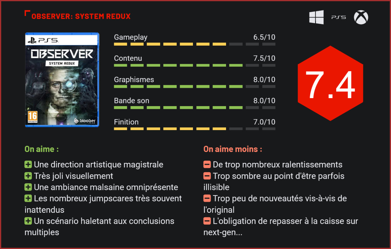 Remaster d’un jeu pourtant sorti il n’y a que trois ans, Observer: System Redux fait partie des titres qui accompagnent le lancement des consoles de nouvelle génération. Les jeux cyberpunk semblent avoir le vent en poupe ces dernières années, et particulièrement en 2020. Outre Cyberpunk 2077 qui se fait de plus en plus attendre et Ghostrunner, la bonne surprise de l’année, on retrouve un certain Observer, qui avait déjà fait parler de lui en 2017. Et pour cause, le titre, développé par le studio polonais Bloober Team était parvenu à convaincre grâce à une direction artistique très réussie, une ambiance globale très malsaine et des mécaniques de gameplay plutôt originales. Il faut dire qu’Observer possède un scénario qui a tout pour plaire. Le titre vous plonge directement en 2084 à Cracovie, en Pologne. Les êtres humains basculent petit à petit dans le transhumanisme, grâce notamment à un implant cybernétique qui les connecte directement au réseau. Malheureusement, Cracovie, en plus d’être crasseuse, humide, ultra-sécuritaire et liberticide, est rongée par une peste digitale. Résultante de guerres et de la prise grandissante de drogue, cette peste s’infiltre dans les implants de ses hôtes et crée un sentiment de peur omniprésent dans la ville polonaise. Vous prenez le contrôle de Dan Lazarski, un détective Observer qui, équipé de son “Mangeur de rêves”, doit résoudre des enquêtes en s’infiltrant dans les rêves des victimes. Des phases de gameplay très réussies et originales que nous détaillerons plus loin dans ce test. Si la voix et le visage de Dan ne vous sont pas inconnus, c’est pour un très bonne raison. En effet, l’acteur qui prête sa voix et ses traits au protagoniste n’est nul autre que Rutger Hauer, l’inoubliable androïde Roy Batty de Blade Runner. Un clin d’oeil qui n’est pas anodin, tant Observer s’inspire énormément de l’œuvre de Ridely Scott, elle-même tirée d’un roman de Philip K. Dick. Allié à ce scénario si plaisant, la direction artistique d’Observer est tout bonnement somptueuse. La ville de Cracovie transposée à cet univers cyberpunk si particulier est paradoxalement criante de réalisme. La terreur et le malaise ambiant qui planent sur la cité polonaise nous font nous interroger sur les dérives auxquelles peut mener le transhumanisme. En plus d’être très beau, Observer: System Redux profite du ray-tracing des consoles next-gen et des PC. La direction artistique est de plus grandement aidée par une amélioration visuelle importante. Là où le titre original était plutôt convaincant sans pour autant impressionner, le remaster est dans sa grande globalité très beau. Le titre affiche intégralement de la 4K, avec des textures et modèles améliorés, lissés et affinés. Le ray-tracing et le HDR font également leur apparition et apportent un vrai plus à l’ambiance générale du titre. Les reflets qu’apportent les nombreux néons et spots publicitaires dans les flaques d’eaux et vitres sont du plus bel effet. De plus, System Redux est entièrement proposé à 60 fps, ou c’est du moins ce qui était promis. Dans la pratique, le rendu final est plutôt inconstant et les pertes de fluidité sont beaucoup trop nombreuses, notamment sur les consoles next-gen. Si la fluidité est assurée dans les passages où il y a peu d’informations à l’écran ou à l’extérieur, le constat est beaucoup plus négatif une fois que l’on traverse certains passages très lumineux, vifs et remplis de détails. Les ralentissements sont très nombreux et viennent régulièrement impacter l’expérience de jeu, à tel point d’en être parfois désagréable. De plus, il apparaît dommage que le titre soit dans sa globalité beaucoup trop sombre. La majorité du jeu se déroulant de nuit, vous passerez une grande partie de votre temps de jeu à essayer de distinguer certains détails dans les scènes de crime et autres couloirs de bâtiments. Si l’on comprend l’intention des développeurs qui souhaitaient accentuer ce sentiment de ville “sombre”, il est dommage que cela empiète sur l’expérience de jeu. Même en réglant les paramètres de luminosité, il est impossible d’y voir plus clair. Difficile de savoir si cela est lié à l’arrivée du HDR ou à un choix délibéré des développeurs, mais il est certain que c’est un point qui empiète sur l’expérience générale. Les phases de gameplay ne bougent pour leur part pas d’un iota. Le jeu s’apparente à du walking simulator, mâtiné de quelques séquences plus musclées. Un genre qui peut parfois être ennuyant mais qui se prête délicieusement au style d’Observer. Les phases d’exploration ne sont jamais trop ennuyeuses tant les décors sont suffisamment variés. Il est possible d’interagir avec une grande partie des objets de votre environnement, notamment grâce à vos deux visions qui permettent de plus facilement décrypter les scènes de crime. Vous devrez vous servir de différentes visions pour résoudre les quelques énigmes qui se présentent à vous. Observer profite toutefois des fonctionnalités qu’apporte la Dualsense sur PS5 pour offrir une autre dimension de jeu. Ainsi, lorsque vous interagirez avec une porte, les gâchettes se feront plus résistantes si la porte est verrouillée ou non. Déplacer une bibliothèque apportera également une certaine résistance dans la touche R2, qui est ainsi la touche d’interaction. Les retours haptiques de la manette sont pour leur part du plus bel effet. A certains moments, votre personnage sera empreint par une profonde poussée de stress, et cela se ressentira dans la manette. Les nombreuses phases d’infiltration dans les rêves des victimes sont également aidée par ces vibrations, avec un impact plus prononcé des jumpscares qui apparaissent à l’écran. Ces phases très particulières au sein des souvenirs des témoins et vi