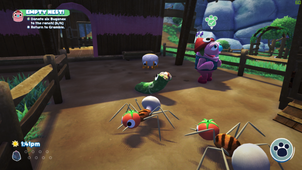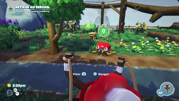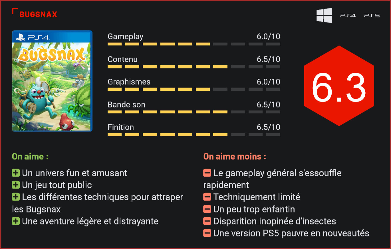 Offert avec l’abonnement PlayStation Plus, Bugsnax débarque comme un OVNI sur l’ancienne et nouvelle génération de consoles Sony – ainsi que sur PC. Développé par Young Horses (Octodad : Dadliest Catch), le jeu se veut avant tout enfantin et amusant, mais une chose est sûre, il ne plaira pas à tout le monde. À la croisée d’un Pokémon pour son côté découverte et collection des « Bugsnax », des créatures à mi-chemin entre un en-cas et un insecte, et d’un jeu d’aventure et d’exploration, Bugsnax intrigue depuis son annonce. N’espérez toutefois pas vous embarquer dans une aventure épique, Bugsnax n’a rien de tout cela. Le titre de Young Horses nous pousse à enquêter sur la disparition d’une exploratrice du nom d’Élisabeth Megafig, expatriée sur l’île de Snaxburg où se trouvent les fameux Bugsnax. Invité par cette dernière, le joueur incarne un reporter qui se rendra sur l’île pour découvrir les Bugsnax – contraction de bugs (insectes, en anglais) et snacks – et enquêter sur la disparition de l’exploratrice. Sur place, il fera la rencontre des locaux, tous plus étranges les uns que les autres, mais tout aussi attachants. Le ton y est particulièrement léger – voire un peu trop – de même que l’aspect enquête de l’aventure, avec un petit côté moralisateur parfois ennuyeux. Une chose est sûre, Bugsnax a été développé pour un public jeune. Ce jeu d’aventure coloré et amusant pourrait être une bonne entrée en matière dans les jeux vidéo pour les petites têtes blondes, mais aussi pour découvrir la PS5, après avoir terminé Astro’s Playroom évidemment. Difficile en revanche de le conseiller aux adultes tant le ton est jeune. La capture et collecte des Bugsnax sera centrale dans l’aventure. L’aventure sera double puisque le joueur devra enquêter sur la disparition de l’exploratrice Lizbert, de convaincre les locaux – Grumpus – de revenir en ville, mais surtout de collectionner les Bugsnax. Les insectes-encas seront en effet au cœur du jeu puisque la plupart des missions que devra réaliser le joueur pour les habitants de l’île consisteront à attraper des Bugsnax pour qu’ils soient dévorés. D’ailleurs, on a été quelque peu surpris de voir que les mignons petits mets qui se baladent sur l’île sont destinés à être mangés par les habitants. Un sort funeste qui contraste radicalement avec le ton du jeu… Les quêtes annexes manquent parfois d’intérêt. Au-delà de remplir l’estomac des Grumpux, le joueur devra également compléter sa collection de Bugsnax en explorant l’île à la recherche de bestioles. Il pourra compter sur son scanner « Snaxoscope » pour les détecter et les identifier, à la manière du Pokédex. Les adeptes de Pokémon ou des collections pourraient y trouver leur compte, mais au final, on se lasse assez vite, même si les méthodes pour les capturer varient de temps à autre. Il faudra parfois se remuer les méninges pour élaborer un plan, comprendre comment fonctionnent les différents gadgets pour mettre la main sur des Bugsnax, mais là encore, ça reste très accessible – surtout qu’ils suivent toujours le même chemin et que ce dernier est indiqué… On regrette cependant que le jeu souffre d’un manque de précision. Enfin, encore faut-il que les bestioles ne disparaissent pas tout simplement. On a en effet eu la mauvaise surprise de voir que l’un des insectes que l’on devait attraper avait tout bonnement disparu – éjecté par un autre burger sur pattes. Fort heureusement, le jeu propose également des phases d’énigmes et d’enquêtes qui amènent un peu de substance au gameplay. En tant que journaliste, le joueur devra en effet poser des questions aux habitants de l’île – en plus de réaliser pour eux des missions –, collecter des témoignages et recouper les informations pour comprendre ce qui est arrivé à Elizabeth Megafig. Discuter avec les habitants aura donc une place importante dans le jeu, tant pour les missions et la collection des bestioles que pour glaner des informations sur Lizbert. On regrette cependant la simplicité du système de réponses à choix multiples. Sélectionner telle ou telle réponse n’aura d’ailleurs que peu – voire aucune – influence. La direction artistique du jeu ne plaira clairement pas à tous. Les personnages sont doublés – uniquement en anglais – par des comédiens enthousiastes. Le résultat est plutôt sympathique, mais on regrette malgré tout que certains jeux de mots ne fonctionnent pas toujours très bien en français (« crapple », la contraction de crab et apple en anglais, devient carapomme en français). Le titre fait également quelques références à la culture web, mais ces dernières passeront sous le nez de pas mal de joueurs, notamment les plus jeunes. Certains pourraient donc passer à côté de la sphère humoristique du jeu – même si les doubleurs et personnages en général développent une ambiance plutôt sympathique. Enfin, Bugsnax a tout de même le mérite de proposer des idées sympathiques, ne serait-ce que les insectes-encas, et développe également son propre univers artistique. Les combinaisons d’insectes et de mets sont parfois un peu loufoques, mais souvent bien pensées. Mention spéciale aux burgers sur pattes fous de ketchup dont les bouteilles poussent dans les arbres. L’identité visuelle et le sens du détail à ce niveau sont sans doute la plus grande qualité du jeu. On pourrait tout de même regretter que les différents biomes de l’île manquent d’originalité, mais on se plait tout de même à les explorer. Techniquement parlant, le jeu est loin d’être parfait. Certaines animations manquent en effet de fluidité, les décors de détails et de texture et dans l’ensemble, le jeu ne fait clairement pas très next-gen. Il est d’ailleurs disponible aussi sur PS4, pour ceux qui pensaient qu’il s’agissait un