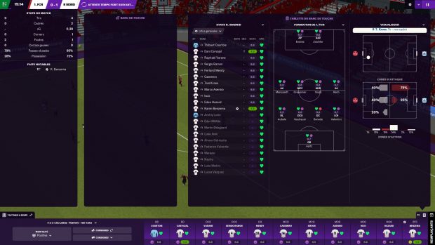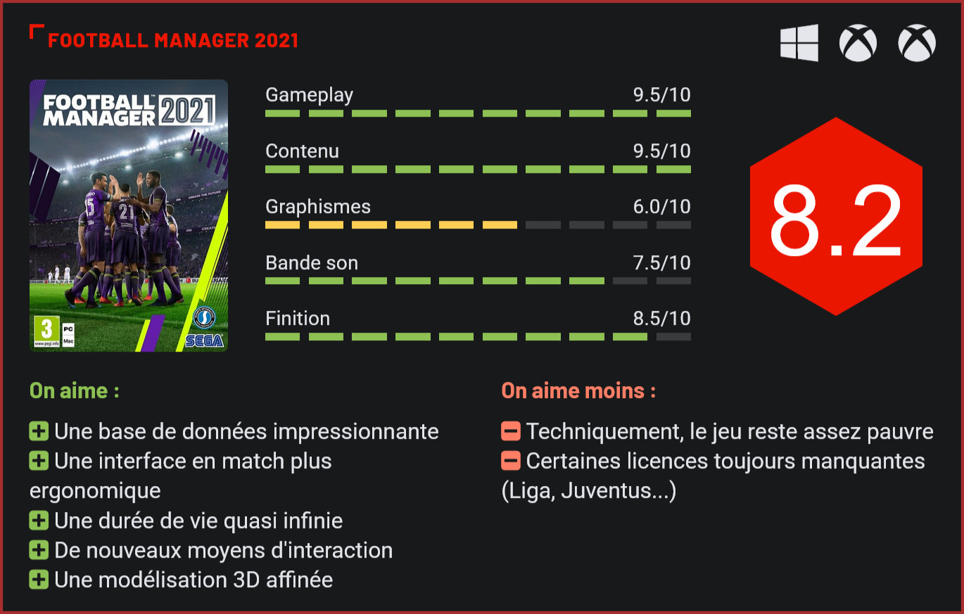 Le mois de novembre signe chaque année le retour de la franchise Football Manager. Si la licence semble depuis quelques opus avoir atteint l’excellence, elle parvient tout de même à apporter chaque année une nouvelle expérience. Est-ce le cas avec cet épisode 2021 ? Qui dit fin d’année dit sortie des habituelles licences footballistiques sur PC et consoles. Outre un FIFA 21 décevant en bien des points et un PES 2021 sorti sous forme d’extension de son prédécesseur, les fans de foot peuvent compter sur la licence Football Manager. Après un excellent FM 2019 et un cru 2020 tombé à point nommé durant le premier confinement, la célèbre franchise de Sega compte poursuivre sur sa lancée avec un cru 2021 à la hauteur de ses aînés. On ne va pas faire durer le suspens plus longtemps : ce nouvel épisode est évidemment très réussi, malgré une stagnation visuelle. Ne nous voilons pas la face, les saisons 2019-2020 et 2020-2021 auront été considérablement marquées par la pandémie de coronavirus. Entre des championnats tout simplement annulés ou interrompus, des matchs à huis clos et des réductions drastiques de salaire pour les joueurs et le staff, le monde du football aura été significativement chamboulé. Football Manager étant une licence de simulation pure et dure, les développeurs ne pouvaient pas passer à côté de cette actualité. Ainsi, le début de votre première saison se verra directement impacté par les conséquences de l’épidémie. Des conséquences importantes qui impactent l’expérience que vous procureront vos premières heures sur ce FM 2021. On mentionnera ainsi des coupes budgétaires importantes pour l’ensemble des clubs, un calendrier européen plus tardif et la règle des cinq remplacements qui vient quant à elle alléger la charge de travail sur l’effectif. N’espérez pourtant pas d’autres changements, la révolution s’arrête là. Il n’est donc nullement question de former sa tactique en fonction des résultats au test PCR des joueurs ou d’assister à des matchs à huit-clos dans les stades. L’intégration du covid au sein de la licence est donc faite à moitié et aurait par exemple pu avoir un impact plus significatif sur votre saison. Les conférences d’avant et d’après match, les causeries et interviews ont été revues afin de mettre la gestuelle au cœur de l’interaction. Là où les précédents épisodes apportaient d’importantes nouveautés à même de transformer votre carrière, cet opus 2021 préfère consolider ses bases, tout en modernisant certains acquis. Ne vous attendez donc pas à un épisode révolutionnaire, mais plutôt à celui de la confirmation et des changements assez mineurs. S’il y a bien un point sur lequel la franchise stagnait avec des interactions peu réalistes et très mécanisées, c’était dans les interviews, causeries et réunions. Autrefois, vous deviez choisir une phrase pour communiquer ainsi que le ton sur lequel cette phrase serait “prononcée”. Cela avait alors une incidence sur la réaction de vos interlocuteurs qui pouvaient dès lors bien réagir ou au contraire mal prendre vos déclarations. Désormais, la gestuelle et les mimiques sont au cœur des dialogues. Lors d’une conférence de presse, vous devrez toujours répondre aux questions des journalistes, mais il vous sera toutefois demandé d’adopter une gestuelle plus prononcée, avec comme résultat un retour positif ou négatif de la part des agents de presse. Vos mimiques prendront également une place prépondérante lors des causeries d’avant et d’après match et des réunions avec les joueurs. Vous pourrez tendre les bras et applaudir vos joueurs s’ils font un bon match tout en restant solides en défense, mais pourrez également balancer une bouteille d’eau afin d’exprimer votre mécontentement et tenter de réveiller vos hommes. Il sera toutefois nécessaire de choisir ses réactions avec parcimonie, au risque de déstabiliser vos joueurs. L’interface en match a été entièrement repensée. L’interface des matchs a quant elle été profondément revue. Les statistiques et la forme du onze titulaire apparaissent désormais en bas de l’écran et il est possible d’interagir avec chaque joueur individuellement durant le match. Il est par exemple à nouveau possible de motiver un joueur en particulier et plus seulement toute l’équipe. Lorsqu’il n’y aura pas de temps fort, l’écran de présentation se voit également transformer, avec un affichage des informations en trois colonnes : les stats du match, le banc de touche (à savoir les recommandations du staff) et les informations sur les deux équipes. Plus de clarté donc, pour un accès plus rapide aux informations prioritaires. Les matchs prennent d’ailleurs une toute autre dimension grâce à l’introduction des expected goals, ou xG en jeu. Il s’agit d’une statistique basée sur un algorithme et qui serait capable d’évaluer la capacité offensive d’une équipe. Des calculs internes au soft qui seraient trop compliqués à décrire, mais qui permettent toutefois de connaître les points faibles de son équipe et d’ainsi trouver une solution pour y remédier. Plus le chiffre annoncé est proche de 1, plus le but est probable, tandis que les chances de marquer s’amenuisent si on s’en éloigne. Le contenu a pour sa part toujours été le point fort de la franchise de Sports Interactive et le reste dans cette édition 2021. La base de données est toujours aussi gigantesque et il est toujours possible de recruter une jeune pépite nigérienne ou japonaise parmi les multiples championnats déjà présents. Les sélections nationales sont évidemment de la partie, avec notamment l’ajout des sélections argentines, mexicaines et canadiennes. On ne pourra en revanche que regretter l’absence de nombreuses licences, comme c’est le cas depuis quelques années désormais. La Juventus, dont les
