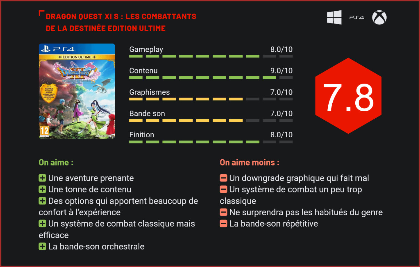 L’un des meilleurs JRPG de ces dernières années revient en force sur console et PC dans une édition ultime proposant le jeu original accompagné des ajouts de la version Switch sortie l’année dernière. L’occasion pour les gens n’ayant pas encore craqué de sauter le pas. Né en 1986 des mains du studio Enix et plus particulièrement de Yuji Hori, Dragon Quest est aujourd’hui une série culte pour les habitants du pays du soleil-levant. La saga fut à l’origine de la popularisation du jeu de rôle au tour par tour sur console et inspira plus d’un titre par la suite. À l’aube des 35 ans de la série, l’éditeur nous propose une nouvelle fois le 11ème épisode de Dragon Quest. D’abord sorti au japon en 2017 sur Playstation 4 et Nintendo 3DS, “Dragon Quest XI: Les Combattants de la destinée” a débarqué chez nous en 2018 sur la console de Sony ainsi que sur PC. C’est un an plus tard qu’une nouvelle version du titre, à savoir “Dragon Quest XI S: Edition ultime” est arrivé en exclusivité sur Nintendo Switch. Une édition comprenant de nombreux ajouts. Cette même version ultime débarque en ce mois de décembre sur Playstation 4, Xbox One et PC. Le mode photo permet de mettre en valeur les jolis décors du jeu. Dragon Quest XI conte l’histoire d’un jeune homme vivant dans un petit village de campagne partant pour la grande ville de Héliodor pour apporter une nouvelle réjouissante au roi. Notre protagoniste est en réalité la réincarnation de l’éclairé, un héros ayant sauvé le monde par le passé. Il se fait mystérieusement arrêter par le roi et est jeté en prison, puis s’enfuit grâce à l’aide d’un voleur nommé Erik. Les deux fugitifs vont alors partir en quête de réponses. Ceux-ci seront rejoints par un casting de personnages hauts en couleurs. Des personnages qui sont par ailleurs toujours désignés par Akira Toriyama, le papa de Dragon Ball. Dragon Quest XI reste un titre plutôt classique et old-school. Son système de combat au tour par tour ne révolutionne en rien la formule mais l’applique très efficacement. Chaque personnage jouable possède ses propres techniques à débloquer dans un arbre de compétence à plusieurs voies. La nouveauté de ce système de combat repose sur “l’état hypertonique”, un effet appliqué sur un personnage qui se déclenche en combat sous certaines conditions cachées. Tant qu’un personnage est dans cet état, il est plus fort et plus résistant, et il peut également utiliser des capacités ultimes. Avoir plusieurs personnages en état hypertonique permet d’avoir accès à d’autres capacités ultimes qu’ils effectuent à plusieurs. Malgré son côté old-school, Dragon Quest XI reste accessible. La difficulté de l’aventure ne devrait pas vous poser beaucoup de problèmes et le titre possède de nombreuses aides et astuces pour ne pas perdre le joueur. Le système de combat est peut-être un peu trop classique. Le principal défaut du titre vient sans doute de son aspect technique qui laisse parfois à désirer. Si la direction artistique est une réussite, il faut savoir que ces nouvelles versions de Dragon Quest XI S sont basées sur la version Switch, qui elle, est techniquement en deçà des versions originales. Cette nouvelle édition ultime est techniquement plus aboutie que la version Switch mais conserve un peu le downgrade visuel qu’elle a subi, faisant de cette édition ultime une version moins belle que l’originale. Pour autant, ce n’est pas horrible à regarder, mais le titre n’est pas aussi éclatant qu’il ne l’était en 2018. On peut y constater beaucoup d’aliasing ainsi que de nombreux effets de lumières moins prononcés, donnant un rendu moins propre et moins coloré. Si son scénario reste dans la simplicité et que la structure du jeu est linéaire, Dragon Quest XI offre tout de même un vrai sentiment d’aventure. Parcourir le monde d’Elréa devrait vous prendre une soixantaine d’heures avant d’en voir le bout, et au moins une centaine pour faire complètement le tour du jeu. À ce titre au contenu déjà bien fourni viennent s’ajouter de nombreuses nouveautés. L’une des nouveautés de cette version ultime permet de jouer en 2D. Cette nouvelle version ultime embarque donc avec elle les ajouts de la version Switch. Parmi ceux-ci, la possibilité de suivre le jeu avec un doublage en japonais ainsi qu’une bande-son symphonique. Il s’agit là d’un plus non négligeable puisque le jeu original ne possédait qu’une version synthétisée de la bande-son. Les morceaux gagnent énormément à être joués par un orchestre. Même si elles sont de meilleure qualité, les musiques restent cependant répétitives tout au long du jeu. L’édition ultime propose également du tout nouveau contenu scénarisé centré sur nos personnages principaux. De tout nouveaux paramètres de difficultés sont disponibles permettant par exemple de lancer une nouvelle partie sans pouvoir acheter quoi que ce soit, sans pouvoir porter d’armures et bien d’autres idées originales comme donner la possibilité aux habitants des villes de mentir et ainsi de vous donner de fausses informations. Beaucoup d’autres petits ajouts rendent l’expérience encore plus agréable qu’avant avec l’implémentation d’un mode photo ainsi que des options pour accélérer la vitesse du jeu. Mais la plus grosse nouveauté, c’est sans doute le mode rétro permettant de jouer à l’entièreté du jeu en 2D avec des graphismes proches des épisodes 16-bits. Ce mode renferme des zones inédites et permet d’accéder aux mondes des précédents jeux Dragon Quest, un bonus bien sympathique pour les fans de la série. Conclusion Le dernier opus de cette série légendaire qu’est Dragon Quest revient dans une version comprenant le jeu original ainsi que les ajouts de sa réédition sur Nintendo Switch. Dragon Quest XIS est un RPG au tour par tour très cl