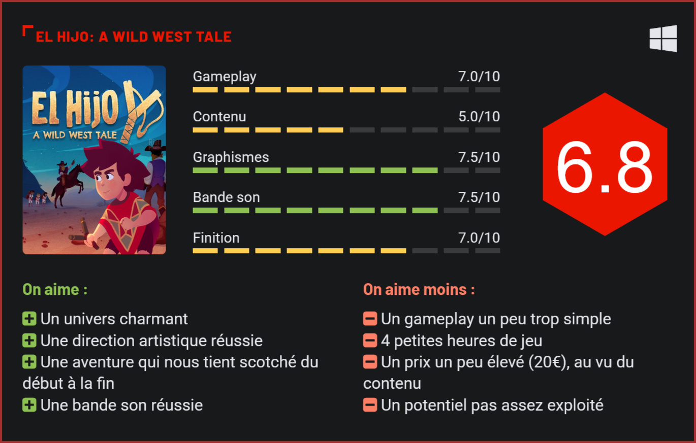 Si les joueurs consoles devront attendre avant de mettre la main sur ce titre, c’est en ce début de mois de décembre que débarque cette nouvelle production des développeurs Quantumfrog et Honig Studios. Se déroulant dans un univers de western, El Hijo: A Wild West Tale raconte l’histoire d’un jeune garçon de 6 ans et de sa mère dont la maison est incendiée par des bandits. Craignant le pire, la mère laisse alors son enfant dans un monastère isolé pour le protéger. L’enfant, “El Hijo”, décide de s’échapper et de retrouver sa mère par la simple force de son agilité, de sa discrétion et de sa ruse. D’un univers pourtant connu pour son animosité en résulte un jeu d’infiltration non-violent. Le but est d’amener le petit garçon à la fin des niveaux sans se faire attraper. Sa petite taille lui permet de se faufiler dans de nombreuses cachettes mais il possède également des accessoires pour l’aider. Son lance-pierre permet de casser certains objets, des jouets peuvent être utilisés pour attirer l’attention des gardes… Nous avons également un oiseau à notre disposition qui, une fois envolé, nous permet d’accroître notre champ de vision, de voir celui des gardes mais également de mettre en valeur les objets avec lesquels nous pouvons interagir. Il faut utiliser le décor à bon escient pour échapper aux ennemis. Le jeu reste radicalement élémentaire dans son approche de l’infiltration. Il est simplement question ici d’éviter les personnages qui vous font obstacle en se réfugiant dans l’ombre et en utilisant le décors et vos accessoires de manière efficace. Quelques énigmes viennent pimenter le tout mais le titre reste accessible et ne propose qu’une seule difficulté qui n’est pas très élevée. Même s’ils ne sont pas très différents les uns des autres, les ennemis sont tout de même progressivement plus difficiles à éviter. Les moines du monastère doivent nous courir après pour nous attraper, ce qui nous laisse l’occasion de leur échapper, mais les ennemis suivants sont armés, ce qui forcera notre personnage à se rendre dès qu’il se fait repérer. Les chiens que l’on rencontrera plus tard dans l’aventure seront encore plus complexes à éviter. Malgré tout, de nombreux checkpoints sont dispersés dans les niveaux, nos échecs ne sont donc pas du tout punitifs. Des enfants à sauver sont disséminés dans les niveaux. Cette aventure s’avère assez courte et prend environ quatre heures à boucler lors d’une première découverte. Les niveaux sont tout de même parsemés de collectables sous forme d’enfants esclaves à retrouver, ceux-ci sont alors inspirés par votre envie de liberté. Cette aventure principale est le seul et unique contenu disponible dans le jeu, ce qui s’avère être un peu court pour le prix demandé. Ces quatre heures sont pourtant bien suffisantes pour parcourir le titre et sa proposition trop simpliste. Les possibilités du joueur ne sont malheureusement pas très nombreuses et les niveaux restent assez linéaires. L’aventure propose parfois des phases de jeu un peu différentes. Nous aurons, par exemple, l’occasion à plusieurs reprises d’incarner la mère d’el hijo, plus robuste et plus rapide que son fils. Ces moments se jouent un peu différemment, ce qui amène de la variété à l’ensemble. Mais ce n’est pas suffisant puisque le concept du jeu tourne très vite en rond. Demander de l’aide à notre oiseau permet de mettre en valeur les objets avec lesquels nous pouvons interagir. El Hijo est pourtant visuellement très charmant. Le titre arbore un style graphique simple et mignon, un mélange très efficace. Les décors sont détaillés, colorés et lisibles. L’ambiance des niveaux reste plus ou moins la même au fil du jeu, alternant entre les décors orangés du désert et un bleu sombre pour les intérieurs et souterrains. Sa bande-son vient encore plus appuyer le trait “western” du titre. Si les musiques sont souvent discrètes, elles accompagnent parfaitement les phases de jeu relativement calmes. De nombreux bruitages et clips vocaux donnent de l’identité aux personnages que vous devez éviter. Le jeu utilise également des cinématiques animées du plus bel effet pour raconter son histoire. Si son ambiance est réussie et que l’aventure est satisfaisante, El Hijo laisse cependant un sentiment de “trop peu” tant son gameplay et son concept aurait pu être poussé plus loin. Le jeu ne laisse que peu de place à votre inventivité pour échapper aux différents ennemis, la faute à un level design un peu trop dirigiste. Le peu de rejouabilité qu’il propose n’enlève pas le goût amer du tarif auquel il est proposé. Conclusion El Hijo: A Wild West Tale est un jeu d’infiltration non-violent prenant place dans un univers western qu’il arrive très bien à s’approprier. Avec sa direction artistique réussie, une très bonne présentation et un sound design efficace, El Hijo se présente comme un divertissement parfaitement maîtrisé de bout en bout. L’aventure nous plonge dans la peau d’un petit garçon de 6 ans devant traverser de nombreux endroits pour retrouver sa mère. Celle-ci l’ayant laissé dans un monastère pour le protéger de bandits ayant incendié leur maison. “el hijo” devra alors redoubler d’attention pour éviter de se faire remarquer en utilisant ingénieusement les décors et les jouets qu’il porte sur lui. Le gameplay est efficace mais reste malheureusement trop simpliste, et les niveaux dirigistes ne laissent que peu de liberté. L’aventure se boucle en quatre petites heures à peine, et s’il n’est pas déplaisant à parcourir, la formule peine tout de même à se renouveler.