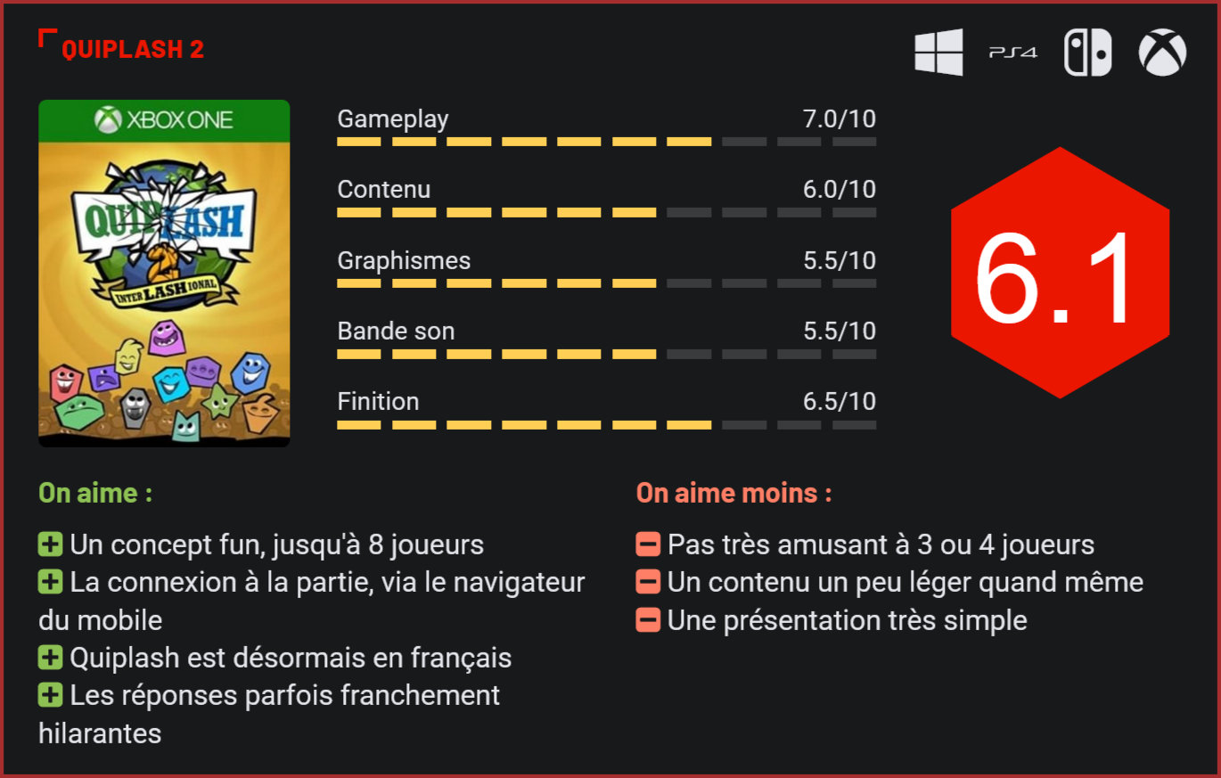 Succès inattendu, le premier Quiplash était parvenu à s’imposer comme un incontournable pour les soirées entre amis devant la télé. L’absence de localisation française lui avait toutefois fortement porté préjudice sous nos latitudes. Sa suite entendait bien corriger ce vilain défaut… Avec son concept atypique – compléter des phrases ou répondre à des questions avec des réponses les plus loufoques possibles -, Quiplash s’est très vite imposé comme l’un des meilleurs jeux multijoueurs pour animer une soirée entre amis. Sa suite, qui était déjà proposée dans la compilation Jackbox Party 3, est désormais également disponible au format stand-alone avec en prime une localisation française. A vous de voter pour la réponse la plus drôle! Le concept reste le même que dans le premier volet, et le contenu est lui aussi pratiquement identique. En quelques mots, Quiplash qui se joue de 3 à 8 joueurs (de préférence de 5 à 8), dans lequel les participants devront compléter une phrase ou répondre à une question en tentant d’être les plus drôles possibles. L’originalité vient du fait que les réponses sont encodées via le smartphone. Chaque joueur doit se connecter à la partie en se connectant au site de l’éditeur via le navigateur de son mobile et en utilisant un code d’accès unique. C’est facile d’accès et dans l’ensemble très bien fichu. Sur son mobile, le joueur tapote ensuite sa réponse avant de valider. Une fois toutes les réponses entrées, le joueur peut ensuite voter pour les propositions des autres joueurs. A la fin de chaque round, chacun recevra un certain nombre de points qui définiront sa place au classement général. Laissez libre cours à votre imagination! Les parties ne durent généralement pas plus de 10 minutes top chrono. Et malheureusement, il n’est toujours pas possible de customiser le fonctionnement du jeu pour étendre les parties à plus de rounds ou choisir le type de question posée. Le concept est fun, mais le contenu est relativement limité. La VF ne comprend en effet que 100 messages-guides. Rien ne vous empêche toutefois d’explorer les catalogues de questions-messages en anglais, en italien, en espagnol ou en allemand! On regrettera toutefois très clairement que l’éditeur ne se soit guère foulé au niveau du contenu puisqu’il s’agit d’un copié-collé du titre de la compilation Jackbox. Pas une question de plus n’a été ajoutée, ni un nouveau mode de jeu d’ailleurs. Du multijoueur en ligne aurait pourtant eu tout son sens par ces temps de pandémie… Reste qu’à 9,99€, la facture n’est pas trop salée. Ceux qui cherchent un titre rigolo pour s’amuser avec leurs amis tout en se détendant tiennent là une jolie alternative aux jeux de société traditionnels. Le concept est franchement fendard et il ne sera pas rare d’éclater de rire avec ses amis au cours d’une partie. Côté présentation, le jeu reste toutefois très sobre, avec une interface stylisée et quelques jolis effets visuels. Cela ne l’empêche toutefois pas de manquer de personnalité et de piquant. Clairement, Quiplash 2 n’est pas du niveau d’un Scene It par exemple. Conclusion Vous cherchez un jeu amusant pour animer vos soirées entre amis? Quiplash 2 est la parfaite alternative aux jeux de société traditionnels. Avec son concept rigolo, le jeu de Jackbox Games fait mouche à chaque partie, pour peu que le nombre de participants dépasse les 4 ou 5 joueurs. La créativité des participants sera mise à rude épreuve à travers une succession de défis dans lesquels il faudra proposer différentes réponses ou suggestions pour compléter une phrase, de la façon la plus drôle possible. La proposition la plus drôle se verra logiquement attribuer le plus grand nombre de points par les autres participants. Les parties sont courtes (moins de 10 minutes) mais plutôt funs. Le contenu est en revanche assez léger avec seulement une centaine de questions-messages en français. Rassurez-vous toutefois, cela sera largement suffisant pour animer quelques soirées… Quiplash 2 est typiquement le genre de jeu que l’on ne sort qu’une fois que l’on a des amis de passage à la maison. C’est d’ailleurs de 5 à 8 joueurs que la formule fonctionne le mieux.