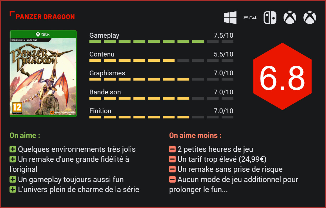 Shoot them up emblématique de l’époque de la Sega Saturn, Panzer Dragoon a enfin droit à son remake. Et c’est au petit studio polonais MegaPixel que le travail a été confié… Sorti en 1995 sur Saturn, Panzer Dragoon n’aura pas connu le succès escompté. Ce shoot them up méconnu du catalogue de l’éditeur nippon a pourtant eu droit à plusieurs suites. Le dernier épisode en date, Panzer Dragoon Orta, était sorti en exclusivité sur Xbox en 2002. Les chances de voir débarquer un jour un nouveau volet étaient maigres. Sega a toutefois surpris ses fans en permettant à plusieurs studios indépendants de réexplorer ses franchises cultes. C’est ainsi qu’avait pu voir le jour l’excellent Streets of Rage 4 en début d’année. Le titre avait été confié à un petit studio indé français. Pour Panzer Dragoon, c’est le studio polonais MegaPixel qui a pris en main le projet. Ce remake se révèle dans l’ensemble d’une grande fidélité au jeu d’origine. Les Polonais de MegaPixel ont choisi de rester très fidèle au matériau de base en se contentant simplement de moderniser les graphismes du jeu et sa prise en main. Il ne faut donc pas s’attendre à une refonte complète de tous les aspects du jeu, ce qui n’est en soi pas forcément une mauvaise chose pour les fans. D’un point de vue technique, le jeu a eu droit à une jolie refonte graphique avec des environnements en 3D, des modèles entièrement revus et de très jolis effets spéciaux. Le rendu est dans l’ensemble plutôt séduisant, même si tous les environnements ne sont pas du même niveau. On pourra également clairement reprocher au jeu un certain manque de finition avec pas mal de petits bugs graphiques – notamment, des créatures qui passent à travers des pans des décors. Rien de très grave en soi, mais on sent que les développeurs n’ont pas eu le temps de tout finaliser. Le gameplay a également droit à quelques petites retouches avec la prise en charge du double-stick sur les consoles, qui offre tout de même beaucoup plus de précision qu’à l’époque. Panzer Dragoon reste un shoot them up très accessible, dans lequel le joueur se déplace sur un rail. On peut diriger le dragon de gauche à droite de l’écran et de haut en bas, mais on ne gère pas sa direction à proprement parler. Les déplacements à l’écran sont principalement utilisés pour éviter les tirs des ennemis qui apparaissent aux quatre coins de l’écran. Le joueur peut bien entendu riposter à l’aide de son blaster, par petits coups ou par salves en “lockant” une série d’ennemis. L’originalité du titre vient qu’il faudra garder un oeil en permanence sur le radar car dans Panzer Dragoon, les menaces peuvent venir de tous les côtés et il faudra régulièrement regarder autour de soi pour canarder les ennemis venant de tous les côtés. Les combats de boss sont aussi de la partie, avec des patterns à étudier. Le jeu est malheureusement très court : comptez moins d’une heure pour votre premier run. C’est simple, mais terriblement fun. Ce remake de Panzer Dragoon conserve tous les éléments qui ont contribué au succès de la série et ces vibes délicieusement 90’s. C’est un shoot them up arcade très accessible qui plaira tant aux amateurs du genre qu’au grand public. Alors oui, bien sûr, nous pourrons lui reprocher sa courte durée de vie. Comptez 1h max pour venir à bout des 7 niveaux qui composent la campagne. On y reviendra pour un second voire un troisième run, mais guère plus compte tenu de l’absence de scoring ou des modes de jeu alternatifs. Très clairement, c’est à ce niveau que le bas blesse. La replay value du jeu est faible et les développeurs n’ont pas pris la peine d’apporter plus de nouveautés. A 24,99€, l’addition est donc relativement salée pour un remake qui est pourtant très plaisant. Le vrai problème vient de la tarification trop élevée. Ceci étant dit, que son contenu un peu léger ne vous refroidisse pas. Ce remake de Panzer Dragoon remet brillamment au goût du jour un classique du shoot them up, plein de charme avec son univers de dark fantasy, sa bande sonore très riche et sa superbe direction artistique. Difficile de ne pas tomber sous son charme. Il faudra absolument maîtriser le “lock automatique” des ennemis pour venir à bout du jeu. La véritable erreur du studio polonais, ce sera finalement d’avoir voulu développer ce remake du premier volet séparément du second épisode. Vu leur maigre durée de vie, une compilation des deux opus aurait eu beaucoup plus de sens. Reste que si vous êtes fans du genre, difficile de passer à côté de cet excellent titre, qui est également l’un des très rares représentants du shoot them up 3D encore en vie. Les fans y trouveront certainement leur bonheur. Pour les autres, mieux vaut patienter une jolie promotion pour craquer car très clairement, vous n’y passerez sans doute pas plus de quelques heures. Conclusion Avare en contenu, ce remake de Panzer Dragoon n’en reste pas moins très fidèle au matériau de base et remet brillamment au goût du jour un classique du shoot them up. Plus accessible que les autres jeux du genre, Panzer Dragoon brille par le charme de son univers, sa bande sonore séduisante et le fun qui se dégage des affrontements. Les combats contre les boss sont intenses et nécessitent de la part du joueur de bons réflexes. L’aventure reste toutefois de courte durée. Comptez une petite heure de jeu pour en voir le bout. La rejouabilité est également assez légère, vu l’absence de mode de jeu alternatif. Très clairement, le jeu aurait dû être tarifé moins cher. A 24,99€, cela fait quand même très cher les deux heures de jeu. Les fans du genre ne cracheront toutefois pas sur ce joli divertissement, qui à défaut de nous en mettre plein les yeux et de nous tenir scotché au pad durant des heures, a le mérite d’être fun à par