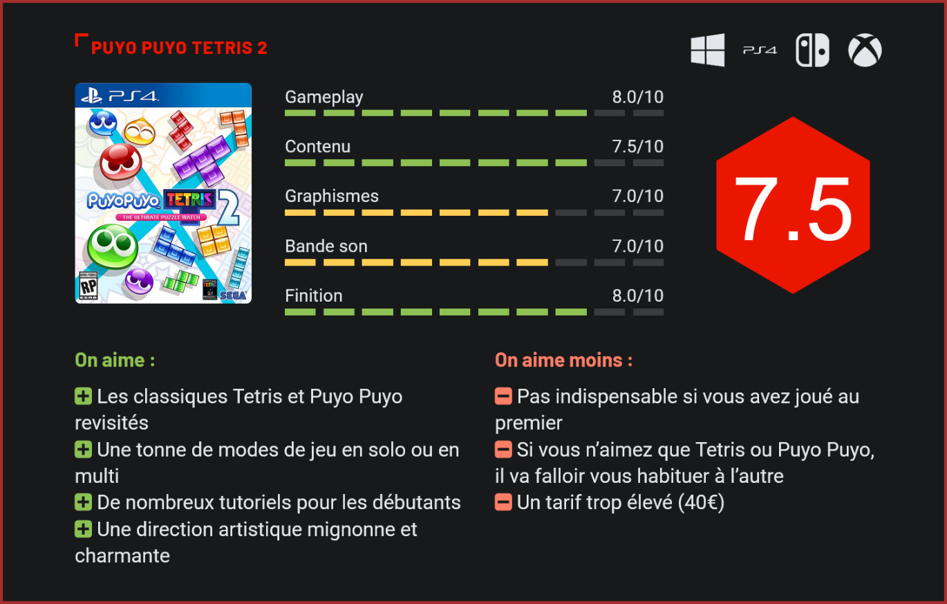 Annoncé il y a à peine quelques mois, Puyo Puyo Tetris 2 débarque sur consoles et PC et propose une nouvelle fois de mélanger les deux jeux de puzzle cultes. Tetris et Puyo Puyo sont deux puzzle game ayant marqué l’histoire du jeu vidéo. Si le premier est un jeu aujourd’hui mondialement connu, le second est surtout un phénomène japonais qui a cependant refait surface ces dernières années en occident. Édité et développé par SEGA, Puyo Puyo Tetris propose alors de mélanger les deux titres dans tout un tas de modes de jeu. Ce deuxième épisode reste proche de l’original en proposant quelques nouveautés. Les deux jeux de puzzle ont de nombreux points en commun et sont les bases du gameplay de ce titre. Tetris est un jeu où le but du joueur est d’aligner les blocs qui tombent du haut de l’écran. Ces “Tetrominos” aux formes variées peuvent être pivotés dans tous les sens pour permettre de s’emboîter correctement avec les autres. Remplir une ligne complètement la fait disparaître et octroie des points. Quant à Puyo Puyo, il s’agit d’un titre où le but sera d’empiler les slimes qui tombent par groupe de deux. Coller quatre “Puyos” de la même couleur ensemble les fera disparaître et fera tomber ceux qui sont au-dessus. Le but est alors de créer des combos en empilant les Puyos correctement. Dans les deux cas, si les éléments empilés atteignent le haut de l’écran, c’est game over. Plus le score grimpe, plus les Tetrominos ou Puyos tombent vite, demandant aux joueurs de réfléchir rapidement et d’anticiper. Chaque joueur peut choisir s’il préfère jouer à Tetris ou à Puyo Puyo. Il faut noter que Puyo Puyo Tetris 2 permet de se lancer dans une partie classique des deux jeux dès l’écran titre, mais il propose aussi beaucoup de modes de jeu différents, permettant de varier l’expérience. Une pelletée de modes de jeux en solo et en multijoueurs (local et en ligne) sont disponibles ici. Un mode “Versus” classique, un mode “Combats de talents” qui possède quelques petits éléments de RPG. Il s’agit d’un mode qui requiert de créer une équipe de trois personnages possédant diverses compétences à utiliser durant les parties. On retrouve également le mode “échange” qui demande d’alterner entre Tetris et Puyo Puyo en pleine partie, un mode “Groupe” permettant de jouer avec des bonus et malus à activer, (ceux-ci peuvent altérer la vue de l’adversaire ou encore empêcher toute rotation des Puyos ou Tetrominos), et bien d’autres encore. Le plus gros mode de jeu reste tout de même le mode “Aventure”, un scénario mettant en scène de nombreux personnages issus de mondes différents, l’un où les protagonistes ne connaissent que Puyo Puyo et l’autre où ils n’ont d’yeux que pour Tetris. Ces personnages vont s’allier pour empêcher les deux mondes de fusionner définitivement. Une histoire qui ne se prend pas au sérieux et qui est un bon prétexte pour jouer aux deux puzzle game dans différentes configurations contre des intelligences artificielles. Ce mode permet également de débloquer tout un tas de petits bonus pour, par exemple, customiser votre profil de joueur. Le mode Aventure prendra un moment à compléter. Si vous n’êtes pas familiers avec les deux titres, Puyo Puyo Tetris 2 embarque avec lui tout un tas de didacticiels pour apprendre efficacement à appréhender les jeux. Des vidéos sont disponibles pour en apprendre les bases ainsi que des techniques avancées et des défis vous permettront de mettre tout cela en pratique. Ces leçons sont primordiales pour saisir toute la subtilité des casse-têtes et également pour progresser correctement dans le jeu. En effet, ce deuxième opus se révèle assez exigeant pour les non-initiés malgré son côté mignon et coloré. La direction artistique du titre ne change pas depuis le premier jeu, les visuels sont chatoyants et les personnages arborent un style “animés japonais” très mignon. Les parties sont appuyées et dynamisées avec de nombreuses animations et clips vocaux des personnages que vous et vos adversaires ont choisis avant le match. Les musiques sont également très sympathiques et énergiques pour nous mettre correctement dans l’ambiance. Il est possible de visionner des rediffusions de match d’autres joueurs pour s’inspirer de leurs techniques. Avec sa tonne de contenu, faire correctement le tour du jeu prendra un bon moment, à condition bien sûr d’adhérer à Tetris et à Puyo Puyo. La majorité des modes permettent de choisir entre les deux gameplay mais il sera tout de même nécessaire de jongler entre les deux, notamment dans le mode Aventure qui nous force à alterner. Cependant, la diversité apportée par les nombreux modes de jeux permet d’atténuer le côté répétitif de ces deux puzzle games. Certains modes sont plus complexes que d’autres faisant de ce Puyo Puyo Tetris 2 à la fois un jeu accessible ainsi qu’un titre qui demandera de s’investir pour le maîtriser. C’est malheureusement regrettable de voir qu’il n’y a que peu de nouveautés dans cette nouvelle itération de ce crossover. Conclusion Puyo Puyo Tetris 2 fusionne astucieusement les deux puzzle game cultes que sont Tetris et Puyo Puyo à travers une compilation généreuse en contenus. Proposant de nombreux modes de jeux variés ainsi qu’un mode Aventure scénarisé plutôt long, le titre permet de redécouvrir ces jeux de puzzle de différentes manières, avec des règles qui varient d’un mode à l’autre. Il ne faut pas forcément s’attendre à de grosses surprises, mais la formule n’en reste pas moins globalement très efficace. Visuellement, Puyo Puyo Tetris 2 est également très joli, habillant les parties avec son univers mignon et coloré ainsi qu’avec des musiques entraînantes. Derrière cette direction artistique se cache tout de même un jeu exigeant qui n’hésite pas à montrer 