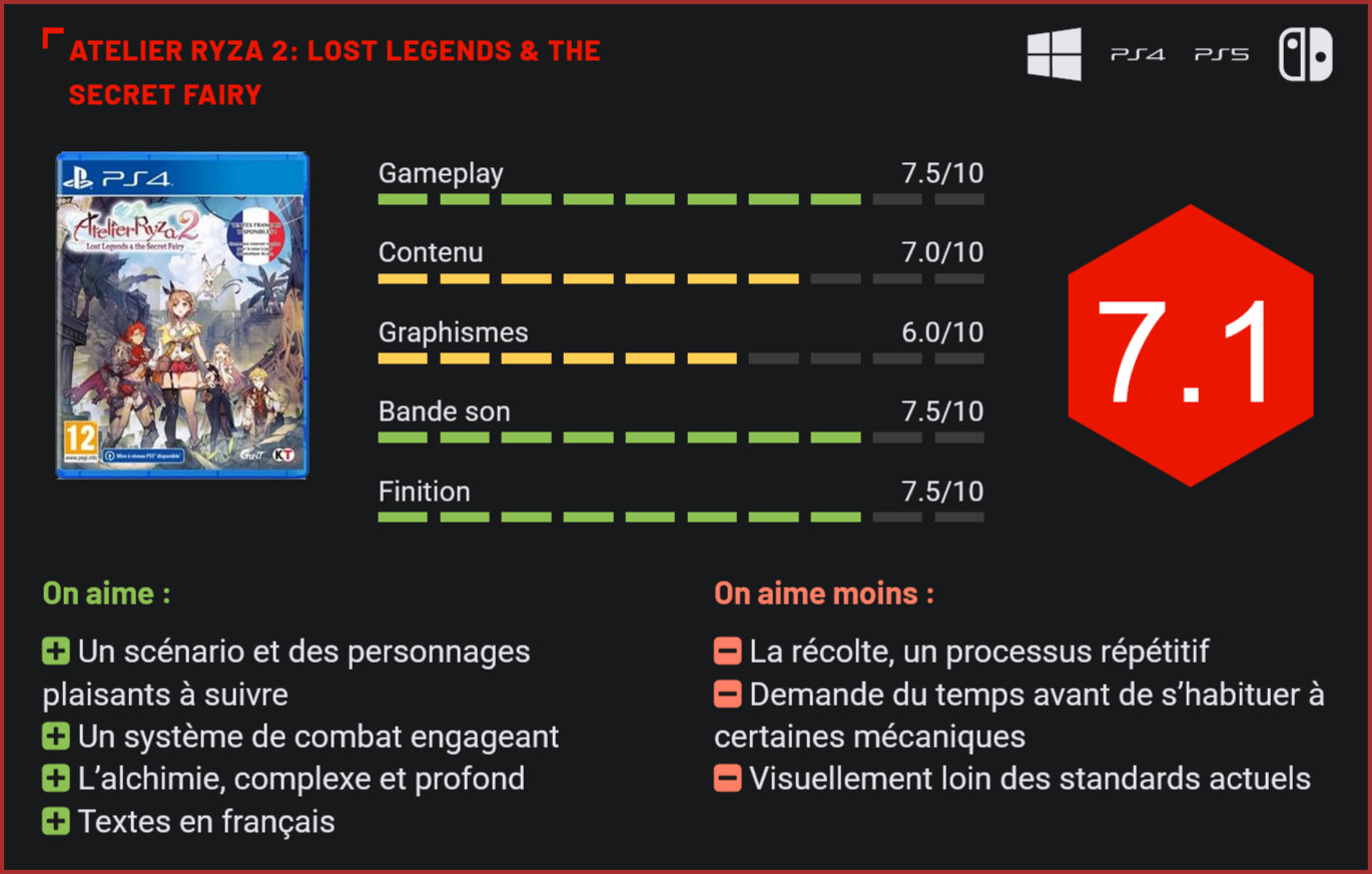 La série annuelle du studio Gust revient cette fois avec une suite directe au dernier jeu. Ce nouvel “Atelier” centré sur Ryza prend la suite de l’épisode le plus populaire jamais confectionné par le studio japonais. Sorti en 2019, Atelier Ryza: Ever Darkness & the Secret Hideout a su se faire remarquer des fans de JRPG. Avec pourtant plus de 20 ans de titres à son actif, cette série de niche n’a jamais fait grand bruit, et encore moins en occident. Cet épisode en particulier à pourtant eu un succès plus retentissant, une performance toujours modeste mais qui permet à cette petite série de prendre de l’importance dans le monde entier. Et c’est sans doute pour surfer sur cette vague que Gust proposera dès le 29 janvier une suite directe à ce titre. Atelier Ryza 2: Lost Legends & the Secret Fairy prend place trois ans après les événements du premier jeu. Nous retrouvons Reisalin Stout, une alchimiste qui va se rendre à la capitale royale d’Ashra-am pour étudier des ruines se trouvant aux alentours ainsi que pour percer le mystère d’un étrange joyau trouvé sur son île natale. L’occasion de recroiser les personnages du premier jeu qui se joindront à nous, ainsi que de nouveaux personnages hauts en couleurs. Un scénario sympathique qui n’hésite pas à prendre son temps et à nous montrer de nombreuses interactions entre les différents protagonistes. Si ce n’est pas nécessaire pour suivre l’aventure, avoir joué au premier jeu est plutôt récompensé par l’évolution des personnages déjà présents auparavant. Les zones explorables sont vastes et remplies de points de collecte. Au contrôle de Ryza, notre objectif est d’explorer les zones aux alentours de la ville pour faire progresser le scénario mais également d’obtenir tout un tas d’objets, que ce soit en combattant des monstres ou encore en les trouvant sur les nombreux points de collecte dans ces mêmes zones. Les endroits que nous sommes amenés à explorer sont plus grands et plus verticaux que jamais grâce aux nouvelles capacités de Ryza. Celle-ci peut désormais nager, grimper aux lierres ou encore utiliser un grappin sur certaines prises, permettant une topographie plus variée. Tous ces objets amassés permettent de pratiquer l’alchimie, une mécanique centrale de la série Atelier. Ce nouvel épisode reprend presque à l’identique le système d’alchimie du précédent. Avec la recette en notre possession, il est possible d’utiliser les matériaux trouvés lors de l’exploration pour confectionner un tout nouvel objet encore plus intéressant. De l’équipement, des objets utilisables en combat ou encore des matériaux permettant de créer d’autres objets plus complexes sont obtenables par ce biais. L’alchimie a donc beaucoup d’importance dans la progression, et maîtriser ce système sera nécessaire malgré sa complexité. Parce que l’alchimie s’avère un peu compliquée et demandera un petit temps d’adaptation de la part du joueur. De nombreux paramètres sont à prendre en compte lorsque l’on crée un objet et de plus en plus de possibilités s’ajoutent au fil du jeu. Même si ce n’est pas toujours important de prendre tout cela en compte (et qu’un mode automatique existe, permettant de crafter plus simplement), le système se révèle être assez profond et très bénéfique aux joueurs qui sauront en tirer parti. L’alchimie a une importance toute particulière dans la progression. Le système de combat se révèle, lui aussi, très convaincant, dynamique et tactique. Reprenant une bonne partie des mécaniques installées dans le précédent jeu, celui-ci se voit cependant redynamisé en demandant au joueur d’être encore plus actif. Le système est un hybride entre du tour par tour et du temps réel. Nous contrôlons un personnage parmi trois membres actifs, chacun possédant leurs styles et attaques différentes. Votre tour vous permet d’attaquer ou d’utiliser des objets. Chaque attaque rapporte un point d’action pouvant être dépensé par les membres de l’équipe dans des skills, des attaques plus puissantes aux propriétés variées. Il est également possible de défendre, permettant de gagner des points d’actions si la commande est utilisée au bon moment. Les “Action Order” sont également une mécanique primordiale. Les autres personnages vous demandent souvent de réaliser des actions spécifiques en combat. Atteindre l’objectif permettra à ce personnage de lancer une attaque très puissante. Il est donc important de se coordonner avec les autres membres du groupe pour être efficace et maximiser les dégâts. L’aventure ne sera pas forcément très corsée mais demandera tout de même une bonne compréhension des mécaniques de combat. Le gameplay est plus dynamique que jamais dans la série. Comme les autres jeux de la série, Atelier Ryza à tous les symptômes d’un titre “petit budget”. La technique laisse à désirer, les textures datées et autres problèmes d’aliasing se font ressentir, et le nombre limité d’animations pour les personnages impacte la mise en scène des cinématiques. Les décors ne sont pourtant pas désagréables à regarder, mais c’est surtout grâce à la direction artistique très efficace du titre. Il faut également souligner la mise en scène des combats très soignés et qui rajoute beaucoup au dynamisme de ceux-ci. Chose rare dans la série, les textes du jeu sont proposés en français, tandis que le jeu est entièrement doublé en japonais. La bande-son est de très bonne facture, composée en grande partie de musiques énergiques et enjouées. Une ambiance musicale qui colle parfaitement au ton général et aux aventures de Ryza. Si les différents aspects qui composent le jeu sont très efficaces, il faut garder à l’esprit que le titre ne plaira pas à tous les joueurs. Certaines mécaniques de ce Atelier Ryza 2 demandent un peu d’investissement et