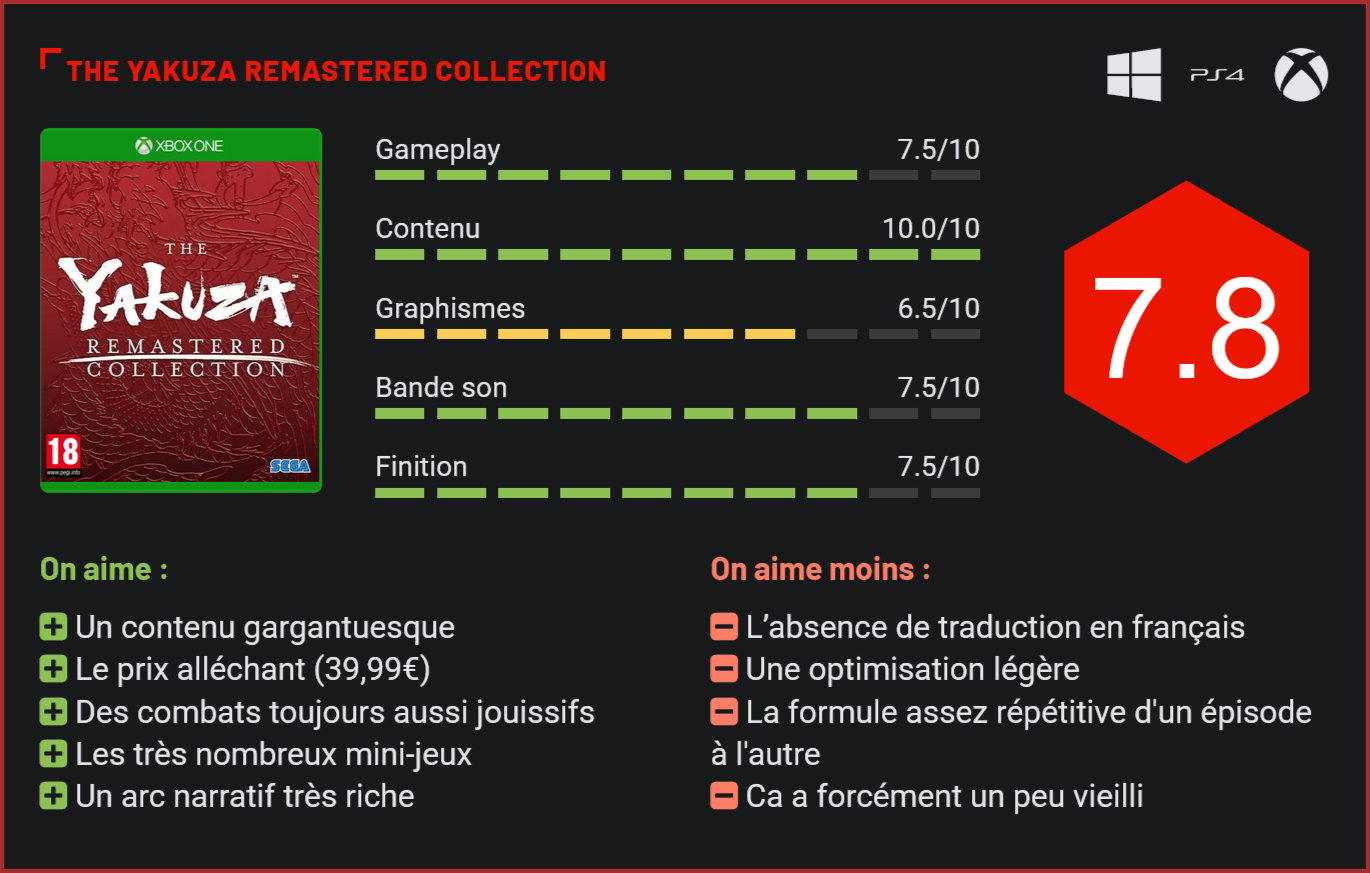 Yakuza a longtemps parmi les exclus third-party de la PlayStation. La série culte de Sega a toutefois finalement fini par atterrir sur PC et sur Xbox. Après avoir porté les épisodes 1, 2 et 0, Sega nous livre le reste de la collection dans une compilation qui rassemble les épisodes 3, 4 et 5. Les joueurs Xbox ne devront plus envier les joueurs PlayStation. La collection Yakuza est désormais presque complète sur Xbox One. Avec la Yakuza Remastered Collection, Sega ajoute les épisodes 3, 4 et 5 de la série au catalogue de la console de Microsoft. L’épisode 6 suivra. De façon assez surprenante, Sega a en effet choisi de ne pas intégrer “The Song of Life” à cette compilation pour faire durer un peu plus le suspens. Mais cette Remastered Collection mérite-t-elle le coup d’œil? Au vu du prix, très clairement. Sega nous livre une compilation riche en contenus à un tarif défiant toute concurrence : 39,99€ pour 3 jeux complets, à la longévité déjà exemplaire. Ceci étant dit, il est certain que si vous étiez déjà fan de la série, vous possédiez déjà sans doute ces volets sur PS4. L’arrivée tardive de cette compilation sur Xbox servira de simple séance de rattrapage pour ceux qui n’avaient jamais joué à un épisode de la série. Yakuza 3 ose dépayser avec des décors radicalement différents de ceux qu’on a l’habitude de voir dans la série. S’ils s’inscrivent dans la continuité des deux premiers opus, les épisodes 3, 4 et 5 de la série ne sont pas forcément les mieux notés. De façon générale, les épisodes 3 et 4 font même partie des moins populaires auprès des fans. Yakuza 3 était un très bon épisode en son temps mais il est celui qui a le plus mal vieilli. Logique, puisque les deux premiers volets ont eu droit à des remakes (les épisodes Kiwami) et qu’il date tout de même de 2009! L’aventure n’en reste pas moins intéressante puisque l’on retrouve Kiryu au casting de ce volet, qui ose apporter un peu de fraicheur à la série avec des décors dépaysantes, des mini-jeux décontractés et un scénario qui part un peu dans tous les sens. Yakuza 4 se démarquait quant à lui par son casting, avec enfin du sang neuf et de nouveaux protagonistes. La recette ne change pas ici, mais la narration est beaucoup moins soignée et globalement moins intéressante avec une histoire liée à une tentative d’assassinat dans les années 80 qui vient hanter les yakuzas du présent… Yakua 4 est l’épisode le plus décrié de la série, sur le plan narratif, mais il n’en reste pas moins un très bon jeu. Les mini-jeux sont toujours présents et offrent une belle diversité. Yakuza 5 avait quant à lui marqué un tournant dans la franchise avec son nouveau moteur graphique, cinq personnages jouables, des décors plus vastes que dans les précédents volets et un scénario qui finissait brillamment l’arc narratif débuté avec le premier Yakuza. S’il s’agissait d’une réussite à presque tous les niveaux, Yakuza 5 avait toutefois été vivement critiqué pour son gameplay, qui n’avait pas vraiment subi de mutation depuis les débuts de la série et avait très mal vieilli. En soi, ce n’est pas très gênant si vous découvrez la série aujourd’hui, mais oui, par rapport à un Yakuza 6 on sent la différence. Alors, incontournable? Certainement si vous aviez entamé l’arc narratif au premier volet et que vous ne vous êtes pas lassé de la formule. Le contenu gargantuesque de cette compilation, la perspective de connaître enfin le fin mot de cette belle histoire, les séquences de combat toujours aussi nerveuses et les nombreux mini-jeux rigolos sont autant de bonnes raisons de s’y replonger. Mais si vous n’avez pas encore finis les épisodes Kiwami 1 & 2, nous ne pouvons que trop vous conseiller d’attendre de voir si vous vous lasserez ou non de la formule. Car il faut bien l’avouer, en six épisodes, la série ne s’est pas beaucoup renouvelée, tant dans son gameplay que dans son univers. Les combats restent d’une grande intensité. Inutile d’espérer s’y plonger en revanche si vous n’avez pas parcouru les précédents volets de la série… Il risque en effet d’être très difficile d’y comprendre quelque chose si vous avez raté les précédents volets. On regrettera d’ailleurs que si les deux premiers épisodes ont eu droit à des remakes complets, il faudra se contenter ici de simples remasters. Yakuza 5 n’a pas trop mal vieilli, mais les épisodes 3 et 4 ont à l’inverse pris quelques rides… Sega compense ces quelques errances avec un prix attractif. Reste que dans la pratique, ce portage très tardif sur Xbox manque d’audace. Il ne faudra pas espérer de doublages en français ni d’optimisation pour les consoles de nouvelle génération. Reste que si tous les épisodes ne vous intéressent pas, il reste possible des les acheter séparément au prix unitaire de 19,99€. C’est forcément un peu moins intéressant, mais ça permettra toutefois à ceux qui ne sont pas sûr de faire tous les épisodes à la suite l’un de l’autre de ne pas prendre un très gros risque… Conclusion Avec The Yakuza Remastered Collection, les joueurs PC et Xbox pourront enfin découvrir la fin de l’arc narratif débuté avec le tout premier volet de la série. La sortie tardive de cette compilation sur ces deux supports joue clairement en sa défaveur. Toutefois, pour les joueurs qui seraient passés à côté de cette série parce qu’ils ne possédaient pas de PS3 ou de PS4 à l’époque, la Remastered Collection permettra de jouer les séances de rattrapage. Des trois épisodes qui nous sont ici proposés, le 4ème volet est sans doute le moins intéressant avec son scénario qui part un peu dans tous les sens. Yakuza 3 a également mal vieilli. Logique, il s’agit de 2009. Yakuza 5 en revanche, s’en sort plutôt bien et se présente surtout comme une conclusion épique à l’ar