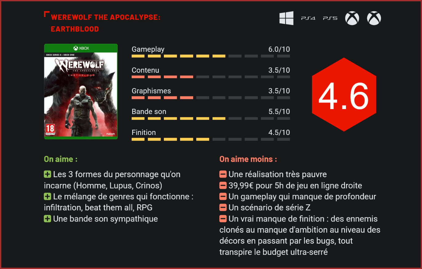 Nouvelle production du petit studio français Cyanide (Styx, Blood Bowl), Werewolf The Apocalypse: Earthblood faisait partie de ces petits jeux dont on ne savait pas quoi penser. Très séduisant sur le papier, le concept du jeu a toutefois beaucoup de mal à convaincre dans la pratique… Qui n’a jamais rêvé d’incarner un jour un loup-garou dans un jeu vidéo? Il faut bien l’avouer, les jeux qui nous proposent d’incarner des bêtes sanguinaires sont rares. La proposition du studio français Cyanide était donc très prometteuse sur le papier. D’autant plus que les développeurs de Styx avaient annoncé très tôt que leur jeu serait un mélange de genre, empruntant des éléments aux jeux de rôle, jeux d’infiltration et aux beat them all old-school. Werewolf The Apocalypse: Earthblood est toutefois, comme nous allons le voir, loin d’être une claque magistrale… Les combats sont intenses et souvent très sanglants. Côté scénario tout d’abord, on a affaire ici à une véritable série Z. Dans Earthblood, le joueur incarne un combattant lycan qui va devoir les forces d’une corporation baptisée Endron, qui exploite le Wyrm, une entité maléfique qui vise à détruire l’esprit de la terre. L’écologie est le thème principal du jeu. Pas de voyage au XIXème siècle ici ni de décors dépaysants, tout se déroule à l’époque contemporaine. L’intrigue se limitera dans son ensemble à la guerre d’un clan lycan contre la multinationale. Un récit qui n’est guère captivant ni habilement mis en scène… L’approche a d’ailleurs de quoi surprendre, dans la mesure où l’univers fantastique ouvrait justement tellement de portes à explorer… Mais de toutes ces possibilités, le studio français a choisi un message écologiste sans aucune profondeur. Surprenant. L’autre grosse erreur des développeurs, c’est d’avoir voulu en faire trop avec trop peu de moyens… Werewolf se veut un mélange de plusieurs genres. Il s’agit principalement d’un beat them all, dans lequel vous multiplierez les combats au corps à corps, mais le jeu propose également des séquences d’infiltration et emprunte plusieurs éléments aux action-RPG avec des choix de dialogues et un arbre de compétences. Sur le papier, le concept était très séduisant. Dans la pratique, si le mélange fonctionne, certaines séquences de jeu séduisent moins que d’autres. L’aspect RPG passe par exemple complètement au second plan. Les choix de dialogues n’ont aucun impact sur le récit et les évolutions ne transcendent pas le gameplay. Il est d’ailleurs même possible de finir le jeu sans en appliquer une seule… Les séquences d’infiltration étaient une bonne idée mais l’IA médiocre des ennemis et le level-design du jeu très simple font qu’en définitive, on préfère souvent l’approche frontale. On notera d’ailleurs que de façon assez amusante notre héros est un guerrier qui peut utiliser de petites fléchettes pour mettre K.O. ses adversaires mais n’utilisera pas une seule fois une arme à feu… sans qu’aucun élément n’explique ce choix. Les modélisations des personnages restent dans l’ensemble très sommaires. En définitive, ce sont donc les séquences de combat qui restent les plus réussies. Elles sont certes répétitives, mais la diversité des ennemis oblige le joueur à varier les attaques et à alterner entre les différentes formes du personnage. Notre héros à deux formes de lycan. Dans l’une, il se déplace très rapidement mais ses attaques sont faibles et il est moins résistant. Avec l’autre, il est capable d’encaisser les coups et de frapper plus fort, mais sa vitesse est réduite. Pour remporter les combats, le joueur devra alterner entre les deux formes et prêter attention aux types d’adversaires qu’il affronte : des snipers à l’infanterie lourde en passant par la bidasse ou le guerrier capable d’asséner d’importants dégâts au corps à corps, tout le succès repose sur l’approche du champ de bataille. C’est un fait toutefois, le gameplay manque clairement de profondeur. Il n’y a pas assez de combos ni d’attaques spéciales. Les combats de boss, qui se réduisent la plupart du temps à du matraquage de boutons, nous le rappelle à chaque fin de chapitre. Si la partie infiltration déçoit, certains éléments du gameplay donnent à Earthblood un certain charme. Par exemple, le fait que notre personnage soit capable de changer de forme à volonté, en passant d’un humain qui passera inaperçu dans certains environnements et se la jouera plus infiltration dans les niveaux à un loup, qui sera capable de se déplacer plus rapidement, telle une ombre, et de ramper à travers des tunnels. La forme de lycan, elle, n’est utilisée que pour le combat. Les phases d’infiltration sont sympathiques mais souvent très creuses. Malgré quelques très bonnes idées, Werewolf The Apocalypse a donc du mal à séduire. Son scénario nanaresque, ses personnages sans charisme, ses décors pauvres et très linéaires et sa durée de vie rikiki ne l’aident pas non plus, il faut le reconnaître. En ligne droite, le jeu se termine en cinq petites heures. Il y a peu d’à-côtés et la rejouabilité est très faible. N’espérez pas non plus découvrir un mode coop ou du multijoueur. A 39,99€, l’addition est donc salée. D’autant plus que techniquement, c’est loin d’être le nirvana. Les décors du jeu sont pauvres, les personnages ressemblent tous à des clones à l’exception du héros, les bugs sont nombreux et la direction artistique globale du jeu n’impressionne pas vraiment. On sent que le jeu a souffert d’un budget très serré. La finition est d’ailleurs franchement désastreuse sur next-gen avec des bugs très nombreux sur Series X, des effets visuels timides et presqu’aucune feature inédite. Reste une bande son sympathique – mais pas de doublages en VF et quelques jolis bugs sono