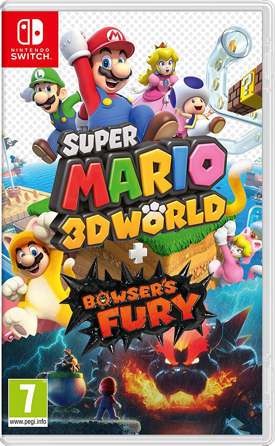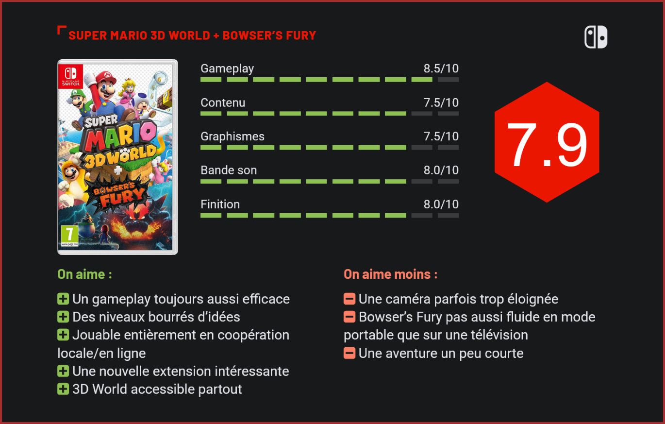 Le jeu de plate-forme 3D phare de la WiiU revient sur la Nintendo Switch, embarquant du contenu inédit avec lui. Super Mario 3D World + Bowser’s Fury est un nouveau portage signé Nintendo. La Switch dépouille encore et toujours la WiiU de ses exclusivités. Après Pikmin 3 et The Wonderful 101 l’année dernière, c’est au tour de Super Mario 3D World d’être réédité sur la console hybride de Nintendo. Le titre ne vient pas seul puisqu’il est accompagné de quelques retouches ainsi que de “Bowser’s Fury”, une extension inédite chamboulant un peu la formule du jeu original. Super Mario 3D World est un jeu de plate-forme en 3D sorti originellement en 2013. Celui-ci reprend la formule déjà installée par Super Mario 3D Land, l’épisode 3DS de 2011, mais en l’adaptant pour un grand écran. Le jeu démarre alors que Bowser emprisonne les sept princesses du royaume des Libellas. Mario, Luigi, Peach et Toad partent alors dans ce royaume pour les libérer. Un scénario qui n’est qu’un prétexte à se lancer dans cette aventure tant il est oubliable et peu mis en avant. Le cœur du jeu se situe plutôt dans son gameplay. Super Mario 3D World reprend une formule aux niveaux plus linéaires que les autres Mario 3D. Cet épisode reprend la structure traditionnelle des jeux Mario. Nous parcourons plusieurs mondes dans lesquels se trouvent un peu moins de dix niveaux. Des niveaux linéaires dans lesquels se cachent des collectables, à savoir trois étoiles vertes et, bien souvent, un tampon. A l’époque utilisables sur le Miiverse, le réseau social de la WiiU, les tampons sont aujourd’hui mis à profit dans le tout nouveau mode photo. Si les niveaux sont souvent courts, ils n’en sont pas moins fun. Le level design est une vraie réussite tant il est intelligent et débordant d’idées. Il prend d’ailleurs bien avantage des nombreuses transformations disponibles, tel que le costume de chat qui va parfois être nécessaire pour trouver tous les collectables. Les niveaux accompagnent merveilleusement bien la prise en main tout aussi efficace du titre. Seule ombre au tableau, les stages sont présentés avec une caméra fixe. Si ce n’est pas un problème en soi, cela nuit parfois à la lisibilité et à notre perception de la profondeur. Un problème encore amplifié lorsqu’on y joue en mode portable puisque l’écran y est forcément plus petit. Les quatre personnages cités plus haut sont jouables. Chacun d’entre eux ont des petites particularités puisque, par exemple, Luigi saute plus haut, ou encore Peach peut flotter quelques instants. De quoi permettre également de jouer en coopération, l’entièreté de l’aventure peut se jouer à maximum quatre joueurs. Petite nouveauté, il est possible cette fois de jouer en coopération en ligne. D’autres mini-jeux apportent de la diversité à l’ensemble, en particulier les niveaux de Captain Toad, des petits casse-têtes jouant sur la perspective. Super Mario 3D World offre alors une aventure très complète, quoiqu’un peu courte puisqu’il faut environ 6h pour en voir le bout. Le jeu réserve tout de même du contenu après la fin et cela prendra de nombreuses heures pour obtenir tous les collectables. La durée de vie se voit également renforcée par le tout nouveau contenu proposé dans cette édition : le mode Bowser’s Fury. Le nouveau mode photo est accessible à n’importe quel moment. Disponible dès le lancement du jeu, Bowser’s Fury est une extension indépendante du jeu original. Mario est aspiré dans le royaume des chats dans lequel Bowser est devenu géant et fou de rage. Il va falloir calmer la bête à l’aide de son fils, Bowser Jr (qui servira de deuxième joueur), en trouvant des astres félins, l’équivalent des étoiles dans cette extension. Bowser’s Fury se présente comme un monde ouvert parsemé de petits niveaux explorables à notre guise. Chacun de ces petits niveaux contient plusieurs astres félins obtenables en résolvant différents objectifs. Bowser se réveille régulièrement dans sa forme géante, augmentant la difficulté et la pression puisque son arrivée provoquera le chaos en faisant pleuvoir des boules de feu par exemple. Pour le calmer temporairement, il faut trouver un astre ou alors le combattre directement en utilisant la Super Clochette géante, transformant Mario dans sa forme de chat et le rendant géant par la même occasion. Le principe fait beaucoup plus penser à Super Mario Odyssey qu’à Super Mario 3D World. Bowser’s Fury se base pourtant bien sur le gameplay de 3D World, celui-ci offrant moins d’options de mouvements que dans son successeur Odyssey. L’aventure n’en reste pas moins agréable et prendra environ trois heures avant d’être complétée, trouver tous les astres demandera cependant quelques heures de plus. Bowser’s Fury propose un monde ouvert plutôt vaste. Que ce soit pour Super Mario 3D World ou pour Bowser’s Fury, l’ensemble bénéficie d’une présentation très solide. C’était à l’époque le tout premier jeu de plate-forme 3D de la licence Mario à franchir le cap de la HD, la transition s’est faite sans soucis. Le jeu est toujours très agréable à regarder malgré quelques petits soucis d’aliasing et de distance d’affichage pour le monde ouvert de Bowser’s Fury. La bande-son est également très bonne, possédant tout un tas de morceaux originaux et mémorables. Comme à l’époque, le titre affiche une fluidité irréprochable à l’exception de Bowser’s Fury qui tourne un peu moins bien en mode portable uniquement. Conclusion Un autre titre de la WiiU rejoint le catalogue de la Nintendo Switch. Super Mario 3D World signe son retour accompagné de quelques ajouts ainsi que d’une extension nommée “Bowser’s Fury”. Le jeu original reste sensiblement le même, un jeu de plate-forme en 3D au gameplay et au level design très efficace et rempli d’idées toutes plus intéres