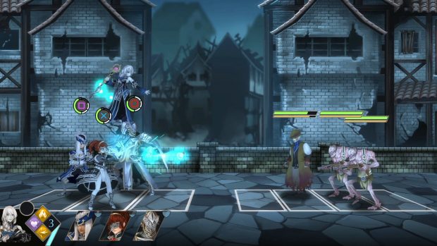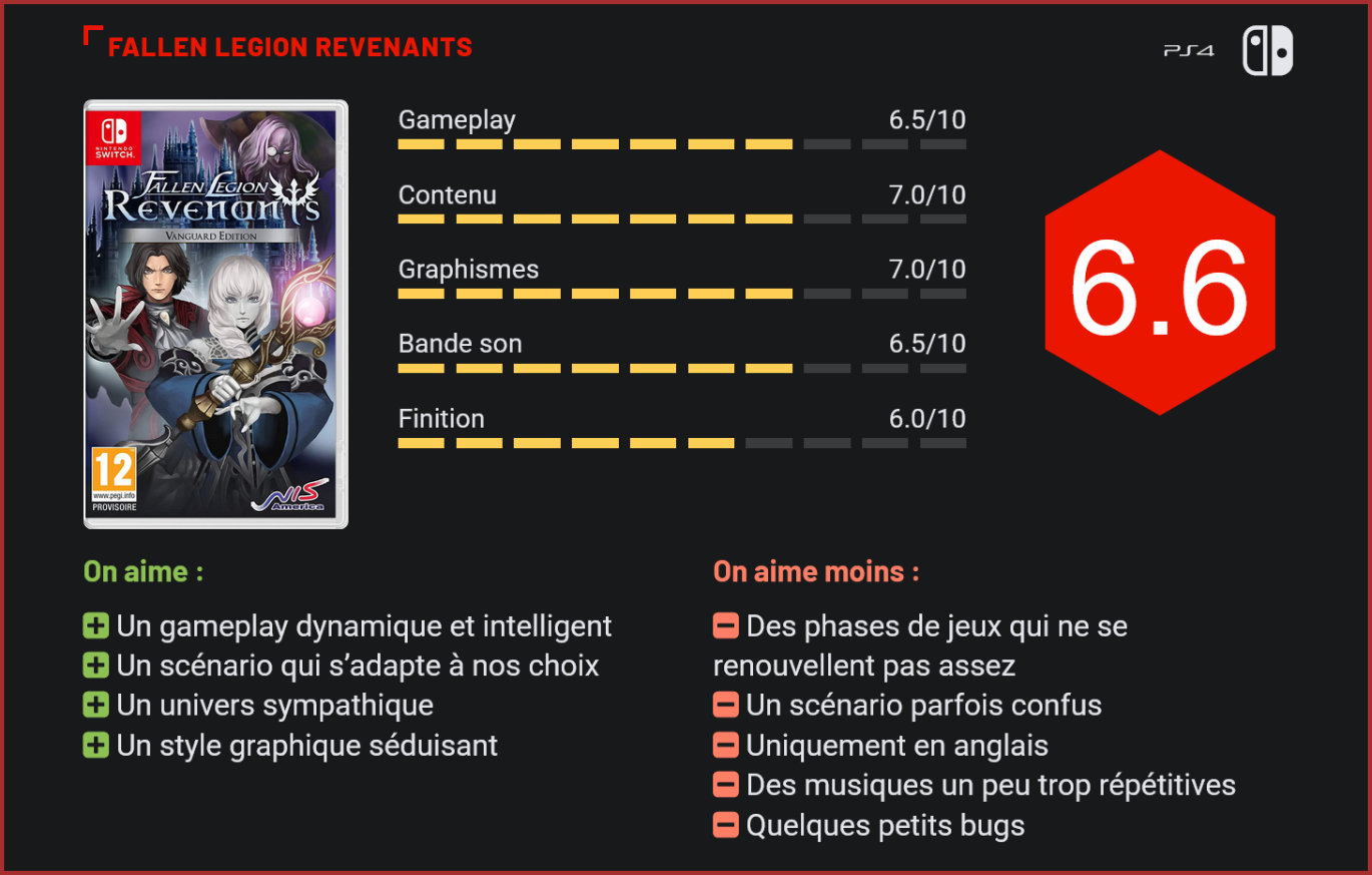 Après plusieurs versions d’un premier jeu Fallen Legion, le petit studio YummyYummyTummy nous livre cette fois une suite. Un Action-RPG intéressant sur de nombreux points mais qui peine à convaincre sur le long terme. Fallen Legion est une série d’Action-RPG débutée en 2017 avec un épisode sorti sur Playstation 4 et Playstation Vita, suivi d’une réédition sur PC et Nintendo Switch l’année suivante. Mais c’est en ce mois de février que débarque, uniquement sur Switch et PS4, une suite n’ayant que peu de liens avec le premier jeu, à savoir Fallen Legion Revenants. Ce nouvel épisode garde cependant les bases de son gameplay. Tout comme son prédécesseur, le titre est développé par un studio américain du nom de YummyYummyTummy et édité par NIS America. Fallen Legion Revenants se déroule dans un monde gangréné par une peste transformant les êtres vivants en monstres. Le dernier rempart de l’humanité se situe sur une petite île flottante où se trouve le château de Weilkin. On y suit l’histoire de Lucien, un politicien résidant dans ce château qui complote contre Ivor, un gouverneur tyrannique. Lucien sera aidé par Rowena, le fantôme d’une femme qui cherche à sauver son fils, enfermé dans la prison du château. Ensemble, ils apprendront l’existence des Exemplars, de puissants guerriers invoqués à partir d’armes qui les aideront dans leur quête. On souffle entre les phases de gameplay en se baladant dans le château. Si le scénario est intéressant, il est parfois confus. L’introduction du jeu est assez avare en informations concernant l’univers. Il faut cependant souligner que l’histoire évolue selon les choix du joueur. Le jeu nous laisse souvent le choix parmi plusieurs environnements à explorer, ce qui changera la phase de jeu à venir. Tandis que Lucien devra parfois participer à des votes pour prendre des décisions concernant le reste de l’humanité. Des choix qui vont réellement influencer la suite du jeu, et parfois même le sort de certains personnages. Au contrôle de Lucien, il est possible d’interagir avec d’autres habitants dans différentes pièces du château. Nous avons également la capacité de concocter des potions et de gérer notre équipe d’Exemplars avant de partir en mission et de prendre le contrôle de Rowena. Une fois le château quitté, Rowena part visiter le monde alors remplis de créatures dangereuses. Celle-ci est accompagnée de trois Exemplars préalablement choisis. La suite se déroule comme une succession de combats qui s’inspirent sans doute de Valkyrie Profile. Le système de combat se joue en temps réel, chaque Exemplars est assigné à un bouton de la manette et appuyer sur l’un d’entre eux déclenche une attaque de sa part. Les personnages possèdent des skills plus puissants et Rowena peut également utiliser des sorts magiques pour supporter l’équipe. Le jeu accorde également une certaine importance dans la position où se trouve notre équipe ainsi que les ennemis, puisque certaines cases au sol peuvent avoir différents effets. Le gameplay se révèle dynamique et intelligent. Il sera nécessaire de parer les coups des adversaires au bon moment et d’être agressif dans le but de réduire leur jauge de bouclier et ainsi d’infliger beaucoup de dégâts. Parce que les ennemis ont tendance à avoir énormément de vies, et les affrontements peuvent donc s’éterniser. Malgré cela, le système de combat est complet et intelligent. Les différents personnages que l’on débloque au fil du jeu viennent ajouter un peu de stratégie et de personnalisation à l’ensemble. Les phases de gameplay sont parfois interrompues par de courtes séquences montrant le point de vue de Lucien resté au château. Celui-ci a la capacité de communiquer à distance avec Rowena, lui permettant de l’aider à sa manière. Il va parfois falloir trouver une information précise en parlant aux personnages, ou encore s’infiltrer dans une pièce gardée du château. Des phases de jeu plutôt sympathiques qui amènent un peu de variété à l’ensemble. Mais malheureusement, cela n’empêche pas les phases de gameplay de paraître très répétitives. Celles-ci n’arrivent pas suffisamment à se renouveler. Lorsque Rowena part au combat, Lucien glane des informations au château. S’il y a bien un domaine dans lequel ce Fallen Legion excelle, c’est au niveau de son univers graphique. L’univers sombre et macabre du titre est très bien représenté par des visuels en 2D du plus bel effet. Les décors sont charmants, les personnages sont nombreux et très bien animés. Les personnages sont d’ailleurs doublés, puisqu’un doublage anglais de bonne qualité est disponible. La bande-son est également très efficace. Elle a cependant le vilain défaut d’être répétitive, elle aussi. Il faut également souligner que le titre souffre de quelques bugs, en particulier des problèmes d’affichages de personnages et d’animations qui ne se déclenchent tout simplement pas dans certaines cinématiques. D’autres petites curiosités sont à noter comme le fait de devoir appuyer deux fois sur un bouton pour déclencher un dialogue avec un personnage, ce qui témoigne d’un petit manque de finition. Avec ses nombreuses fin différentes, Fallen Legion Revenants propose tout de même une bonne dose de choses à faire. L’aventure reste linéaire et très scénarisée, ce qui pourra plaire aux amateurs de l’univers. À condition d’accrocher à sa proposition et à sa boucle de gameplay très répétitive et d’avoir de bonnes connaissances en anglais puisque le jeu n’est disponible que dans la langue de Shakespeare. Conclusion Fallen Legion Revenants est un nouvel épisode d’une série d’Action-RPG méconnue développée par un studio américain du nom de YummyYummyTummy. Si ce nouvel opus n’est pas directement lié scénaristiquement à son prédécesseur, il en garde