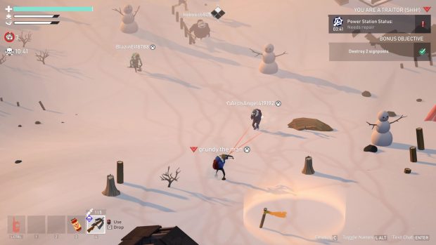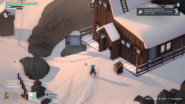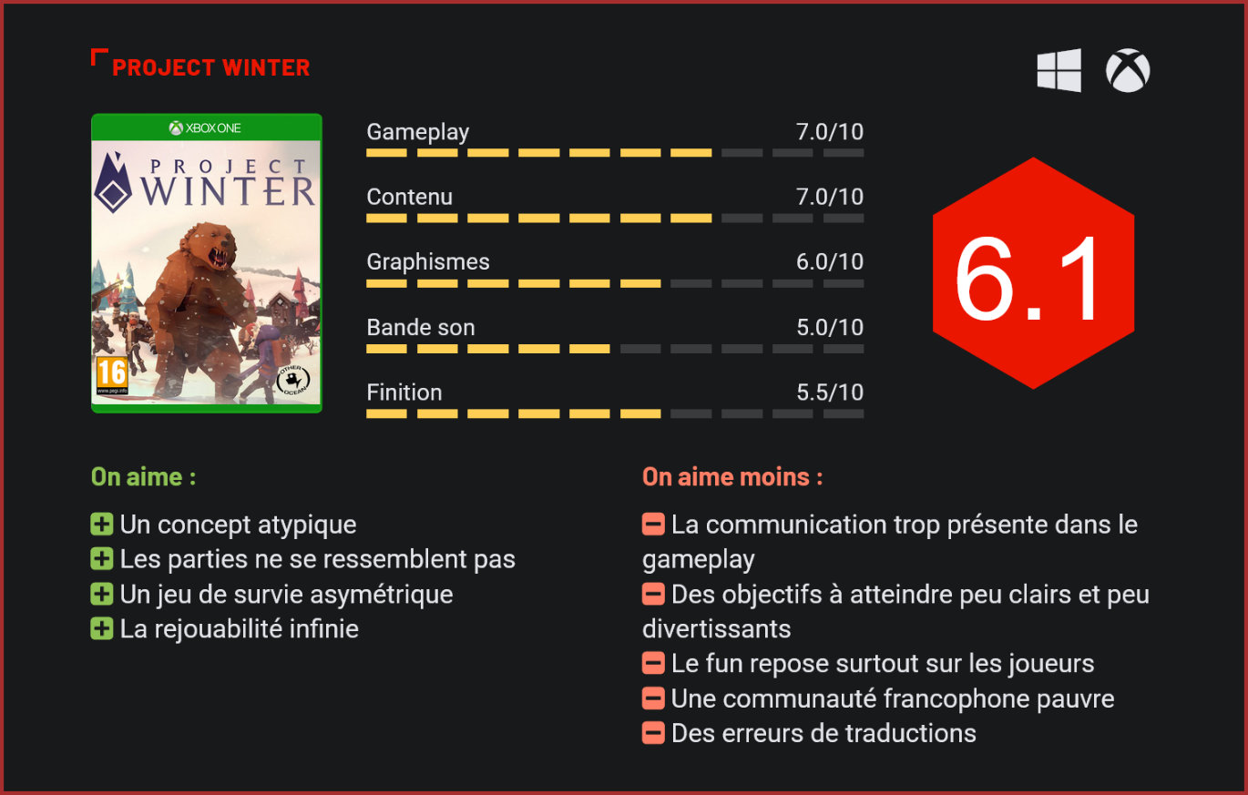 Mêlant jeu de survie asymétrique, sournoiserie et chat vocal, Project Winter propose une aventure atypique qui devrait plaire aux adeptes d’Among Us. Deux ans après sa sortie en accès anticipé sur PC, le jeu débarque sur consoles, dans le Gamepass. Project Winter se rapproche plus d’une expérience sociale que d’un jeu vidéo puisqu’il propose une aventure basée sur la coopération, mais également sur l’enquête et la sournoiserie. La création du studio Other Ocean Interactive n’est en effet pas qu’un simple jeu de survie dans lequel les joueurs doivent réaliser des tâches pour s’en sortir indemne. Le groupe de survivants est compromis puisque deux traitres se trouvent en son sein. Ils feront en sorte d’anéantir les efforts des survivants quitte à les empoisonner ou les tabasser à coups de pioche, à l’abri des regards. Vous l’aurez compris, Project Winter est plutôt atypique, avec des bons et des mauvais côtés. L’identification des traitres ne représente qu’une partie de l’expérience vidéoludique, Project Winter reste en effet un jeu de survie. Les survivants devront donc réaliser divers objectifs, en prenant soin de ne pas congeler ni de mourir de faim. Car oui, les traitres ne seront pas les seuls dangers. L’environnement inamical – le froid et les animaux sauvages – sera tout aussi dangereux que les faux-amis. Pour atteindre les objectifs et pouvoir appeler les secours, les joueurs devront coopérer et s’organiser pour fabriquer des ressources nécessaires afin de réparer les différentes installations. Project Winter place la coopération au coeur de l’aventure, sans cela, il est tout simplement impossible de progresser. Il est d’ailleurs fortement conseillé d’utiliser un casque-micro pour échanger avec ses camarades de galère et ainsi savoir vers où aller pour récupérer des ressources, ouvrir des bunkers, identifier les traites. Et s’il est possible de tout faire à l’écrit, il est beaucoup plus simple d’échanger vocalement, d’autant plus que la proximité avec les autres joueurs sur la carte a une incidence sur le nombre de joueurs qui peuvent nous entendre. C’est très pratique pour discuter d’une stratégie avec le second traitre ou d’essayer de récolter des indices sur l’identité des fauteurs de trouble. Le jeu intègre un système de craft plutôt basique et ennuyeux. Sur le papier, le concept est vraiment chouette. Dans la pratique, ce n’est pas toujours le cas. Au-delà de la langue – on peut rejoindre des groupes francophones – se pose le problème du caractère des joueurs. Certains préfèrent se la jouer solo, alors que d’autres prennent beaucoup de place, mais ça, ce n’est pas vraiment de la faute à Project Winter. On aurait quand même préféré que les interactions vocales ne soient pas aussi importantes dans l’aventure, mais là encore, ça dépend des joueurs. Cela permet tout de même de discuter d’une stratégie, d’enquêter plus facilement sur l’identité des traitres qui pourront se défendre de vive voix, mais le chat vocal peut rapidement devenir un brouhaha infernal si tout le monde se met à parler. Mais avant de pouvoir discuter stratégie/trahison, il faudra parvenir à rentrer dans une partie. S’il est possible de lancer un jeu avec seulement 5 joueurs, les créateurs attendront le plus souvent d’être minimum 8 et cela peut prendre un certain temps, surtout pour une partie francophone. Et ce n’est qu’un premier critère, après, il faudra que chacun ait un micro et enfin, que vous soyez un joueur et non une joueuse au risque de vous faire tout bonnement expulser. Mais là encore, le problème vient des joueurs et non du jeu. Le jeu se révèle surtout amusant lorsqu’on joue avec des amis. Fort heureusement, on est également tombé sur des personnes très sympas avec qui survivre s’est révélé très chouette jusqu’à ce que certains nous trahissent… C’était d’ailleurs le moment le plus excitant du jeu parce que, oui, globalement, ça manque de fun. L’aventure dans Project Winter dépend en grande partie des joueurs avec lesquels vous tombez, car rétablir du courant, ouvrir des bunkers ou crafter des ressources n’est pas forcément très amusant. Le gameplay est assez basique en réalité et manque souvent de clarté, notamment au niveau des objectifs à atteindre. La seule carte disponible se trouve à la « cabine » – mauvaise traduction de « cabane » – et cette dernière n’est pas très claire. Alors, certes, c’est pour se mettre en condition de survie, mais c’est assez frustrant. Les points d’intérêts et les indications pour se repérer manquent eux aussi de clarté. Il aurait été plus intéressant que le jeu propose des indications de distance ou une minicarte étant donné que la survie au sens propre est secondaire dans le jeu. La partie craft du jeu n’est pas non plus très bien exploitée. Si on peut fabriquer un nombre important d’objets, ces derniers ne sont pas tous indispensables. Le système de craft de ressources n’est pas non plus optimal, il est le même pour toutes les ressources et est assez ennuyeux. Quant aux animaux sauvages, ces derniers sont très basiques, animés par une IA parfois bancale. Le système de visée avec les armes est à pleurer. On optera très rapidement aux bons vieux coups de poing, beaucoup plus efficaces. Enfin, les menus sont peu clairs et il est assez compliqué de naviguer dedans tant les sous-menus sont nombreux et pourtant, inutiles. Les commandes ne sont pas non plus des plus simples ce qui est évidemment dommage et affecte l’expérience du joueur. Difficile de ne pas s’ennuyer quand on est du côté des traitres. Globalement, comprendre le fonctionnement du jeu et élaborer une stratégie exigera plusieurs parties, et ce, même si le jeu propose un tutoriel. On ne se rend bien compte de tous les obstacles qu’au bout de plusieurs parts. 