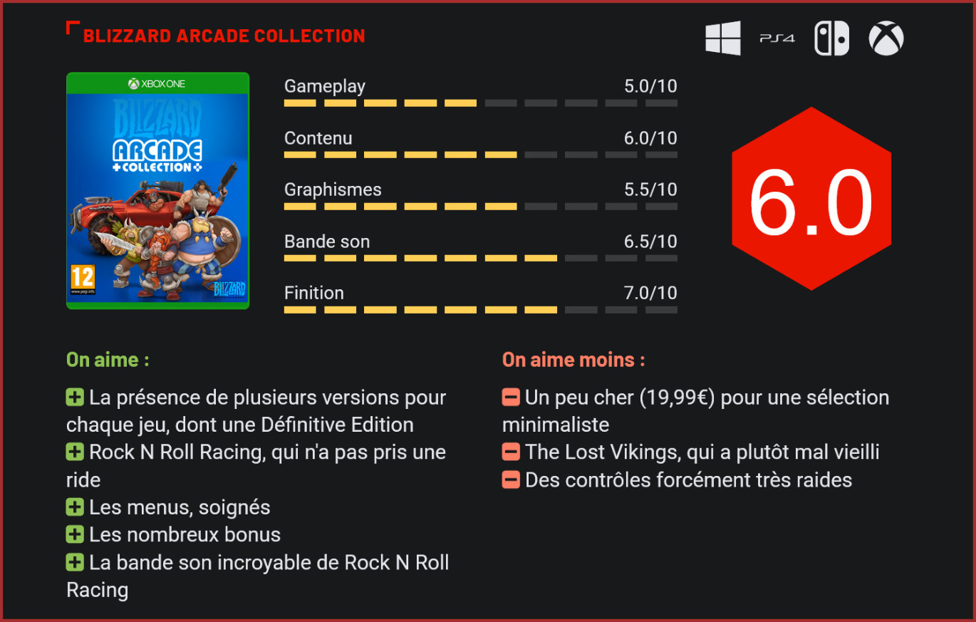 Pour célébrer son trentième anniversaire, Blizzard nous livre une compilation de trois titres. La Blizzard Arcade Collection n’a pas pour ambition de retracer l’incroyable aventure du studio américain mais plutôt de nous faire revisiter ses classiques. Lorsqu’on cite Blizzard, difficile de ne pas penser instantanément à Warcraft, Starcraft ou Diablo. Le fameux tiercé gagnant du studio californien. Si ce sont effectivement ces trois licences qui ont permis au studio de prendre son envol, Blizzard avait produit auparavant plusieurs autres jeux. A l’occasion de son trentième anniversaire, le studio californien nous propose de redécouvrir ses premières productions à travers une compilation résolument arcade. Avant de créer l’univers formidable de Warcraft (1994), Blizzard a produit plusieurs autres jeux. Son premier jeu voit le jour en 1991 sur Super NES. Blizzard deviendra très vite l’un des studios les plus productifs de la scène nord-américaine. En 1992, le studio californien sort son second jeu : The Lost Vikings, qui sera suivi en 1993 par Rock ‘n Roll Racing, la suite spirituelle de sa première production, RPM Racing. Avant de sortir le premier volet de sa prestigieuse licence Warcraft, il livrera en 1994 un autre jeu arcade emblématique, le bien nommé Blackthorne. Sur le côté, le studio livrera également deux adaptations de comics en jeu vidéo. Plusieurs versions de chaque jeu sont proposées, avec en prime une Definitive Edition et divers bonus pour découvrir les coulisses du développement de ces jeux. Le succès de Warcraft encouragera le studio à concentrer ses efforts sur cette licence. Un an seulement après le premier volet, Blizzard nous livre déjà sa suite. La licence Diablo ne sera elle introduite qu’en 1997, avant un autre grand nom du jeu vidéo, Starcraft en 1998. Licences oblige, il était peu probable que Blizzard soit capable de récupérer les droits pour nous livrer les remasters de ses jeux Superman et Justice League. Le studio a volontairement mis de côté ses franchises à succès pour concentrer ses efforts sur ses premiers travaux. L’Arcade Collection ne rassemble que trois jeux, parmi les moins connues productions du studio. C’est peu, même pour 19,99€. D’autant plus que RPM Racing n’est pas de la partie, ni d’ailleurs la suite de Lost Vikings, sortie en 1997. Pour autant, il serait ingrat de bouder cette compilation, aussi incomplète puisse-t-elle être. Car dans les faits, Blizzard a tout de même réalisé un très joli travail en compilant les différentes versions de chaque jeu et en y ajoutant une “Definitive Edition”, qui intègre la plupart du temps quelques nouveaux effets visuels et permet surtout de jouer au jeu sur un écran large. Les acheteurs ont donc droit à la version originale de chaque titre, au portage sur MegaDrive et à une réédition tirant le meilleur des deux mondes et apportant quelques petites nouveautés. A côté de cela, on retrouve également de nombreux bonus sur les coulisses des jeux. Les fans en auront donc largement pour leur argent, même s’ils regretteront la relative maigreur du catalogue. The Lost Vikings est le jeu qui a le plus mal vieilli dans cette sélection. Si vous n’aviez jamais touché aux premiers jeux du studio, on vous conseille de démarrer avec Rock N Roll Racing, assurément le titre le plus fun de cette (petite) sélection. Rock N Roll Racing est un jeu de course arcade totalement délirant en 3D isométrique dans lequel le joueur devra piloter son bolide à travers une sélection de championnats tout en affrontant trois adversaires qui n’hésiteront pas à lui faire du rentre-dedans et à lui tirer dessus. Niveau sensations, on est proche d’un Micro-Machines sous hormones, avec des décors heavy-metal, une bande son rugissante et un système d’amélioration du bolide plutôt bien pensé. Côté bande son, on retrouve quelques pépites du rock, parmi lesquelles Born to be Wild, Radar Love et Highway Star. Dans sa version Definitive, le jeu n’a presque pas pris de ride. Alors oui, les contrôles sont un peu rigides et le mode carrière n’est pas des plus passionnants, mais si vous accrochez au concept et avez des potes avec qui jouer, vous passerez un bon moment en compagnie de Rock N Roll Racing. Rock N Roll Racing est la bonne surprise de cette sélection. Inversément, The Lost Vikings est probablement le jeu qui a le plus mal vieilli dans cette sélection. Ce platformer old-school tirait son originalité à l’époque de son gameplay, basé sur la coopération puisqu’on devait contrôler plusieurs vikings aux aptitudes complémentaires. L’un se faufile partout très facilement, l’autre est armé d’un énorme bouclier qui lui permet de protéger ses compères, le dernier d’un arc à flèches, qui lui permet d’éliminer à distance ses ennemis. Enlevés par des extra-terrestres, nos trois vikings devront résoudre des énigmes dans des niveaux au level-design parfois très paresseux. Le jeu tire sa richesse de son design cartoonesque et de son mélange improbable de genres, mais le concept a mal vieilli et le rythme est ici très haché. Pas sûr que le titre plaira aux audiences jeunes… Les fans de la licence seront en revanche ravis de pouvoir remettre la main sur cette vieillie pépite du catalogue de Blizzard. Dernier titre de la sélection, Blackthorne se présente comme un platformer orienté action dans lequel le joueur dirige une sorte de Rambo des temps modernes qui se balade dans des décors sinistres, éliminant tous les ennemis qui se présentent à lui à grands coups de shotgun. La particularité du jeu vient ici du fait qu’il est possible de se cacher dans les décors pour échapper aux ennemis. Un concept séduisant. La prise en main reste très rigide mais le concept unique du jeu lui donne un certain intérêt pour les amateurs de platformers old-school. Alors oui, très clairement, on aurait 