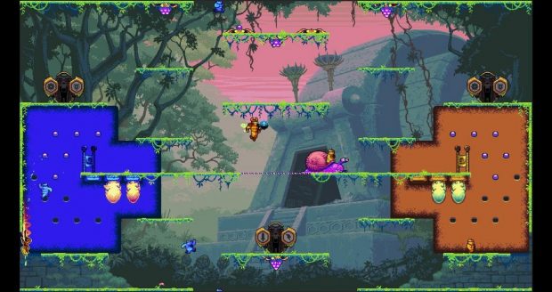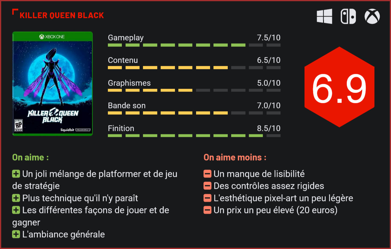 Huit ans après sa sortie en arcade, Killer Queen Black part à l’assaut des consoles. Avec son concept atypique, ce mélange improbable de jeu de plates-formes et de stratégie avait de quoi séduire les joueurs… Killer Queen Black prend la forme d’un jeu de stratégie compétitif se jouant par équipe de 4. Les joueurs incarnent soit une reine, soit un travailleur qui se chargera de ramener des baies à son hub ou se transformera en soldat pour repousser les ennemis et attaquer la reine adverse. Au premier abord, le jeu n’est pas forcément des plus accessibles, malgré son aspect simpliste. Un rapide passage par le tutoriel – présent dans les parties en local – aidera les joueurs à comprendre les tenants et aboutissements du jeu, à maîtriser les commandes et surtout à passer en revue les différentes stratégies pour remporter les victoires. Nous l’avons dit, dans Killer Queen Black, les joueurs peuvent incarner trois personnages différents et donc, avoir un rôle différent dans l’arène. La reine peut attaquer tout le monde, de même que le soldat. Quant aux travailleurs, ils doivent se contenter des tâches les plus ingrates ; récupérer des baies ou diriger un escargot géant pour le faire passer la ligne d’arrivée de leur camp. Chaque partie peut être gagnée de trois façons différentes ; grâce à l’escargot, grâce aux baies ou en assassinant trois fois la reine adverse. Pour gagner une partie, les joueurs devront remporter trois victoires. Contrairement à ce qu’on pourrait croire, le jeu demande une bonne dose de stratégie pour décrocher la victoire. Ainsi, si les reines peuvent se traquer entre elles, elles peuvent également viser les soldats ou encore protéger les travailleurs assis sur l’escargot. Pareil pour les soldats qui peuvent cibler la reine, massacrer les soldats ou protéger ses camarades. Pour remporter la partie, les joueurs devront se coordonner. Une équipe unie aura beaucoup plus de chance à remporter la partie. Grâce au chat vocal intégré, il est possible de discuter avec ses coéquipiers de la stratégie à adopter. Il va de soi que Killer Queen Black est un jeu plus fun à jouer entre amis. Le jeu est plus stratégique qu’il n’y paraît. Les commandes sont relativement peu nombreuses (sauter, vol, direction, attaques) et à la manette, on ne peut pas dire que ça soit toujours très simple. Diriger notre reine ou notre bon vieux travailleur peut en effet s’avérer compliqué parfois, vu la rigidité des commandes. L’absence de cadre – foncer dans le mur ou tomber dans le vide téléporte le joueur de l’autre côté de l’écran – impose au joueur d’être attentif en permanence à ce qu’il se passe à côté de lui puisqu’une reine ou un soldat peut apparaitre par surprise derrière lui et lui infliger un coup mortel. Les parties sur Killer Queen Black – qui se gagnent après trois victoires – sont assez intenses et peuvent durer moins d’une minute dans certains cas, ce qui est assez frustrant. La rapidité des parties reste tout de même excitante et pousse le joueur à rester vif et réactif. Il doit parfois changer sa stratégie au cours de la partie pour venir à bout des ennemis. Sur la durée, le jeu parvient à se montrer suffisamment riche pour tenir le joueur scotché à son pad quelques heures. N’espérez toutefois pas y passer plus de 6 ou 7 heures, le concept finissant forcément par lasser. Il n’est pas toujours facile de se repérer sur la map. Les développeurs de chez BumbleGear Games ont conservé une esthétique pixel-art caractéristique des jeux d’arcade d’antan. Le résultat est assez plaisant et devrait plaire aux plus nostalgiques des joueurs. Il n’en reste pas moins que le jeu manque parfois de lisibilité. On a parfois – souvent – du mal à repérer notre personnage lorsqu’on incarne un travailleur, c’est dommage. Les développeurs ont opté pour des arrière-plans plus travaillés, malheureusement les plateformes sont moins visibles ainsi. De plus, les couleurs fluo sont particulièrement criardes ce qui n’est pas forcément très joli. Les décors ne sont pas non plus très recherchés et les cartes limitées à 7 sont assez anecdotiques, mais là encore, cela rappelle les jeux d’arcade. Enfin, le jeu n’est toujours disponible qu’en anglais. Dans les faits, ce n’est pas dérangeant puisque Killer Queen Black ne propose aucune histoire, dialogue ni rien de ce genre. Pour ce qui est de l’ambiance sonore, elle se résume à des musiques électroniques intenses. On retrouve vraiment l’ambiance borne d’arcade. Conclusion Huit ans après ses débuts en arcade, Killer Queen Black est de retour, cette fois sur consoles. Mélange improbable de jeu de plates-formes et de stratégie, le titre se présente comme un jeu compétitif très fun, qui se joue en équipe de quatre. Le joueur pourra incarner au choix un ouvrier, chargé de récupérer des petites baies et de diriger un escargot géant jusqu’à l’objectif, une reine, qui devra rester en vie tout en éliminant ses adversaires ou un soldat. Beaucoup plus stratégique qu’il n’y paraît, le titre tire sa richesse de la diversité des situations. Il est possible ici de remporter la partie de différentes façons. Les parties sont courtes, intenses et on en redemande, malgré la rigidité des commandes. Avec son esthétique en pixel art – avec des visuels qui piquent parfois aux yeux – et ses musiques électroniques dignes des années 80 et des salles d’arcade, Killer Queen Black rend parfaitement hommage aux gloires des 80’s. Son concept atypique peut toutefois rapidement lasser.