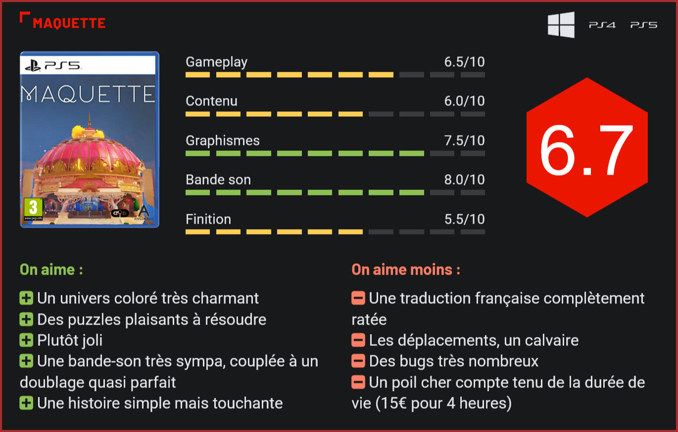 “Offert” durant le mois de mars sur le Playstation Plus, Maquette bénéficie d’un très joli coup de projecteur. Un puzzle-game aux moyens limités, mais qui pourrait plaire à plus d’un joueur. Si l’on vous parle de puzzle-game, quelques titres immanquables nous sautent automatiquement à l’esprit. On se rappellera par exemple de l’excellente franchise Portal ou du récent Superliminal, des titres dans lesquels l’espace relève d’une importance toute particulière. En effet, il faut y faire preuve d’ingéniosité et de malice pour résoudre les énigmes, en s’aidant de tout ce qui se présente à vous pour modifier la taille ou la nature des objets qui vous entourent. C’est exactement sur ce même principe que fonctionne Maquette. Développé par les novices de Graceful Decay, le titre est une sorte de boîte à énigmes géante autour de laquelle gravite des principes d’architecture et une jolie histoire d’amour. Un savant mélange qui permet de faire du jeu une relativement bonne surprise, non sans défauts, mais très poétique et touchant. En effet, c’est avant tout le scénario de Maquette qui nous transporte. Vous suivrez l’histoire d’amour que vivent Kenzie et Michael. Si celle-ci est relativement bateau et plutôt cucul, elle parvient étonnamment à nous transporter et à nous procurer joie dans les bons moments, et empathie dans les moments les plus durs de nos amis. Tournée autour de leur passion commune pour le dessin, que l’on ressentira tout au long de l’aventure, cette histoire d’amour se permet même à certains moments de nous surprendre. Les énigmes proposées sont relativement bien ficelées. Ni trop compliquées, ni trop aisées, on s’en défait plutôt plaisamment. Afin de progresser au sein de cette aventure, vous allez devoir résoudre une grande quantité d’énigmes, toutes plutôt bien ficelées les unes que les autres. En vous servant de la maquette de votre environnement se situant au milieu de la pièce, vous devrez agrandir ou rétrécir certains objets afin de progresser. Le concept est plutôt bien imaginé mais difficile à appréhender au début. Ce n’est qu’après quelques énigmes que l’on parvient sans mal à prendre en main le gameplay. Il faudra alors, pour progresser dans les niveaux, réfléchir sur plusieurs échelles et à quoi pourrait servir tel ou tel objet si sa taille venait à être décuplée ou diminuée. On regrette toutefois que certaines mécaniques viennent gâcher l’expérience de jeu. Ainsi, les déplacements sont fastidieux, terriblement lents et mal conçus. On ne fera que, la plupart du temps, se déplacer d’un point A à un point B sans avoir la moindre possibilité d’accélérer. De plus, si vous êtes bloqués, n’espérez pas obtenir une quelconque aide. Seules les inscriptions sur les murs vous indiquent si vous êtes ou non sur le bon chemin. En pleine énigme, difficile toutefois de savoir si on est sur la bonne voie. Si l’on prend un plaisir à résoudre les énigmes qui se dressent à nous, on était tout de même en droit d’attendre une aventure un poil plus longue. Comptez un peu plus de 4 heures pour terminer l’histoire en prenant votre temps. Le jeu est actuellement facturé à 15€, l’addition est donc assez salée si vous payez le prix plein. Lorsque l’on parcourt les univers de Maquette, une chose nous saute aux yeux : la richesse de son environnement. Vous ne resterez pas toujours autour de la maquette du dôme, et aurez tantôt l’occasion de découvrir un cimetière lugubre, tantôt la possibilité de vous balader au sein d’un jardin féérique et magnifiquement coloré. L’ensemble fonctionne très bien, et chaque environnement est plaisant à découvrir, aidé par une direction artistique très réussie. Sans être beau, Maquette propose un univers très réussi à la patte graphique très marquée, proche des dessins. On ne le comparera évidemment pas à des grosses productions où les graphismes sont réalistes et splendides, mais Maquette peut se vanter d’être relativement joli, surtout dans les environnements très colorés et plein de vies. Maquette dispose d’un univers très charmant, à la fois réussi visuellement et coloré. S’il est un point sur lequel on ne peut rien reprocher au titre, c’est sa bande son. Elle est parfaitement élaborée et nous transporte au long de notre aventure. Les différentes mélodies qui la composent sont tout simplement parfaites et idéalement adaptées à chaque situation. On aura ainsi droit à de la musique pop/rock dans les moments de joie, tandis que l’on passe à de la musique plus mélodieuse et douce dans les moments de tendresse. Toutefois, la bande originale ne fait pas à elle seule la réussite de Maquette. En effet, difficile de passer à côté d’un doublage parfaitement réussi. N’espérez pas de version française dans le titre, et c’est tant mieux. Le couple formé par Kenzie et Michael est interprété par Bryce Dallas Howard (Jurassic World, Spider-Man 3) et Seth Gabel (Arrow, American Horror Story). Le jeu d’acteurs est sans surprise très bon, mais également très touchant. Malheureusement, Maquette ne peut bénéficier des moyens des grosses productions en ce qui concerne l’assurance qualité. C’est d’ailleurs très regrettable, puisque cela aura pu lui être bénéfique. En effet, le jeu de Graceful Decay pèche énormément dans sa finition, avec pléthore de bugs et de problèmes d’affichage. Les chutes de framerate sont omniprésentes, tandis que le clipping aurait pu être atténué. De son côté, les sous-titres français sont complètement ratés, surtout au début de l’aventure. On a d’ailleurs l’impression que les développeurs se sont servis d’un outil comme Google Translate, tant certaines traductions sont très hasardeuses, voire incompréhensibles. Conclusion Puzzle-game dans sa plus pure essence, Maquette se présente comm