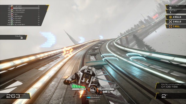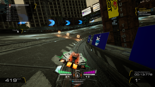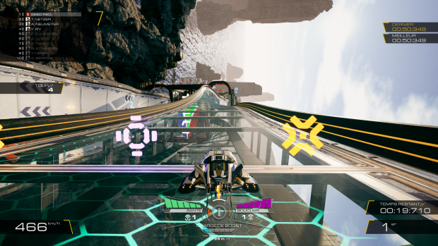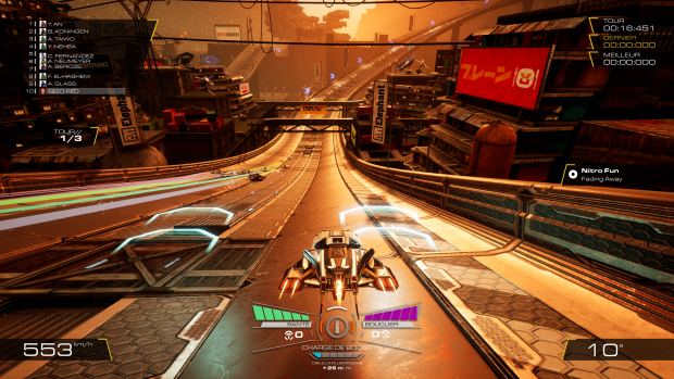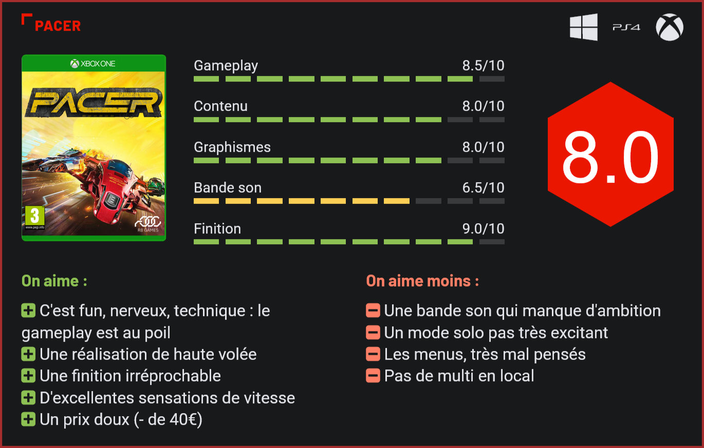 Sorti en toute fin d’année 2020 sur PC, Pacer a eu droit à une sortie tardive sur consoles. L’occasion de revenir sur cet excellent jeu de course futuriste, à côté duquel nous avions failli passer! Depuis quelques temps, les studios indépendants sont de plus en plus nombreux à nous livrer des jeux de course futuristes. Et pour cause puisque les gros éditeurs semblent avoir totalement déserté ce segment. Wipeout, F-Zero, Extreme G ou encore Quantum Redshift semblent avoir définitivement rangé leur tablier. Pour les plus petits studios, il existe aujourd’hui une formidable opportunité de faire parler de soi. Le studio R8 Games l’a bien compris et livre avec Pacer l’un des meilleurs prétendants au trône. Certains circuits sont très impressionnants. Ne vous attendez toutefois pas à être surpris par ce jeu. Car s’il fait presqu’un sans faute, le studio britannique s’est contenté de suivre un cahier des charges très classique. C’est bien simple, on a très souvent l’étrange sensation de jouer à un nouvel épisode de la série des Wipeout, ni plus ni moins. Aucune particularité ne permet au jeu de se démarquer de ses concurrents. Pacer est un jeu de course futuriste très classique, qui ne brille ni par son originalité ni par la diversité de ses courses mais maîtrise parfaitement les codes du genre. Rien de très surprenant en soi puisque le jeu est développé par des anciens de Psygnosis, le studio qui se cachait derrière la série des Wipeout. Un peu plus accessible que son modèle, Pacer reste toutefois un jeu de course exigeant dans laquelle l’erreur est rarement tolérée. Il faudra en permanence éviter les tirs de ses opposants, faire le plein de son bouclier, et viser juste pour passer entre plusieurs vaisseaux. Les tracés sont sinués et remplis de tremplins et pièges en tous genres. Tout le gameplay du titre repose sur un élément hérité de la série de Psygnosis, à savoir l’aérofrein. Concrètement, les deux gâchettes permettent d’activer des freins qui sont indépendants l’un de l’autre. Il faudra sans cesse jouer avec les aérofreins pour maîtriser la trajectoire de son bolide, qui se déplace à toute vitesse sur les tracés du jeu. Sensations fortes garanties! Bien entendu, on ne se limite pas ici à conduire bêtement son circuit sur le tracé. Il faudra également régulièrement passer sur des plates-formes pour activer un boost, récupérer des armes pour tirer sur ses adversaires et renforcer régulièrement son bouclier, sans lequel vous ferez une cible facile… En cas de crash, vous perdrez quelques précieuses secondes et verrez votre place dégringoler dans le classement. Car dans Pacer, cela va vite, très vite même. Au début de l’aventure, vous roulerez à un vitesse de 500 à 600km/h. En grimpant dans les compétitions, vous prendrez le contrôle de bolides encore plus puissants. Dans Pacer, il faudra également se montrer stratégique et adapter son équipement selon son style de jeu. En début de partie, le joueur pourra choisir son arme mais également la particularité de son vaisseau. Il pourra ainsi prioritiser la vitesse, la défense ou l’attaque. On notera qu’il est d’ailleurs possible de customiser intégralement son véhicule, esthétiquement également, avec les nombreux éléments déverrouillés. Amusant, à défaut d’être très poussé. Pour remporter les parties, il faudra maîtriser ses aérofreins. Côté gameplay, l’offre est donc solide, même si encore une fois, Pacer a du mal à se démarquer des autres jeux du genre. Le cahier des charges est bien rempli et de surcroit, les sensations de vitesse sont bel et bien là. Le contenu du jeu est également plutôt généreux au vu du prix auquel il est vendu (un peu moins de 40€). On retrouve du multijoueur en ligne, mais pas de local malheureusement. Le mode carrière offre lui son lot de défis et grand prix. La durée de vie du jeu est très solide, mais le mode solo n’est pas forcément des plus excitants non plus… On tourne vite en rond sur la quinzaine de (très chouettes) circuits du jeu, les défis sont variés mais tous ne se valent pas forcément et surtout, le jeu manque cruellement de mise en scène. Il faudra passer ici par des menus très peu ergonomiques pour passer d’un défi à l’autre, sans aucune introduction au préalable. Malgré ces petits désagréments, on a toutefois bien la sensation d’en avoir pour son argent. Les décors sont soignés et dans l’ensemble très variés. Esthétiquement, le jeu fait également mouche. Avec ses graphismes très soignés, il passerait presque pour un titre next-gen, et ce même si certains éléments des décors ne sont pas toujours au même niveau que le reste. L’optimisation est parfaite : pas un ralentissement à l’horizon, pas un seul bug non plus. C’est toutefois surtout grâce à sa direction artistique très inspirée que le jeu tire son épingle du jeu, avec des décors parfois époustouflants, de superbes effets visuels et une DA à tomber. Les développeurs s’y connaissent d’ailleurs en terme de level-design. Chaque niveau semble avoir eu droit à une attention toute particulière. Les décors sont vivants, dégagent tous une atmosphère très particulière et partent parfois dans des délires complets. La bande son du jeu à l’inverse, manque cruellement de personnalité. La BO du jeu est énorme avec ses 80 morceaux. Mais elle manque cruellement de charme, le mixage est décevant et surtout ça manque vraiment d’entrain. Conclusion Avec Pacer, le studio britannique R8 Games livre un clone presque complet de Wipeout. Rien de surprenant puisque le titre a été développé par des anciens de Psygnosis… On reprochera clairement à ce Pacer un certain manque de personnalité. Le titre de R8 Games remplit toutefois parfaitement son cahier des charges avec son gameplay nerveux et technique, sa réalisation soignée et son contenu
