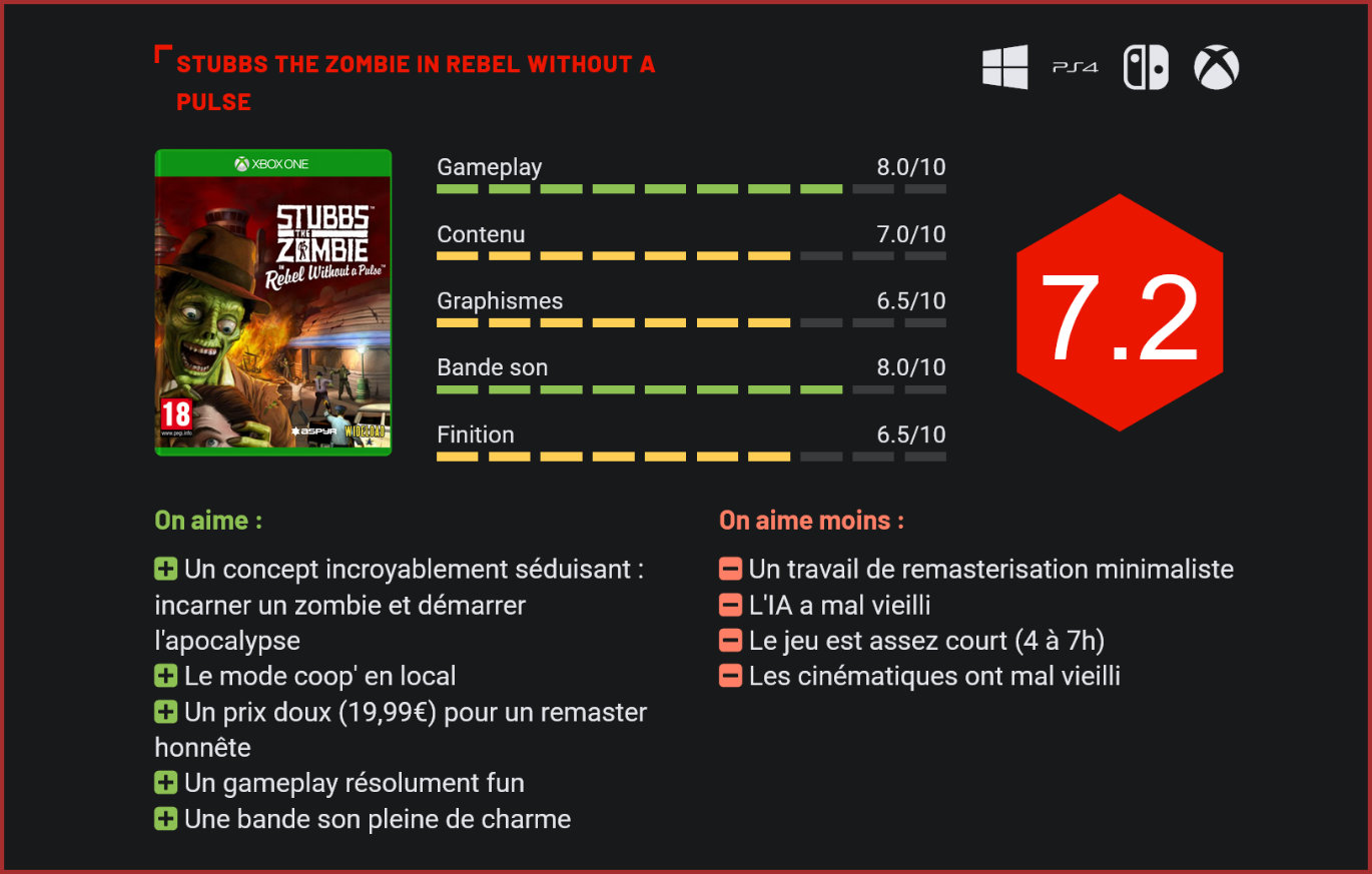 Sorti sur la toute première Xbox, Stubbs the Zombie in Rebel Without a Pulse n’avait pas remporté le succès qu’il méritait en son temps. Avec les années, le titre a toutefois su se forger sa petite communauté de fans. Au point qu’Aspyr se décide finalement à nous livrer un remaster du titre pour en faire profiter tout le monde. Rares sont les joueurs qui avaient pu y goûter en son temps. Stubbs the Zombie in Rebel Without a Pulse était sorti en toute fin de vie de la première Xbox, alors que toute l’attention des joueurs était porté vers la nouvelle Xbox 360 de Microsoft. Cette curieuse exclusivité est toutefois parvenue à se forger une solide réputation à travers le temps. Et pour cause puisque ce titre vous propose d’incarner un zombie, de dévorer des cerveaux et et semer le chaos dans une petite ville américaine. Un concept qui n’est pas sans rappeler celui d’un autre jeu similaire sorti à l’époque, Destroy All Humans!, qui reposait plus ou moins sur le même principe. A l’inverse du jeu de Wideload Games, le titre édité par THQ nous proposait d’incarner un extra-terrestre qui s’était écrasé sur Terre. Malgré les années, le jeu n’a pas trop mal vieilli, en grande partie grâce à son look cartoonesque. Les deux titres partagent beaucoup : l’univers SF délicieusement 60’s, un humour caustique, un antihéros qui sème le chaos et un gameplay résolument fun. Difficile de décrire le jeu en quelques mots. Stubbs the zombie joue clairement la carte de la parodie et du fun à profusion. Côté gameplay, on sent des vibes de Halo. Le titre repose d’ailleurs sur le même moteur graphique. La prise en main est parfois très similaire – notamment pour l’envoi de grenades ou la conduite de véhicules. Le level-design rappelle également parfois le titre de Bungie avec ses zones ouvertes propices à des batailles rangées entre les deux camps. Comme dans Halo, vous ne serez pas seul pour mener votre combat contre l’humanité. Chaque humain dévoré ou massacré se transformera à son tour en zombie. Vous pourrez les diriger directement en les appelant ou en les poussant dans une direction. De façon générale, on se contentera toutefois de semer le chaos et de les accompagner dans l’offensive face aux forces militaires ou aux officiers de police qui vous canarderont. Un scène classique du jeu : la capture du parking avec une armée de zombies qui progresse d’étage en étage. Si Stubbs est lent et n’est par défaut pas cabale de faire grand chose en dehors de frapper (avec X) et dévorer le cerveau d’un humain à proximité (avec Y), il dispose aussi de capacités spéciales qui se débloquent lorsqu’il remplit diverses jauges en dévorant les cerveaux d’humains. Il pourra ainsi lâcher des gaz pour étourdir ses adversaires, prendre le contrôle d’êtres humains en détachant sa main et en leur envoyant sur la figure – auquel cas le jeu prendra des allures de TPS -, conduire divers véhicules, décrocher sa tête pour l’utiliser comme une boule de bowling explosive ou envoyer des sortes de grenades. Le gameplay est suffisamment riche pour qu’on ne s’ennuie pas une seule seconde. Mais la vraie force du jeu vient toutefois de son côté stratégique, qui vous forcera à approcher les situations différemment, selon les forces en présence. Contaminer un maximum d’humains permet souvent de prendre l’ascendant sur son adversaire. Les contourner pendant que le gros de vos troupes les attaque de front permet aussi de créer une diversion qui fera souvent pencher la balance en votre faveur. Mais face aux boss, il faudra agir vite et frapper de façon très tactique. Vous pourrez prendre le contrôle d’êtres humains grâce à votre main. Stubbs the Zombie est un jeu résolument divertissant et qui ne se prend pas du tout au sérieux. Son scénario n’est pas forcément des plus passionnants, mais il a le mérite de nous faire voir du pays, de nous confronter à des personnages ultra-caricaturés et à jouer avec tous les stéréotypes des films de science-fiction des années 70 et 80. C’est fun, on ne s’ennuie pas une minute, et les développeurs ont poussé le délire très loin, en allant jusqu’à intégrer des mini-jeux totalement délirant de danse, ou des séquences sans queue ni tête. Il faudra toutefois garder une chose à l’esprit : le divertissement est de relativement courte durée. Comptez entre 4 et 6 heures pour en voir le bout. La bonne nouvelle, c’est qu’il y a aussi un mode coop en local, très plaisant. La mauvaise, c’est qu’on ne trouve aucun contenu inédit : pas d’unlockables, de mode défi ou de mode compétitif. Le tout petit prix de ce remaster (19,99€) est sans doute la raison pour laquelle les développeurs n’ont pas été plus loin. Certains mini-jeux sont complètement délirants. Ce remaster de Stubbs the Zombie mérite-t-il alors le détour? Assurément si vous aimez les jeux décalés dans la veine d’un Destroy All Humans. Visuellement, ça a forcément vieilli, mais le style graphique cartoonesque du jeu a limité la casse. Le travail de remasterisation est minimaliste. Les développeurs se sont contentés d’améliorer la résolution du jeu. Clairement, ils auraient pu consacrer un peu plus de leur temps sur l’IA ou les cinématiques, qui ont elles très mal vieilli. Mais rassurez-vous, le jeu reste très plaisant à parcourir. Son univers délirant, sa bande son fantastique, ses batailles rangées et son gameplay très fun en font un titre sur lequel on reviendra certainement plusieurs fois. Assurément, une très belle découverte à faire. Conclusion Passé inaperçu au moment de sa sortie sur la toute première Xbox, Stubbs the Zombie fait partie de ces jeux cultes qui méritaient un remaster sur les consoles de dernière génération. Quelque part à mi-chemin entre un Destroy All Humans, duquel il s’inspire pour son univers 60’s totalemen