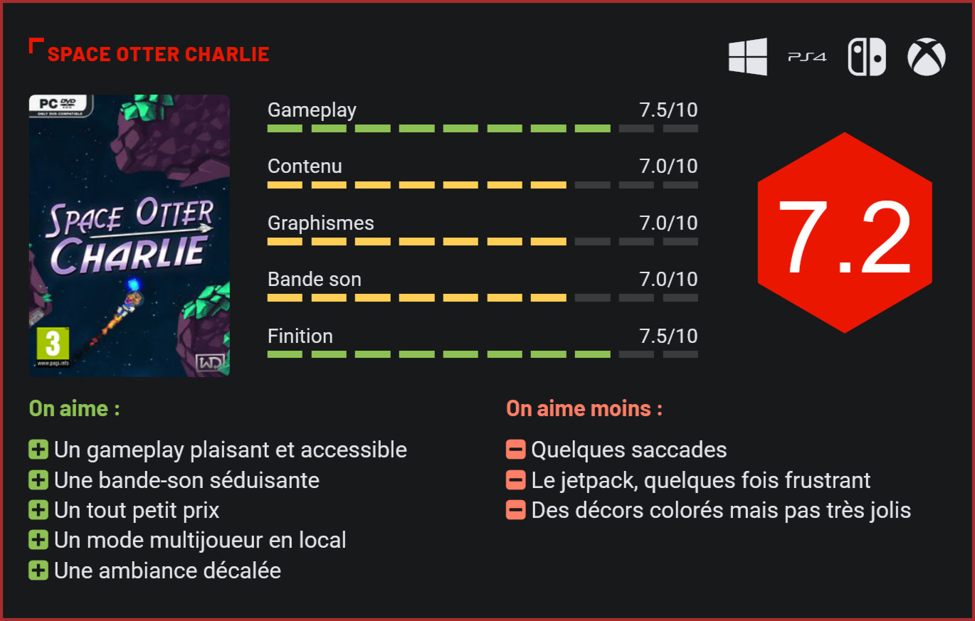 Petit titre indépendant au budget restreint, Space Otter Charlie est un metroidvania loin de se prendre au sérieux. Ce n’est pas une tare, puisque ça en fait un titre très plaisant à découvrir et à prendre en mains. Si on nous avait dit qu’un jour on mettrait la main sur un titre dans lequel on contrôlerait une loutre appelée Charlie et qui se balade dans l’espace, on ne l’aurait pas cru. C’est pourtant le pari osé qu’a tenté de relever le studio Wayward Distractions. Un studio qui propose là sa première production. Son fondateur a longtemps travaillé chez PopCap games, studio derrière Plants vs Zombies. Space Otter Charlie arrive donc avec un bagage déjà bien rempli qui lui est évidemment bénéfique. Space Otter Charlie se positionne comme un jeu écologiste. En 2500, les êtres humains ont quitté la Terre, devenue inhabitable suite au réchauffement climatique et à la pollution. Les animaux sont alors les derniers à vivre sur la Planète bleue, mais se rendent vite compte qu’ils ne peuvent rester plus longtemps sur une planète qui leur est devenue hostile. Les loutres prennent alors l’initiative de construire une fusée, et après plusieurs tentatives infructueuses, s’envolent vers d’autres horizons. En utilisant le jetpack, vous allez devoir défier l’absence de pesanteur de l’espace. Vous contrôlez alors la petite loutre Charlie qui, accompagnée de ses amis, cherche à tout prix une planète sur laquelle couler des jours heureux. Pour y parvenir, vous allez découvrir 5 mondes dans lesquels vous pourrez récupérer des ressources vous permettant d’améliorer votre vaisseau ou fabriquer des équipements. Espace oblige, vous allez vous aventurer dans des environnements ou la pesanteur est inexistante. Vous serez alors équipé d’un jetpack qui vous permettra de défier les lois de la gravité et d’atteindre des endroits dans lesquels sont cachés des orbes de vie, de la ferraille ou des accessoire nécessaires à votre progression. Le contrôle du jetpack est plutôt instinctif, même si l’on regrette qu’il faille s’y prendre à plusieurs reprises pour bien se positionner, la faute à une précision parfois hasardeuse. Pour affronter les innombrables dangers présents dans l’espace, vous récupérerez divers pistolets. Là aussi, leur utilisation est très simple et instinctive, afin de rendre Space Otter Charlie le plus accessible possible à tout un chacun. Les plus jeunes pourront sans problème prendre le titre en main, et pourquoi y jouer entre amis, puisque le titre est jouable en local jusqu’à 4 joueurs. De plus, il est très plaisant d’avoir affaire ici à un titre où la difficulté croît au fil des niveaux. On commence avec un monde très facile où il est aisé d’évoluer, pour arriver à des niveaux très hostiles où il faudra faire preuve de beaucoup d’adresse. Le jeu en lui même mêle plusieurs genres et se positionne comme une sorte de Metroidvania découpé en plusieurs petits mondes. Sans présenter de grands défis en soi, les combats de boss sont extrêmement réussis. De leur côté, les combats de boss sont un des points forts du titre. Au nombre de cinq venant conclure chaque monde, les boss sont tous très différents et requièrent une adresse toute particulière. S’ils ne sont certes pas très exigeants, sans doute en raison de l’accessibilité très poussée du titre, ces affrontements sont très plaisants. Comptez environ 5 heures pour boucler le titre dans sa globalité, tout en récupérant le loot supplémentaire et les quelques fichiers d’informations parsemés ici et là. Si l’on prend en compte que le titre coûte moins de 15 euros, cela reste une durée de vie très raisonnable en regard de l’investissement. On prend cependant tellement de plaisir à contrôler cette petite loutre que ces 5 heures semblent trop courtes et qu’on en redemande. Graphiquement, Space Otter Charlie est loin d’être le titre qui mettra vos cartes graphiques à genoux. Si les décors sont très colorés et plutôt bien inspirés, ils pâtissent malheureusement d’une réalisation très approximative. Certes le principal n’est pas là dans un titre de plateformes, qui plus est indépendant. Néanmoins, un peu plus de recherches et de travail de la part des développeurs sur ce point n’aurait pu qu’être bénéfique au titre. Si le visuel n’est pas très réussi, la direction artistique proposée par les développeurs reste elle très plaisante. Le titre profite d’une ambiance décalée qui est très loin de se prendre au sérieux, avec une narration qui joue beaucoup sur l’humour. Les personnages sont quant à eux très attachants et jouissent d’une écriture très bien fichue, quoique pas suffisamment approfondie. Sans être laid, Space Otter Charlie n’est clairement pas une révolution visuelle. De son côté, la bande son de Space Otter Charlie est une pure réussite. En s’inspirant de maîtres du genre tels que Metroid, celle-ci accompagne magistralement notre aventure et nous transporte à tout moment. Elle se permet même de varier d’un environnement à l’autre, et ce pour notre plus grand plaisir. Enfin, le titre de Wayward Distractions jouit d’une finition plutôt convaincante. Les bugs ne sont que très peu nombreux, si ce n’est les quelques arrêts sur image et saccades que l’on subit à chaque changement de décor ou lorsqu’un élément apparaît à l’écran. Cela reste fort dommage, d’autant que le titre ne subit d’aucun autre bug, qui n’est du moins pas dérangeant. Conclusion Quelque part à mi-chemin entre un jeu de plates-formes et un Metroidvania, Space Otter Charlie se révèle être l’une des bonnes surprises de ce mois de mars. Avec son gameplay plaisant et très accessible, le titre de Wayward Distractions plaira à tous les publics. Le joueur devra ici diriger sa loutre de l’espace dans des niveaux de taille modeste. Le jetpac
