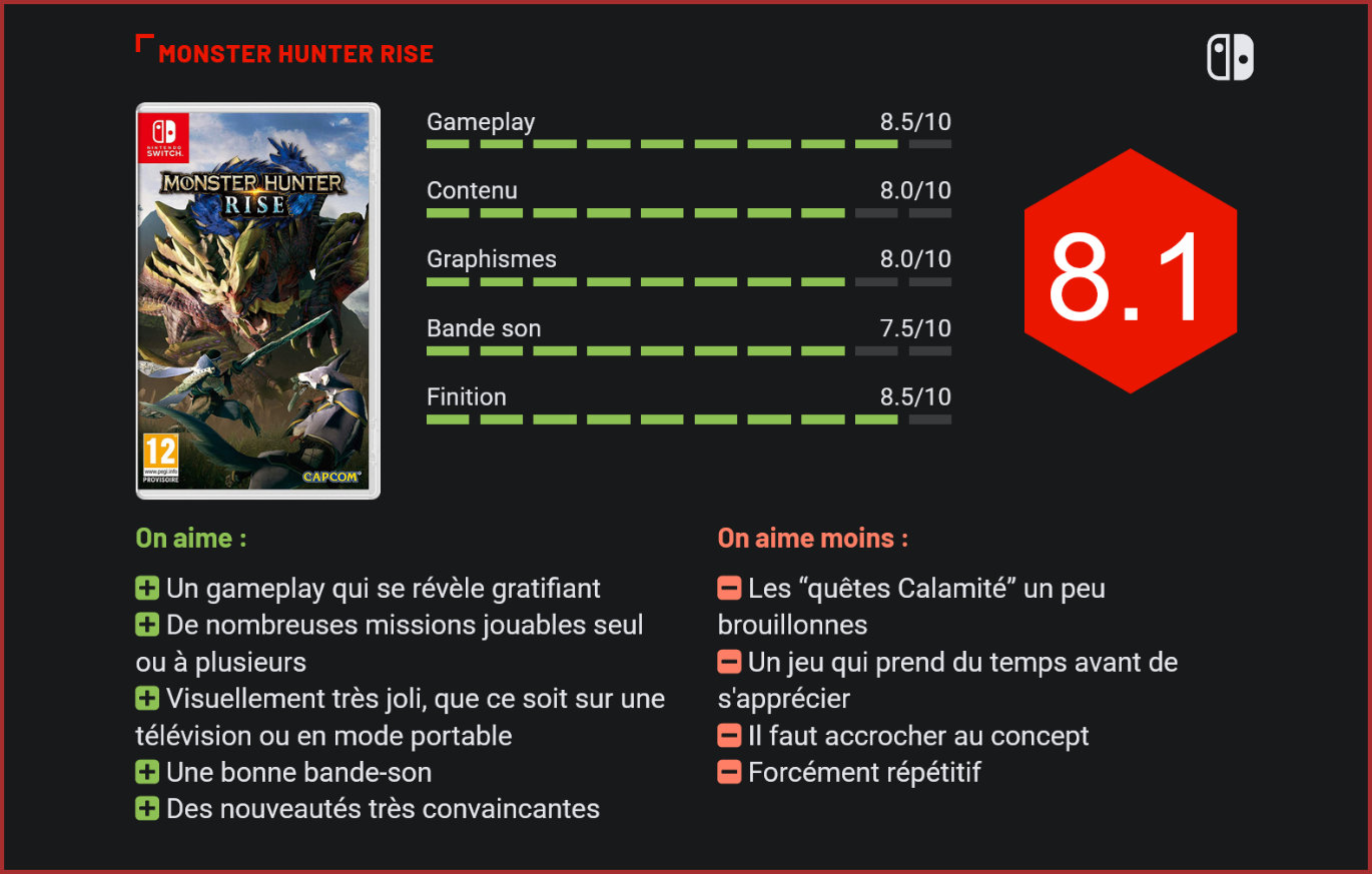 La prolifique licence de Capcom revient pour un nouvel épisode qui sort en cette fin de mois de mars sur Nintendo Switch. Monster Hunter Rise c’est encore et toujours la même formule, mais avec des nouveautés convaincantes. Si la série était surtout réputée au pays du soleil-levant à ses débuts, Monster Hunter a su se faire une place dans le monde entier. Fort du succès de Monster Hunter World, devenu depuis peu le jeu le plus vendu de Capcom, ce n’était qu’une question de temps avant qu’un nouvel épisode débarque. Monster Hunter Rise est ainsi la nouvelle itération de la saga, développée pour l’occasion sur le RE Engine. Le titre sera disponible le 26 mars en exclusivité sur Nintendo Switch, mais cela ne durera qu’un temps puisqu’une version PC a d’ores et déjà été annoncée pour 2022. Le principe de Monster Hunter est simple. Il s’agit d’un action-RPG où le but est de chasser des monstres. Que ce soit seul ou entre amis, il faudra valider des missions de chasse dans différents environnements et obtenir de précieuses ressources permettant de créer de nouvelles armes et armures pour combattre des créatures encore plus dangereuses. Cet épisode Rise se déroule à Kamura, un petit village dont les habitants craignent la “calamité”, un évènement ou d’innombrables monstres se déchainent. La dernière calamité datant de 50 ans avant l’époque du jeu et ayant presque entièrement détruit le village. Nous incarnons alors un chasseur ou une chasseuse qui va aider les habitants de différentes manières. Kamura sert alors de hub central contenant magasins et forgerons capables de vous équiper proprement avant vos chasses. Le village, fortement inspiré du Japon féodal, permet de souffler entre les missions dans une ambiance un peu plus reposante, entouré de personnages hauts en couleurs. Le village de Kamura est le théâtre de cette aventure. Si le scénario est simple, il participe tout de même à renforcer la cohérence de l’univers et il accompagne parfaitement le cœur du jeu, à savoir les missions de chasse. On y retrouve le gameplay caractéristique de la série. Durant chaque mission, il faut explorer la zone, trouver notre proie et se battre tout en gérant notre endurance et l’usure de notre arme. Sur le chemin, il sera possible de ramasser des ressources servant au craft mais également de trouver de nombreux insectes apportant des bonus de statistiques temporaires, il est donc important de bien connaître les environnements. De nombreux objets sont à notre disposition dont des pièges, permettant de s’adapter à toutes les situations. Les sensations de jeu sont lentes et lourdes, demandant de la précision de la part du joueur. Les types d’armes disponibles offrent de réels styles de jeu différents, avec de nombreuses techniques et subtilités à apprendre pour chacun d’entre eux. En plus des traditionnels Palico, notre personnage est également accompagné d’un Chumsky, un gros chien-loup, qui nous assiste aussi en combat. Une autre nouveauté vient du filoptère, sorte de grappin-insecte utilisable à la fois pour se déplacer mais également en combat. Cet outil permet de se remettre sur pied plus rapidement lorsqu’une attaque projette notre personnage, mais chaque type d’arme possède également quelques coups prenant avantage du filoptère. Ces attaques permettent par ailleurs d’augmenter les chances d’étourdir un monstre imposant et ainsi de pouvoir le dompter et d’en prendre le contrôle temporairement. Ces gros monstres sont le réel intérêt de Monster Hunter. De nombreuses créatures font leur retour d’anciens épisodes mais de toutes nouvelles sont également introduites. Chacune d’entre elles sont des boss à part entière, possédant leur propre comportement qu’il faut apprendre pour les terrasser rapidement. Ces combats sont parfois longs et éprouvants, mais la satisfaction ressentie lorsqu’on en ressort victorieux est très agréable. Combattre d’imposantes créatures peut s’avérer difficile mais aussi très gratifiant. D’autres phases de jeu sont disponibles comme les “quêtes Calamité”. Il est question de défendre les murs de la ville façon “Tower Defense” face à une invasion de gros monstres. Se déroulant dans une arène, il est possible de placer des pièges et tourelles sur différentes zones pour empêcher les créatures d’avancer. Le joueur peut alors prendre le contrôle des différentes tourelles posées ou encore se battre de manière plus classique. Ces phases peuvent s’avérer un peu brouillonnes et sont plus adaptées au mode multijoueur qui demandera de la coordination entre les participants. Rise reprend les améliorations apportées par son grand frère World tout en retournant aux origines de la série sur certains aspects. Les zones sont ainsi plus ouvertes et le titre généralement plus ambitieux. Un changement qui permet à cet épisode, pourtant jouable en portable, de prendre une dimension plus importante. Notre Chumsky peut servir de monture pour se déplacer plus rapidement et pour grimper à certains murs, permettant à notre personnage de ne pas dépenser d’endurance. Le filoptère sera également mis à contribution dans l’exploration des zones puisque celui-ci permet de se propulser en hauteur, amenant bien plus de verticalité dans les environnements. Ces nouvelles options rendent l’exploration des zones bien plus agréables et permettent de gagner un temps considérable. Les quêtes Calamité nous mettent face à de nombreux boss en même temps. Le titre est très joli à regarder. Il n’échappe cependant pas à quelques soucis techniques comme de l’aliasing assez présent. Pourtant, Monster Hunter Rise bluffe par son rendu en mode portable très fidèle à ses visuels affichés sur un écran. La bande-son est également un point positif. Tantôt épiques, tantôt apaisants, les morceaux utilisent souvent 