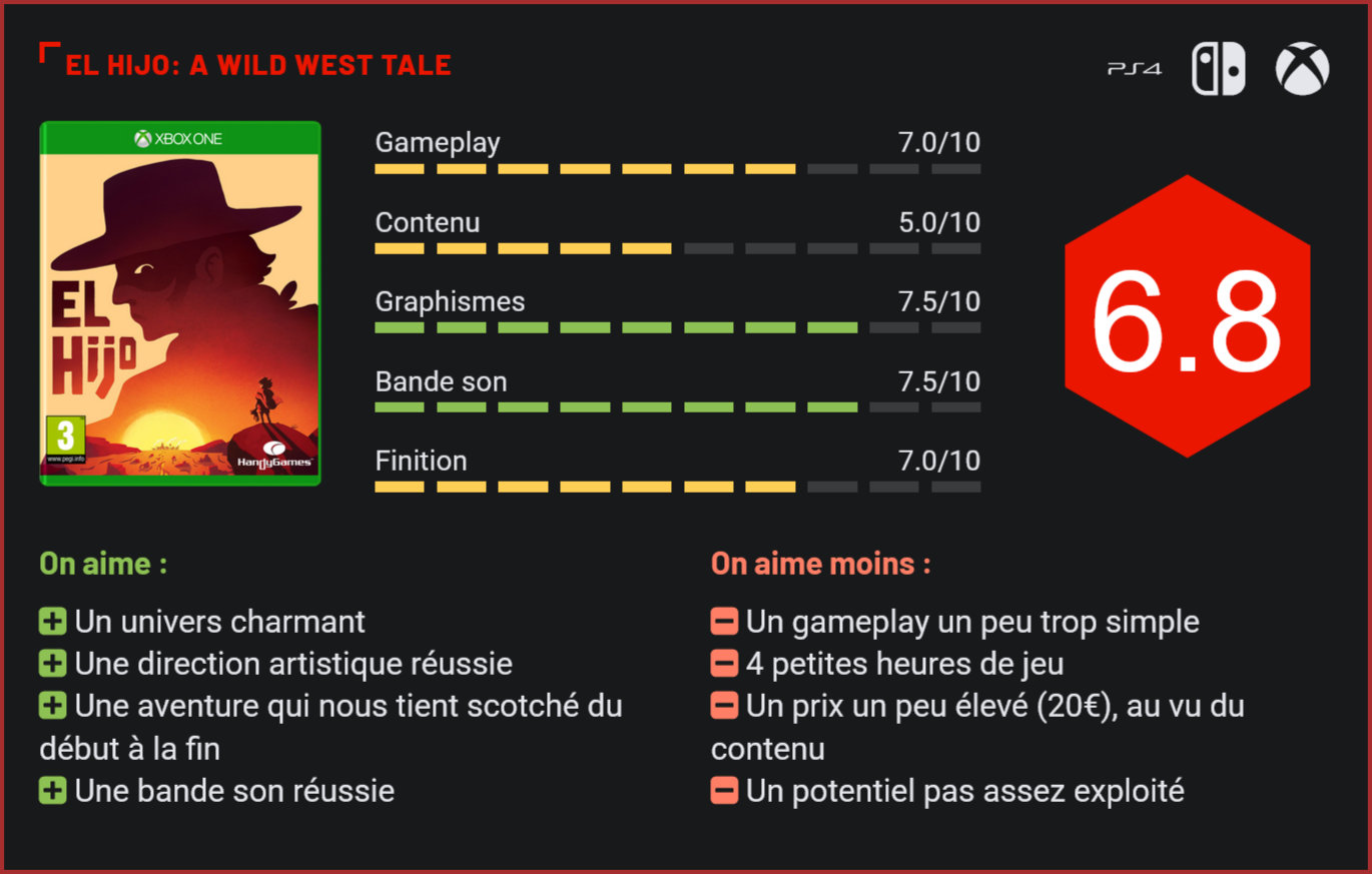 Après avoir séduit les joueurs PC, le sympathique El Hijo : A Wild West Tale débarque sur consoles. Le jeu d’infiltration de Quantumfrog et Honig Studios fait partie de ces jeux à petit budget, à la fois rafraichissants et délicieusement séduisants. Sorti sur PC en décembre dernier, El Hijo: A Wild West Tale a enfin droit à une sortie sur consoles, sur PS4, Xbox One et Switch. Le jeu d’infiltration d’Honig Studios et QuantumFrog était déjà parvenu à attirer l’attention des amateurs de jeux indépendants à l’époque avec sa patte graphique stylée et son approche unique du genre. Les joueurs consoles pourraient eux aussi craquer pour ce titre atypique. Se déroulant dans un univers de western, El Hijo: A Wild West Tale raconte l’histoire d’un jeune garçon de 6 ans et de sa mère dont la maison est incendiée par des bandits. Craignant le pire, la mère laisse alors son enfant dans un monastère isolé pour le protéger. L’enfant, “El Hijo”, décide de s’échapper et de retrouver sa mère par la simple force de son agilité, de sa discrétion et de sa ruse. D’un univers pourtant connu pour son animosité en résulte un jeu d’infiltration non-violent. Le but est d’amener le petit garçon à la fin des niveaux sans se faire attraper. Sa petite taille lui permet de se faufiler dans de nombreuses cachettes mais il possède également des accessoires pour l’aider. Son lance-pierre permet de casser certains objets, des jouets peuvent être utilisés pour attirer l’attention des gardes… Nous avons également un oiseau à notre disposition qui, une fois envolé, nous permet d’accroître notre champ de vision, de voir celui des gardes mais également de mettre en valeur les objets avec lesquels nous pouvons interagir. La patte graphique est pleine de charme. Le jeu reste radicalement élémentaire dans son approche de l’infiltration. Il est simplement question ici d’éviter les personnages qui vous font obstacle en se réfugiant dans l’ombre et en utilisant le décors et vos accessoires de manière efficace. Quelques énigmes viennent pimenter le tout mais le titre reste accessible et ne propose qu’une seule difficulté qui n’est pas très élevée. Même s’ils ne sont pas très différents les uns des autres, les ennemis sont tout de même progressivement plus difficiles à éviter. Les moines du monastère doivent nous courir après pour nous attraper, ce qui nous laisse l’occasion de leur échapper, mais les ennemis suivants sont armés, ce qui forcera notre personnage à se rendre dès qu’il se fait repérer. Les chiens que l’on rencontrera plus tard dans l’aventure seront encore plus complexes à éviter. Malgré tout, de nombreux checkpoints sont dispersés dans les niveaux, nos échecs ne sont donc pas du tout punitifs. Il faudra souvent ruser pour progresser dans l’histoire. Cette aventure s’avère assez courte et prend environ quatre heures à boucler lors d’une première découverte. Les niveaux sont tout de même parsemés de collectables sous forme d’enfants esclaves à retrouver, ceux-ci sont alors inspirés par votre envie de liberté. Cette aventure principale est le seul et unique contenu disponible dans le jeu, ce qui s’avère être un peu court pour le prix demandé. Ces quatre heures sont pourtant bien suffisantes pour parcourir le titre et sa proposition trop simpliste. Les possibilités du joueur ne sont malheureusement pas très nombreuses et les niveaux restent assez linéaires. L’aventure propose parfois des phases de jeu un peu différentes. Nous aurons, par exemple, l’occasion à plusieurs reprises d’incarner la mère d’el hijo, plus robuste et plus rapide que son fils. Ces moments se jouent un peu différemment, ce qui amène de la variété à l’ensemble. Mais ce n’est pas suffisant puisque le concept du jeu tourne très vite en rond. Le jeu est court, comptez 4 heures pour en voir le bout. El Hijo est pourtant visuellement très charmant. Le titre arbore un style graphique simple et mignon, un mélange très efficace. Les décors sont détaillés, colorés et lisibles. L’ambiance des niveaux reste plus ou moins la même au fil du jeu, alternant entre les décors orangés du désert et un bleu sombre pour les intérieurs et souterrains. Sa bande-son vient encore plus appuyer le trait “western” du titre. Si les musiques sont souvent discrètes, elles accompagnent parfaitement les phases de jeu relativement calmes. De nombreux bruitages et clips vocaux donnent de l’identité aux personnages que vous devez éviter. Le jeu utilise également des cinématiques animées du plus bel effet pour raconter son histoire. Si son ambiance est réussie et que l’aventure est satisfaisante, El Hijo laisse cependant un sentiment de “trop peu” tant son gameplay et son concept aurait pu être poussé plus loin. Le jeu ne laisse que peu de place à votre inventivité pour échapper aux différents ennemis, la faute à un level design un peu trop dirigiste. Le peu de rejouabilité qu’il propose n’enlève pas le goût amer du tarif auquel il est proposé. Si le jeu est beaucoup plus agréable à jouer au pad qu’au combo clavier/souris sur PC, les développeurs n’ont toutefois apporté aucune nouveauté côté contenu au jeu. Pas de nouveau chapitre donc ni d’optimisation d’ailleurs pour les consoles “next-gen”. Le rendu reste toutefois très joli sur toutes les plates-formes et surtout, le titre est parfaitement adapté à une prise en main au pad. Conclusion El Hijo: A Wild West Tale est un jeu d’infiltration non-violent prenant place dans un univers western qu’il arrive très bien à s’approprier. Avec sa direction artistique réussie, une très bonne présentation et un sound design efficace, El Hijo se présente comme un divertissement parfaitement maîtrisé de bout en bout. L’aventure nous plonge dans la peau d’un petit garçon de 6 ans devant traverser de 