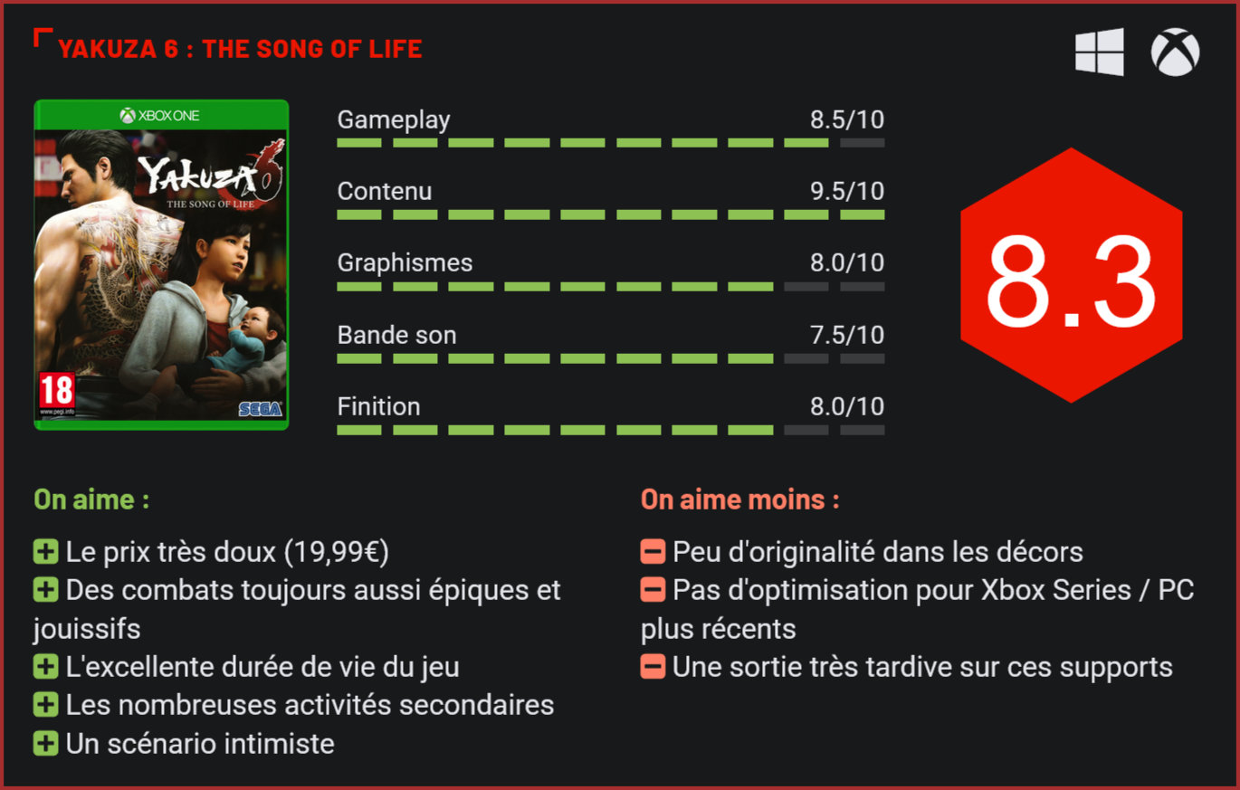 Près de trois ans après être sorti sur PS4, Yakuza 6 : The Song of Life débarque enfin sur PC et Xbox. L’occasion pour les joueurs qui étaient passés à côté de cette petite pépite d’enfin découvrir l’un des meilleurs volets de la franchise. Sega aura décidément pris tout son temps pour porter sa saga sur PC et Xbox. Trois longues années. C’est le temps que les propriétaires de la console américaine auront du patienter pour enfin découvrir le dernier chapitre de la saga sur leurs machines… Une lenteur qui s’explique certainement en grande partie par le succès mitigé de la console au Japon… La bonne nouvelle, c’est que s’il sort tardivement sur le support, Yakuza 6 : The Song of Life a le mérite d’être proposé dès le premier jour dans l’offre Gamepass, au même titre d’ailleurs que tous les autres volets de la franchise. Ceux qui préfèrent l’acheter auront la bonne surprise de découvrir que le titre est vendu à un tarif assez bas : 19,99€. Il ne faudra en revanche pas s’attendre à de grosses améliorations par rapport à la version PS4. Pas d’optimisation “next-gen” à l’horizon sur Xbox Series ni de boost de framerate sur PC. Les combats restent l’une des grandes réussites du jeu. L’arrivée du jeu sur Xbox et PC n’en reste pas moins une bonne nouvelle pour les fans, qui attendaient avec impatience le dernier chapitre de cette série (si l’on exclut le septième volet, qui se positionne presque comme un reboot pour la franchise). Les trois précédents épisodes étaient sortis sous la forme d’une “collection”, la Yakuza Remastered Collection. Nous nous étions d’ailleurs étonnés à l’époque que Yakuza 6 ne figure pas dans ledit pack. Visiblement, les développeurs avaient besoin d’un peu plus de temps pour peaufiner pour le portage. On ne va pas vous le cacher, en l’espace de trois longues années, Yakuza 6 : The Song of Life a pris quelques rides. Ceci étant dit, le titre n’en reste pas moins une conclusion épique pour la série, qui brille surtout par son système de combat extrêmement nerveux et son scénario très accrocheur. L’histoire prend place plusieurs années après les événements narrés dans le cinquième volet. Le joueur incarne de nouveau Kazuma Kiryu, un ex-yakuza qui tente de se réintégrer dans la société et devra passer par la case prison pour expier ses fautes et ce, malgré son désir de s’occuper de l’orphelinat qu’il a mis sur pied. Malheureusement, durant ses trois ans d’incarcération, la jeune Hakura, la fille de son seul et unique amour, ayant quitté la vie de star se voit harcelée et préfère s’enfuir. À sa sortie, le Dragon de Dojima aura la triste surprise de trouver Hakura dans le coma. Kiryu va devoir remettre son costume de gangster afin de comprendre les circonstances de cet accident et découvrir qui est le père de l’enfant de sa protégée. L’aventure est parfaitement maîtrisée, de bout en bout. Dès les premiers instants du jeu, on comprend que Yakuza 6 nous transportera dans une aventure familiale sur fond de guerre de territoire d’une grande violence. Si Kiryu veut raccrocher, il lui faudra affronter ses derniers ennemis et protéger les êtres qui lui sont chers. Ses thématiques sont parfaitement retranscrites dans cet épisode. On retrouve une nouvelle fois le talent des équipes de Ryū ga Gotoku Studio au niveau du scénario; complexe, humain et profond. Profondément philosophique, le scénario du jeu n’hésite pas à mettre l’accent sur les liens familiaux qui dépassent les liens du sang. La série des Yakuza se base sur un moteur central, celui de la progression en monde ouvert, progression entrecoupée par de nombreux affrontements au corps à corps, dans le plus pur style des beat them all classiques. Pour ce nouvel épisode, l’accent a été mis sur les combats qui sont moins brouillons et plus visibles. On notera que la caméra est plus mobile, ce qui permet de suivre ses ennemis. La progression du personnage de Kiryu a été revue pour être moins complexe. Désormais, affronter des malfrats, poursuivre des quêtes principales et secondaires, ainsi que manger des plats et boissons permettent de gagner de l’expérience et de monter ses compétences, comme la force, agilité, esprit, technique ou le charme. Monter telle ou telle compétence aura de réelles conséquences sur les caractéristiques de notre personnage qu’il faudra, donc, choisir avec rigueur. Il est également possible de débloquer de nouvelles techniques d’arts martiaux pour des combats toujours plus épiques. Les affrontements sont plus fréquents que dans les précédents épisodes de la série. En se promenant dans les rues reconstruites du Japon, Kiryu fera face de nombreuses fois à des caïds qui veulent en découdre. A mi-chemin entre le GTA-like et le beat them all, Yakuza 6 est un mélange de genres nerveux qui se démarque surtout au niveau de son système de combat racoleur et ses nombreuses activités secondaires. Le concept n’a dans le fond pas beaucoup évolué depuis quelques épisodes déjà, puisqu’il s’agira toujours d’accumuler de l’expérience pour améliorer les compétences de son personnage et maîtriser ainsi de nouveaux mouvements. Visuellement, le jeu a un peu vieilli, mais il reste très agréable à la vue. Comme dans le précédent volet, on retrouve le principe de la transe, le Heat Action, qui aura le don de décupler les compétences de Kiryu. La possibilité de pouvoir interagir avec les objets qui se trouvent à proximité reste une option qui ajoute de la profondeur aux combats. Notre personnage pourra ainsi récupérer différents objets dans la rue pour les projeter à la figure de ses ennemis. Autre gros point fort de la franchise : l’abondance de quêtes secondaires. Celles-ci ont d’ailleurs le mérite d’être très diversifiées. Entre deux missions principales, le joueur pourra 