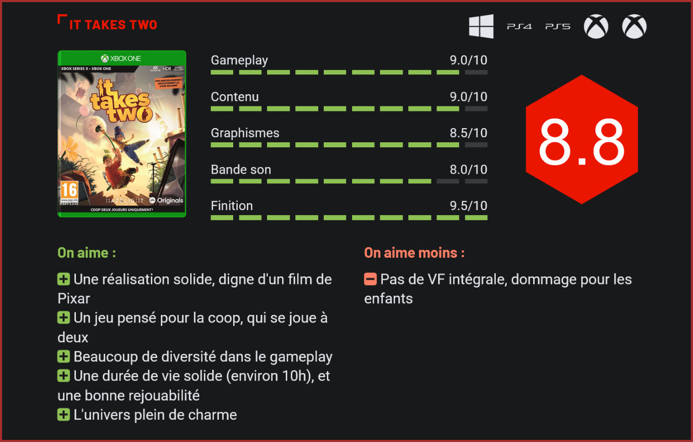 Hazelight, le petit studio de développement suédois qui se cachait derrière le sympathique A Way Out nous revient avec sa nouvelle création. Plus ambitieux que le précédent projet du studio, It Takes Two est incontestablement l’une des très bonnes surprises de ce début d’année 2021. S’il n’était pas parfait, A Way Out n’en restait pas moins un très bon jeu d’action coopératif, sorti de l’esprit du délirant Josef Fares, un cinéaste qui a choisi de ranger sa caméra au placard pour se consacrer à sa nouvelle carrière de directeur de projet dans le jeu vidéo. Après A Way Out, il nous revient donc avec son nouveau projet, le bien nommé It Takes Two, un jeu d’aventure coopératif qui reprend dans les grandes lignes les ficelles de sa précédente création tout en nous transportant dans un univers radicalement différent. Dans It Takes Two, les combats de boss vous feront affronter des ennemis titanesques. Car avec It Takes Two, le studio Hazelight nous livre un jeu qui se destine à une audience plus jeune. Petits et grands pourront apprécier ensemble cette formidable aventure qui n’aurait rien à envier à un film d’animation de Pixar ou Dreamworks. Son scénario n’a pourtant rien de très folichon. Profondément affectée par le divorce de ses parents, une jeune fille donne sans le savoir vie à ses deux poupées de chiffon, qui sont les répliques parfaites de ses parents. Transportés sans trop savoir pourquoi ni comment dans le corps de ces répliques miniatures, les deux parents devront coopérer pour tenter de revenir dans leurs corps. Leurs mésaventures les amènera à explorer les alentours de leur maison et à affronter des créatures de toutes sortes. Le message du jeu est donc touchant puisqu’It Takes Two, c’est avant tout l’histoire d’un divorce et le combat d’une jeune fille pour tenter de réconcilier ses deux parents. C’est toutefois bien l’univers du jeu qui séduira les joueurs avec ses décors colorés, ses ennemis délirants et ses superbes panoramas. On est transporté dans la production du studio suédois comme si on l’était dans un film de Pixar. Les séquences de jeu sont très variées dans It Takes Two. Comme nous l’avons dit plus tôt, It Takes Two est un jeu qui a été pensé pour être joué à deux. Inutile d’espérer y jouer seul. Vous pourrez y jouer à deux en local, ou avec un ami à distance, grâce au Pass ami, qui permet de partager l’expérience avec un proche… Pratique en ces temps de confinement! Côté gameplay, on est ici face à un jeu d’aventure qui lorgne tout de même beaucoup du côté du jeu de plates-formes. It Takes Two mélange toutefois brillamment les genres et n’hésite pas d’ailleurs à alterner les séquences de jeu à un rythme effréné. On passe d’une séquence de plates-formes à une course-poursuite, puis à un combat de boss avant de devoir résoudre un énigme et participer à un parcours d’obstacles. Le rythme effréné du jeu et la diversité des séquences font qu’on ne s’ennuie pas une seule minute dans It Takes Two. La direction artistique du jeu est superbe. Plus surprenant encore, on aurait pu s’attendre à ce que lesdites séquences ne soient pas toutes du même niveau… Mais le studio Hazelight est parvenu à les rendre toutes intéressantes. Les contrôles sont précis durant les séquences de plates-formes, qui ne sont ni trop longues ni trop difficiles, les combats de boss ont intenses, les courses-poursuites funs et accessibles, les petites énigmes nécessiteront elles quelques minutes d’attention à chaque fois… Rien n’est trop compliqué ni trop simple. Le dosage de la difficulté est juste parfait pour un adulte. Pour les plus petits, le titre reste accessible, même si certaines séquences nécessiteront plus d’attention. Quelque part à mi-chemin entre un film de Pixar, un Conker pour son univers décalé et sa diversité côté gameplay, It Takes Two se pose comme un cocktail très rafraichissant idéal pour animer plusieurs soirées entre amis, en couple, ou avec les enfants. De par son univers, le jeu rappelle les productions de Pixar. It Takes Two parvient à faire mouche grâce à son univers, sa direction artistique impeccable, la diversité de ses épreuves mais aussi sa construction brillante. Comme nous l’avons dit, le rythme du jeu est parfaitement maîtrisé, de sorte à ce qu’on ne s’ennuie jamais. Mais là où le studio scandinave brille, c’est bien dans sa façon de parvenir à nous surprendre sans cesse avec des mécanismes qui changent sans arrêt. Les combats de boss par exemple vous forceront à adopter à chaque fois une approche radicalement différente. Les séquences de plates-formes ajoutent continuellement de nouveaux éléments de gameplay et des mini-jeux délirants viennent régulièrement renverser complètement le concept du jeu puisque dans ceux-ci, il ne sera plus question de s’entraider mais de s’affronter en duel… Par exemple, dans un jeu de “frappe une taupe” dans lequel l’un des deux joueurs incarnera une taupe et l’autre tentera de l’écraser avec son marteau. La plupart de ces mini-jeux sont si drôles qu’on y reviendra volontiers plusieurs fois d’affilée… Autre atout du jeu : malgré son petit prix (39,99€), It Takes Two réserve une expérience de jeu très solide. Comptez 10h environ pour en voir le bout. L’aventure est d’ailleurs tellement bien maîtrisée qu’on y reviendra volontiers, ne serait-ce que pour débloquer tous les mini-jeux, qui ne sont pas accessibles immédiatement. Les deux personnages se complètent parfaitement. D’un point de vue purement technique, It Takes Two est également une très belle réussite. Artistiquement tout d’abord, avec sa direction artistique très inspirée qui nous rappelle souvent les productions de Pixar. Esthétiquement ensuite, avec son moteur graphique parfaitement optimisé pour les deux gén