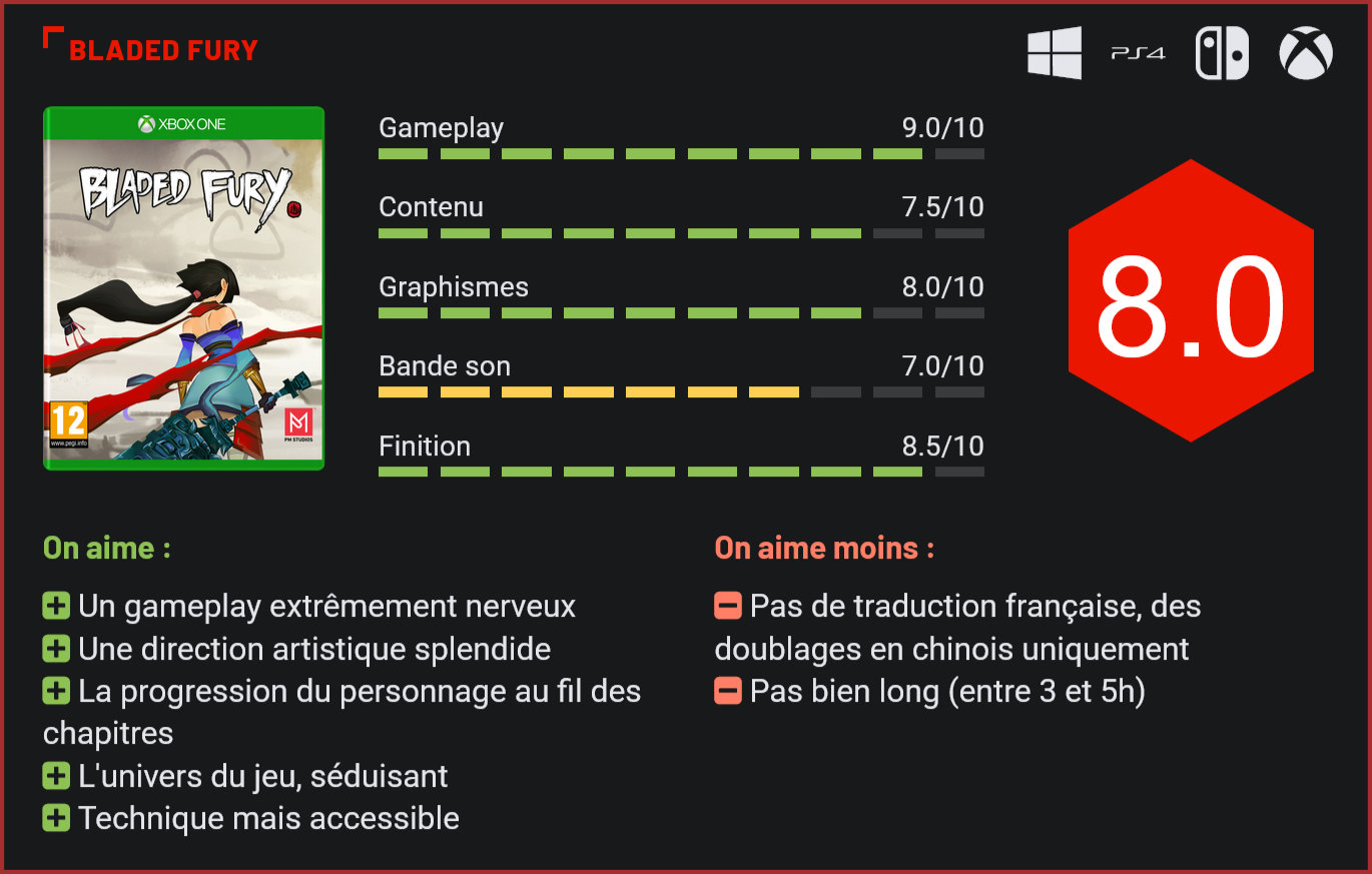 Déjà derrière quelques jolies petites créations, le studio chinois NExT livre avec Bladed Fury le jeu qui pourrait bien le positionner sur la scène du gaming. Les studios chinois sont de plus en plus nombreux à se lancer sur des projets “consoles”, et ce alors que la plus grosse partie de leur clientèle se trouve sur mobile ou sur PC. Avec Bladed Fury, le studio NExT nous propose ni plus ni moins que de découvrir une partie de la culture et de la mythologie chinoise à travers un beat them all en 2D d’une rare intensité. Artistiquement, le jeu est très réussi. L’aventure prend place dans la Chine antique. Dans la peau d’une jeune princesse, amenée à fuir son royaume après avoir tué son propre père, contrôlé par un esprit maléfique, le joueur devra tenter de découvrir la vérité sur ce drame familial tout en découvrant un pan entier de la mythologie chinoise, un univers relativement méconnu des gamers, qui se révèle donc assez rafraichissant. Bladed Fury n’hésite d’ailleurs pas à se distinguer des autres productions par sa direction artistique, très inspirée des arts chinois, avec de superbes illustrations dessinées à la main. Bladed Fury semble sorti d’un livre de contes pour enfants. Visuellement, le jeu est superbe. Les décors sont soignés à l’extrême avec un sens du détail qui surprend à chaque instant. Les animations des personnages sont également superbes. C’est très clairement ce qui donne toute sa personnalité au jeu. Le scénario nous est dévoilé progressivement à travers les dialogues de l’héroïne. Toutefois, c’est bien au niveau de son gameplay que le jeu de NExT Studios surprend le plus agréablement. Bladed Fury se présente comme un beat them all old-school extrêmement nerveux, qui n’aurait rien à envier à un Ninja Gaiden ou un Devil May Cry au niveau de son intensité. A la différence de ces deux titres, Bladed Fury est toutefois un jeu en 2D à straffing horizontal, un peu à la façon d’un Castlevania. Les références s’arrêtent là car dans sa construction, Bladed Fury parvient à se démarquer de tous les autres titres en mélangeant différentes idées. Les combats sont intenses et plutôt techniques. Les frappes légères sont portées avec le bouton X, les frappes lourdes avec le bouton Y, mais toute une série de combos sont possibles. Le personnage peut sauter, virevolter dans les airs, effectuer des attaques au sol et dans les airs, dasher pour éviter une attaque et se protéger à l’aide d’un bouclier. Les combats sont extrêmement intenses et le jeu très fun. Les séquences de combat sont entrecoupées par quelques puzzles pas bien compliqués, quelques séquences de plates-formes, des dialogues et des combats de boss, qui sont l’une des grandes réussites du jeu. Si d’apparence, Bladed Fury est donc un jeu assez simple d’accès, il se révèle en réalité beaucoup plus technique qu’il n’y paraît. On notera d’ailleurs que le sentiment de progression est constant dans le jeu puisqu’au fil de sa progression, le joueur débloquera de nouvelles techniques de combat avec les âmes récupérées dans une sorte de boutique. Il obtiendra également de nouvelles super-attaques dévastatrices. Le jeu se montre vite très intense dans ses combats. Bladed Fury parvient donc à convaincre à la fois avec son gameplay très nerveux et technique et sa réalisation très solide. Attention toutefois, le jeu est entièrement en chinois, avec des sous-titres en anglais. C’est bon pour l’immersion, mais tout le monde ne maîtrise pas forcément suffisamment la langue de Shakespeare pour s’y plonger. Bladed Fury est également un titre assez court. Comptez entre 3 et 5h pour finir le mode solo, selon le niveau de difficulté choisi. C’est dans la moyenne pour le genre, mais on n’aurait clairement pas été contre l’un ou l’autre à-côté. A 19,99€, le titre n’en offre pas moins une expérience très solide. Conclusion Sorti de nulle part, Bladed Fury est pourtant l’une des très bonnes surprises de ce début d’année 2021 et incontestablement un excellent beat them all, qui n’hésite pas à mélanger brillamment des éléments empruntés à différents genres. Lorgnant tantôt du côté du Castlevania-like avec ses combats de boss intenses et sa progression non-linéaire, tantôt du côté du jeu de plates-formes avec ses petites énigmes et ses séquences d’adresse, le jeu de NExt Studios est une très belle réussite, tant au niveau de son gameplay, à la fois fun et technique, que de sa réalisation, pleine de charme avec sa direction artistique inspirée et son style unique. Attention toutefois, le jeu est en chinois avec un sous-titrage en anglais. L’aventure n’est également pas bien longue puisqu’il ne faudra que quelques heures pour en voir le bout. Malgré tout, on vous conseille de ne pas passer à côté de cette petite pépite.