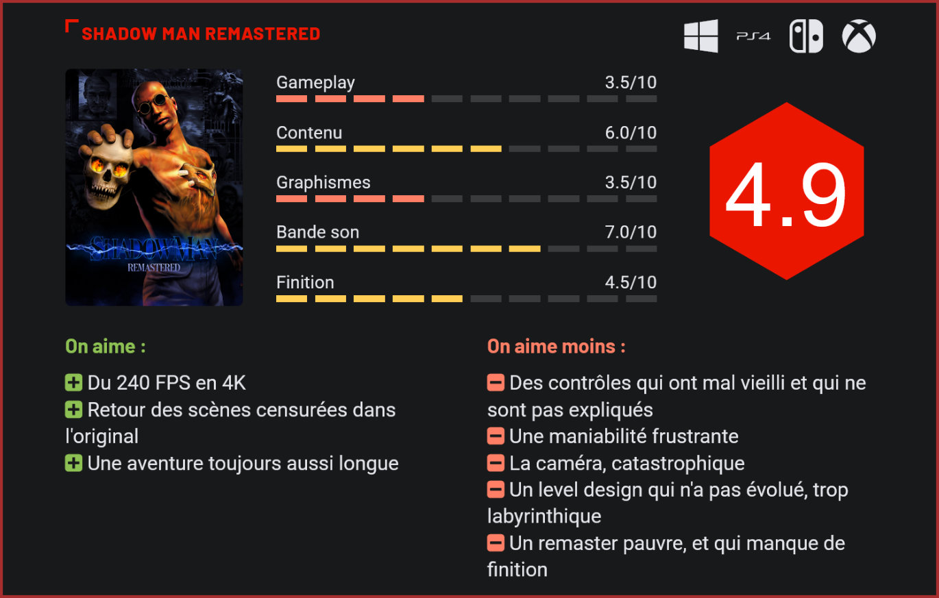 Réédition d’un titre culte de la Nintendo 64 et de la Dreamcast, Shadow Man Remastered entend bien honorer le succès de son aîné. La tâche s’annonce malheureusement ardue … Tout joueur possède une liste de jeux chers à son cœur, qui ont bercé ses premiers émois dans le secteur vidéoludique. Shadow Man fait probablement partie de cette liste pour de nombreux gamers. Sorti en 1999 sur Nintendo 64, Dreamcast et PlayStation, Shadow Man parvint à convaincre presse et public grâce à son ambiance atypique et un gameplay fortement inspiré d’une autre pointure du genre, à savoir Tomb Raider. Habitué dans la réédition de titres cultes, le studio Nightdive s’est logiquement attaqué à ce classique souvent méconnu des années 90. Meilleure résolution, plus de fluidité et contenu supplémentaire sont au programme, tandis que le cœur même du jeu reste intact, et ce, afin de fournir l’expérience la plus similaire possible à celle procurée 22 ans plus tôt. Un choix qui est, somme toute, contestable, surtout si l’on prend en compte l’évolution des standards en matière de level et de game design. C’est un fait : Shadow Man a vieilli, et plutôt mal… Il y a 20 ans de cela, Shadow Man fut encensé pour ses nombreuses qualités, et notamment en terme de gameplay. Le titre se rapprochait énormément d’un certain Tomb Raider à travers sa maniabilité tandis que les nombreux mouvements et animations que possédait le personnage étaient de très bonne facture. Mais ça, c’était il y a 20 ans. Les premières aventures de Lara Croft ont énormément vieilli et, par conséquent, Shadow Man également. Si vous ne le saviez pas, Shadow Man est un jeu d’action-aventure dans la plus pure tradition de ce qui se faisait dans les années 1990. Vous explorez des niveaux labyrinthiques à la recherche de collectibles en tout genre sans jamais savoir vers où vous vous dirigez, pourquoi vous le faites ou comment vous y prendre. En effet, les jeux de l’époque ne s’étaient pas encore imprégnés de la mode des mini-cartes et les tutoriels se faisaient principalement dans le livret papier plutôt qu’à l’écran. Autant de lacunes qui font que Shadow Man est presque injouable aujourd’hui. La modélisation, la jouabilité et l’expérience de jeu restent très ancrées dans les années 1990, pour le meilleur et (surtout) pour le pire. On va pester à de très nombreuses reprises face à un gameplay resté coincé en 1999. Les déplacements de Mike LeRoi sont d’une rigidité à toute épreuve. Si courir face à vous ne pose aucun problème (et encore), on regrettera très vite les fois où il faut faire marche arrière, avec de légers sauts, ou les déplacements en diagonale, qui ralentissent toujours autant. De plus, les déplacements dans l’eau bloquent automatiquement les orientations, tandis qu’il est impossible de tourner la caméra lorsque le personnage est accroché à une corniche. Toujours semblable à Tomb Raider, Shadow Man vous demandera à de nombreuses reprises de sauter de “plateforme” en “plateforme” pour progresser dans les niveaux. Mais comme son illustre modèle, la précision est de mise et nombreuses seront les fois où vous louperez le coche et mourrez. C’est particulièrement éreintant, surtout lorsque l’on sait que vous allez être ramené à un checkpoint très éloigné du lieu de votre mort. Certes les développeurs ont ajouté un système de sauvegarde au sein du titre, mais nous n’allons quand même pas sauvegarder à chaque fois avant de sauter. En ce qui concerne le cœur du jeu, à savoir sa trame principale, on reste sur ce qui était proposé 20 ans plus tôt. Le titre nous proposait une aventure à boucler en une petite vingtaine d’heures dans sa totalité, soit une très belle proposition pour l’époque. On garde ici la même durée de vie, à laquelle les développeurs ont eu la malice d’ajouter des scènes originellement supprimées. En effet, en farfouillant dans les codes et fichiers du titre, le studio Nightdive s’est aperçu que trois niveaux avaient finalement été retirés du montage final. Qu’à cela ne tienne, ces trois niveaux ont finalement été intégrés à cette version Director’s Cut de Shadow Man, et ce n’est pas pour nous déplaire. Parmi ces “nouveaux” niveaux, on retrouve une salle d’expérimentation intégrée à l’asile, Salvage Yard dans le désert du Mojave ainsi que Summer Camp, en Floride. Trois parties de niveaux venus agrémenter la durée de vie, mais qui contiennent également leurs propres âmes noires, à retrouver ici-et-là. Comptez toujours une vingtaine d’heures pour boucler l’aventure. L’un des points sur lesquels Shadow Man a le plus changé avec ce remaster, c’est incontestablement son aspect visuel. Enfin, on va plutôt parler ici de remise au goût du jour sans bouleverser le tout, puisque le titre ne change pas d’un iota d’un point de vue de sa modélisation. On garde les mêmes éléments 3D, très anguleux et peu esthétiques, identiques à ceux proposés en 1999. Le résultat faisait mouche autrefois, mais n’est clairement plus d’actualité et accuse sérieusement le poids des années. Nous évoquerons dès lors le renouvellement technique plutôt que la refonte visuelle pour ce “nouveau” Shadow Man. Afin de garder un matériau le plus brut et le plus fidèle possible à l’original, les développeurs ont en effet fait le pari osé de ne pas toucher aux modélisations et de proposer un titre en adéquation avec les technologies actuelles. Nous avons dès lors droit à un titre qui supporte désormais la 4K, en lieu et place de l’ancienne résolution propre aux Nintendo 64 et PlayStation 1. Un ajout bienvenu, surtout lorsqu’il est couplé aux 240Hz que le titre exhibe fièrement. Il s’agit évidemment d’ajouts de taille, qui n’arrivent pas seuls : antialiasing, HDR et ombres portées dynamiques sont aut
