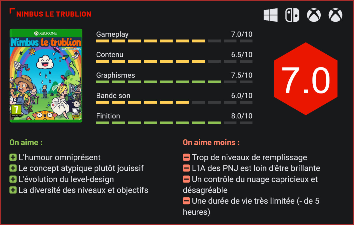 Sous ses airs de nuage tout ce qu’il y a de plus mignon se cache un redoutable nimbus prêt à tout pour ruiner la journée de tous ceux qui auront la malchance de le croiser. Le moins que l’on puisse dire, c’est que Nimbus le Trublion – Rain on your Parade – repose sur un concept surprenant. Développé par le petit studio Unbound Creations, Nimbus le Trublion – Rain on your Parade en anglais – prend la forme d’un puzzle-game pour le moins atypique. Dans ce jeu vidéo, vous incarnez un joli petit nuage dont la quête est de ruiner la vie de tout le monde. Un principe de base plutôt étonnant, mais particulièrement jouissif. La pluie n’a jamais été aussi jouissive. À première vue, le jeu est plutôt modeste, notamment au niveau de son scénario. Ce dernier se résume à un père raconte à son fils son étrange rencontre avec un nuage et le plaisir qu’ils ont eu à « pourrir les affaires des autres ». D’ailleurs, le jeu pourrait se résumer à cela : pourrir les affaires des autres. Mais le jeu cache tout de même une certaine forme de richesse au niveau de ses environnements et de ses objectifs pour chaque niveau. Nimbus le Trublion propose en effet une cinquantaine de niveaux et chacun d’eux arbore un décor et des objectifs à atteindre tous différents. Certains niveaux proposent également des défis supplémentaires pour débloquer de nouveaux accessoires, afin de personnaliser Nimbus. Le gameplay est assez rudimentaire, vous devez simplement guider le nuage sur la carte et pleuvoir ici et là, afin de remplir vos objectifs. Au fur et à mesure, le Nimbus disposera de nouvelles compétences pour faire pourrir des plantations, rouiller des voitures ou encore faire exploser des expériences de chimie dans une école. Le joueur devra jongler entre les différentes pluies possibles pour faire exploser des machins grâce à la foudre ou ruiner une plantation grâce à ses gouttes radioactives. Il y a vraiment tout ce qu’il faut pour nuire aux « Zumains ». Le moins que l’on puisse dire c’est que les développeurs en avaient gros sur la patate. Malgré sa cinquantaine de niveaux, Nimbus le Trublion propose un nombre important d’objectifs différents à réaliser. Comme dit précédemment, le tout est très diversifié. Il est assez rare d’avoir deux fois le même objectif ce qui est plutôt un exploit étant donné que le jeu compte tout de même une cinquantaine de niveaux. Les développeurs de Nimbus le Trublion n’ont pas manqué d’imagination pour pourrir la vie des gens ou détruire les décors ou presque. On sent en effet que certains niveaux sont là pour remplir le jeu et c’est bien dommage. Si certains objectifs sont tout aussi absurdes que le jeu, difficile ne pas y voir un moyen pour les développer d’allonger la durée de vie très courte de Nimbus le Trublion. Comptez un peu moins de 5 heures pour le finir. Certains niveaux sont assez courts, voire trop courts, en plus d’être parfois trop simples et de manquer de clarté. On aurait aimé avoir plus de challenges, plus de défis à relever. On regrette également que les PNJ soient animés par une IA des plus basiques. Ces derniers sont complètement idiots et bien que ça soit le jeu qui veut ça, c’est parfois trop accentué. Déplacer notre ami nuage ne sera pas non plus de tout repos. C’est en effet loin d’être agréable et ce dernier est plutôt lent. Faire rentrer des moutons dans un enclos à coup de pluie se révèle être une tâche bien compliquée tant ces derniers se bousculent étrangement et restent figés dans les barrières. Le jeu est en effet loin d’être exempt de défauts, mais cela reste tout de même très correct. Le jeu regorge d’environnements différents. Nimbus le Trublion est assez ambivalent dans le sens où il est à la fois très mignon avec une direction artistique « craft » très enfantine, très colorée et des objectifs de jeu plutôt pervers, sadiques et immoraux. Si le jeu est loin d’être techniquement parfait, que ses graphismes sont parfois grossiers, l’expérience n’en reste pas moins rafraichissante et on prend plaisir à pourrir la journée des écoliers, des enfants lors d’une fête d’anniversaire ou encore celle de gentils petits fermiers. Nimbus le Trublion est l’excuse parfaite pour évacuer toute sa frustration sans passer pour un fou. Le gros plus du jeu est qu’il propose de nombreuses notes d’humour. Les différents personnages disposent chacun de leur propre personnalité et n’hésitent pas à briser le 4e mur pour faire des blagues aux joueurs et faire des clins d’œil à la pop’culture, des mèmes en passant par les jeux vidéo les plus cultes (Legend of Zelda, Metal Gear Solid, Counter Strike…). C’est chouette, on se prend à rechercher les clins d’œil dans la moindre ligne de texte, mais aussi dans les quêtes et les décors. Nimbus le Trublion regorge de détails amusants. Le côté mignon du jeu se trouve tant dans le visuel du jeu, avec ses poupées de laine, son nuage en carton, que dans l’ambiance musicale qui est elle aussi très enfantine. Cela vient souligner le côté absurde du jeu. En revanche, si l’on retrouve la même diversité dans les décors et environnements que dans les objectifs à atteindre, ce n’est pas forcément le cas du côté sonore. La musique d’ambiance reste assez anecdotique, au final. Conclusion Nimbus le Trublion est un puzzle-game totalement atypique. Le titre du petit studio Unbound Creations propose une aventure qui flirte avec le sadisme et l’immoralité puisqu’on y incarne un petit nuage qui devra gâcher la vie de toutes les personnes qui croiseront son chemin. Pourrir des plants de blé ou la fête d’anniversaire d’un mioche n’a jamais été aussi jouissif qu’avec Nimbus. Bien que le level-design évolue plutôt bien au fil des niveaux, ces derniers se montrent malheureusement fort courts, simplistes et peu clairs à ce