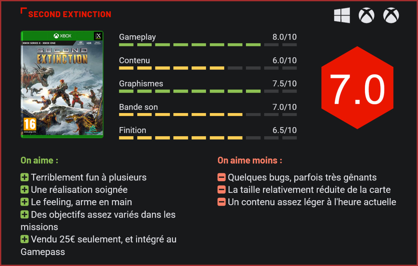 Après un Generation Zero peu convaincant, le studio Systemic Reaction nous revient avec un projet beaucoup plus ambitieux qui marche sur les traces d’un Left-4-Dead. Vous vous souvenez sans doute de Generation Zero, ce curieux FPS coopératif futuriste dans lequel une petite escouade de survivants affrontaient de gigantesques robots dans les décors pittoresques de la Scandinavie. Séduisant par son concept, Generation Zero n’était pas vraiment parvenu à convaincre, la faute à un gameplay sans saveur, un rythme mou et une difficulté rebutante pour les joueurs qui souhaitaient le parcourir en solo. Le studio suédois a appris de ses erreurs et nous revient aujourd’hui avec un second projet bien plus abouti. Certaines créatures sont titanesques. Dans le fond, pourtant, difficile de ne pas voir des similitudes dans les deux projets. Tout comme Generation Zero, Second Extinction est un FPS coopératif. Il se joue en monde ouvert. Y jouer seul représente un sacré défi, et le studio nous propose une fois de plus d’affronter de gigantesques créatures de différentes classes. Exit les robots toutefois et place aux dinosaures cette fois. S’il s’inscrit dans la continuité de Generation Zero, Second Extinction prend une direction différente puisque le titre s’inspire davantage de Left-4-Dead dans sa construction. Second Extinction est un jeu beaucoup plus nerveux que Generation Zero. Les affrontements y sont nombreux, la prise en main est plus technique aussi. Si le titre est jouable en solo, il est préférable d’y jouer entre amis, à trois. Les joueurs pourront se partager les rôles en incarnant différents personnages, aux aptitudes et à l’équipement uniques. Par cette approche, Second Extinction rappelle parfois Apex Legends. Dans son gameplay aussi d’ailleurs, tant par la nervosité des combats que par sa large palette de commandes. Car malgré les apparences, on ne se contente pas tout le temps de vider son chargeur dans Second Extinction. Il faudra aussi régulièrement se soigner, activer son pouvoir spécial (soigner ses alliés), une compétence secondaire (comme poser une barricade par exemple), demander un drop de munitions en plein combat, se ravitailler dans différents points stratégiques,… Le gameplay est beaucoup plus technique qu’il n’y paraît. Le bestiaire est assez varié. Second Extinction a très clairement été pensé pour être un titre coopératif. La narration est minimaliste. Les missions ont toutefois été structurées de sorte à garder l’attention des joueurs, avec des objectifs variés qui changent en plein cours de partie. De par sa construction en open-world, Second Extinction parvient également à surprendre avec encore là des idées très riches, piochées à gauche et à droite, des nombreuses missions secondaires qui permettront de récupérer des crédits additionnels à l’expérience acquise qui permettra de débloquer des capacités du personnage, en passant par la personnalisation de l’armement et du look des personnages. Dans l’ensemble, les mécanismes de jeu sont bien huilés. Les missions se bouclent entre 30 et 50 minutes. Le jeu en compte une demi-douzaine, ce qui n’est pas énorme, mais la rejouabilité est bonne car le jeu est vraiment fun et surtout son univers ne cesse d’évoluer. Comprenez par là que vous ne rencontrerez pas toujours les mêmes ennemis aux mêmes endroits et que la difficulté évoluera selon le moment et le lieu où vous jouez. Il est important d’utiliser les compétences complémentaires de chaque personnage. Pad en main, les sensations sont bonnes. On sent que les développeurs ont appris de leurs erreurs, et cela fait plaisir à voir tellement le gap entre Generation Zero et Second Extinction est énorme. La seconde création de Systemic Reaction est un fast-FPS très fun, nerveux et technique, qui se présente comme un excellent défouloir. L’ambiance du titre est également soignée puisque durant plusieurs minutes, on peut arpenter la carte sans rencontrer aucun ennemi pour ensuite être surpris par une attaque éclair. On ne sait jamais non plus sur quel type d’ennemi on va tomber. Le bestiaire du jeu est assez varié même si l’on retrouve principalement des raptors. Ceux-ci vous attaqueront systématiquement en groupe, mais leur groupe est généralement composé de plusieurs unités différentes, des cracheurs d’acide aux raptors lourds en passant par les hurleurs qui appelleront des renforts avec des cris stridents. Il ne sera pas rare de devoir affronter des groupes de plusieurs dizaines de créatures se ruant vers vous. Les combats contre les Tyrannosaurus, Triceratops et autres géants sur le champ de bataille font partie des moments forts du jeu. Chacune de ces créatures a ses faiblesses et ses forces sur le champ de bataille. Le T-Rex est sans aucun doute l’ennemi le plus redoutable, mais aussi le plus effrayant du jeu. Pour l’éliminer, il faudra concentrer ses tirs sur son cou. Inversément, pour éliminer certains ennemis, le joueur devra opter pour une approche plus explosives, en utilisant par exemple des grenades pour retourner un adversaire et parvenir à tirer sur son point faible… Les triceratops vous chargeront au premier coup d’oeil. Avec ses mécanismes de jeu bien huilés, ses objectifs variés, son bestiaire très riche, ses combats intenses et sa jolie direction artistique, Second Extinction parvient donc à séduire même le plus blasé des joueurs avec une proposition pourtant très simple. Dans sa formule, le jeu de Systemic Reaction n’est ni plus ni moins qu’un Left-4-Dead dans lequel on aurait remplacé les zombies par des dinosaures… Et étonnamment, la formule fonctionne plutôt bien. Difficile toutefois de ne pas être déçu par le contenu très léger du titre à sa sortie… Une petite demi-douzaine de missions sont au programme seulement, sur une carte de taille très modeste, et qui manque cruellement 