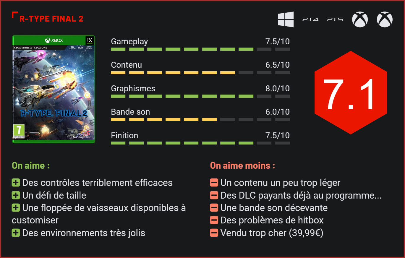 Parmi les incontournables du shoot’em up, la franchise R-Type fait son grand retour après plus de 17 ans d’attente. Si vous avez joué dans les années 1980 ou 1990 sur des bornes d’arcade, vous n’êtes très certainement pas passé à côté de la désormais mythique franchise R-Type. Fleuron du shoot’em up, R-Type fait partie des grands noms du jeu vidéo, avec pas moins de 7 épisodes en 16 ans. Le dernier épisode majeur en date, R-Type Final, date de 2004 et était sorti sur PlayStation 2. 17 ans et 3 générations de consoles plus tard, la franchise fait son grand retour. Comme tous les précédents R-Type et la plupart des shmup, ne vous attendez pas à avoir affaire à un scénario dans cet opus. Vous allez juste vous contenter de détruire de l’alien et ce n’est pas bien grave, puisque c’est tout ce que l’on demande au titre. Les affrontements et en particulier avec les boss sont une franche réussite et procurent un sentiment de nostalgie incroyable. Et pour ce faire, il faudra apprendre à manipuler avec brio son vaisseau spatial. Celui-ci répond magnifiquement aux commandes des gâchettes et le temps de latence, devant être le plus faible possible dans un shmup, est quasi nul. Les grands principes déjà présents dans R-Type Final premier du nom sont repris dans cette suite. On peut toujours modifier la vitesse de notre vaisseau sur 4 allures différentes, et l’utilisation de ces boules de puissance reste omniprésente pour accroître votre puissance de feu. Autant le dire de suite, on ne boude pas notre plaisir à ce que les sensations de jeu soient quasiment semblables à celles d’il y a 17 ans. L’affrontement avec les unités ennemies est d’une rare intensité et requiert des skills incroyables de la part du joueur. Attention toutefois, puisque R-Type Final 2 n’est pas à mettre entre toutes les mains. La difficulté est bien présente, même en mode “facile”. Vous n’aurez ici que 3 vies pour progresser à travers les sept niveaux du jeu… Ce qui signifie que la progression se fera par l’échec et par la répétition. Il faudra recommencer encore et encore chaque niveau jusqu’à les maîtriser tous parfaitement et parvenir au bout de l’odyssée. Petite mention toute particulière pour les affrontements avec les boss. Plus variés les uns que les autres et avec des patterns très bien développés, les ennemis majeurs de R-Type Final 2 font presque à eux seuls tout le charme du titre. On retiendra par exemple le boss du second niveau, se dédoublant et plantant tout autour du niveau des plantes voraces prêtes à vous attaquer. Les 12 vaisseaux disponibles sont extrêmement plaisants à piloter et disposent de patterns fort différents les uns des autres. Certains utiliseront un blaster à rafale, là où d’autres seront en tir continu. Les différents “pouvoirs spéciaux” sont eux aussi suffisamment variés d’un vaisseau à l’autre pour donner l’envie de les tester tous. Il est également possible pour le joueur de personnaliser comme bon lui semble son vaisseau, d’un point de vue du design bien sûr. Chaque vaisseau dispose par ailleurs d’un design relativement bien conçu et très inspiré. R-Type Final 2 pèche énormément dans son contenu, avec de nombreux DLC déjà prévus. Si les sensations sont là et que R-Type Final 2 est globalement une bonne surprise, difficile de ne pas être déçu par le modèle économique du jeu, vendu presqu’au prix plein (39,99€) – tarif auquel il faudra ajouter 19,99€ pour débloquer quelques niveaux de plus… On est là très clairement face à un jeu en kit. C’est d’autant plus dommage que les niveaux se bouclent très rapidement et que le contenu pourra paraître assez léger, même pour le genre. L’un des changements les plus impressionnants depuis le dernier épisode est incontestablement le gap visuel franchi par la franchise. Les graphismes de R-Type Final 2 sont extrêmement convaincants. Les effets de lumière se répercutent sur des environnements très variés et plus réussis les uns que les autres. Certes, on n’atteint pas les standards établis par certains jeux, mais le résultat est globalement très satisfaisant pour un titre du genre. Les environnements sont très plaisants et surprennent avec leur effet de parallaxe et de fausse 3D. Nous ne parlerons pas ici de 2D ni de 3D pour de nombreuses raisons. Le titre n’est, à proprement parler, pas en 3D, car vous ne contrôlerez votre vaisseau que sur deux axes, comme dans la plupart des shmups. Cependant, le titre profite, grâce à ses environnements et la progression au sein de ceux-ci, d’un sentiment de paysages en 3D extrêmement réussis. Un effet de parallaxe et omniprésent et le vaisseau joue parfaitement avec la tridimensionnalité de l’univers. Côté bande-son, le résultat est de moins bonne facture. En effet, même si les mélodies adoptent un style électro inhérent à ce genre de jeu et de plutôt bonne facture, elles ne sont pas sans défauts. Elles passent par exemple trop inaperçues dans le brouhaha de bruitages et manquent cruellement de variété. Les bruitages créent quant à eux une horrible cacophonie qui poussera vite le plus patient des joueurs à couper le son. Enfin, on reprochera également à ce R-Type Final 2 un certain manque de finition. Si les bugs se font très rares et que l’expérience de jeu n’est nullement gâchée par un quelconque souci de stabilité, on regrettera que la hitbox des environnements, ennemis et tirs de blaster soit trop hasardeuse. Il n’est ainsi pas rare de se méprendre sur les distances avec un obstacle ou un ennemi et de finir avec un joli écran de Game Over, alors que le vaisseau semblait à l’abri… Conclusion Il est difficile de ressortir du placard une franchise dont le dernier opus est sorti il y a 17 ans. Néanmoins, le studio nippon Granzella parvient à redonner ses lettres de noblesse à la franchise R-Type, 