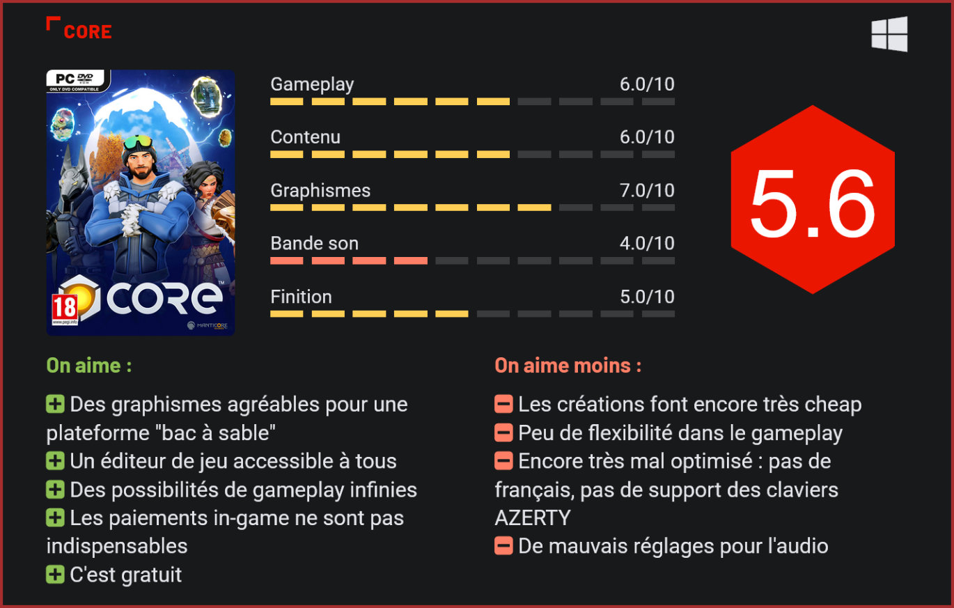 La plateforme de création de jeux vidéo du jeune studio Manticore Games est désormais disponible en accès anticipé exclusif sur L’Epic Games Store. Accessible gratuitement et uniquement sur PC, elle propose déjà des milliers de jeux créés par les joueurs, pour les joueurs grâce à un éditeur de jeu en surcouche du moteur graphique Unreal Engine. Core n’en est qu’à ses débuts, mais était déjà disponible en pré alpha depuis plusieurs mois pour permettre aux créateurs amateurs de s’y aventurer et pour, au passage, faire parler d’elle. En partie financée par Epic, Core Games entretient une relation étroite avec le studio, détenteur du célèbre moteur graphique Unreal Engine que la plateforme emploie. Cette dernière semble également vouloir étendre son offre dans le domaine des jeux bac à sable. Core se revendique comme le “YouTube du jeu vidéo”, la plateforme vidéoludique souhaite établir dès le départ un aspect lucratif pour les créateurs les plus assidus et talentueux. Si les jeux sont gratuits, leurs créateurs sont libres d’en monétiser certains aspects tels que des boosts d’xp, des skins et des améliorations in-game, Manticore s’engage à reverser 50% des recettes aux créateurs. De plus, des concours de créations de jeux ont régulièrement lieu pour stimuler la créativité de la communauté. À l’instar de YouTube ou de Twitch, un programme partenaire pour les créateurs a été mis en place par Manticore Games. Autre particularité de Core, les joueurs gardent leurs avatars, peu importe les jeux auxquels ils choisissent de jouer. Cet aspect renforce le côté plateforme multivers dont l’aspect personnalisation rappelle Fortnite. Les joueurs peuvent collectionner une multitude de skins, montures ou emotes pour rendre leur personnage unique. Il n’est donc pas étonnant de se retrouver en armure de chevalier sur un skateboard dans un jeu se déroulant dans une station spatiale. Les joueurs gardent leurs skins personnalisés, peu importe le jeu. Le RPG Star Colony se déroule sur des planètes lointaines et rappelle No Man’s Sky. La plateforme sandbox rappelle fortement Roblox, Dreams sur ps4 ou bien les serveurs ultra-modés de Garry’s Mod ou de Minecraft, sa force réside dans son accessibilité. Celle-ci se retrouve tant dans l’accès aux jeux que dans l’outil de création. De plus, les graphismes de l’Unreal Engine lui confèrent un aspect moderne et agréable. Les jeux de Core sont beaux, le partenariat entre Manticore Games et Epic Games a en effet permis à Core de proposer une utilisation optimale de l’Unreal Engine, tant aux joueurs, qu’aux créateurs. Seul bémol, la configuration minimale requiert l’équivalent d’une carte graphique Geforce 1050, 8gb de RAM et un Intel core I5 7400, une configuration encore peu démocratique pour une plateforme voulant réunir un grand public. À l’exception de Dreams, la force des jeux cités précédemment est en partie de pouvoir tourner sur un grand nombre de machines modernes. L’Unreal Engine, bien employé, fournit des graphismes agréables. Notamment dans le jeu de survie Island Survival. Pas de chance pour les joueurs en clavier AZERTY, la plateforme ne s’y adapte pas encore. Il faudra donc modifier l’attribution des touches par soi-même. Ce qui devient vite pesant, car il faudra le refaire pour chaque jeu. La solution la plus simple reste donc de changer son clavier en qwerty manuellement dans Windows (ou avec le raccourci maj+alt) le temps d’y jouer. Étant en accès anticipé, la plateforme n’est pas traduite non plus, pour les non-anglophones, il faudra prendre son mal en patience, mais ces deux aspects vont vraisemblablement être vite réglés. Côté expérience, tout est assez intuitif. Lorsque nous nous connectons, nous arrivons dans le Core World, sorte de hub central dans lequel notre personnage peut se balader et où il est possible d’échanger avec d’autres joueurs. Le hub permet de rejoindre les jeux les plus en vogue parmi les catégories “les plus actifs”, “gagnants des concours Core” et “populaires”, chacun de ces jeux est relié au hub via un portail. Le reste des jeux sont accessibles dans le menu principal dans un onglet dédié, l’outil de recherche permet de trouver des jeux plus spécifiques. Le HUB central relie les jeux les plus en vogue. L’onglet “my collection” permet de customiser son personnage à sa guise, grâce aux cosmétiques gagnés en jouant ou en remplissant des quêtes journalières sur la plateforme. À l’instar de Fortnite et d’autres free-to-plays récents, il est possible dans l’onglet “shop” d’aller plus loin et d’acheter des cosmétiques rares en échange de “core credits”, moyennant de l’argent réel. Ce sont ces “core credits” qui sont également utilisés pour les transactions in games. Core compte déjà toutes sortes de jeux à son actif allant du FPS au RPG en passant par les arènes PVP et des jeux de RP, certains d’entre eux sont relativement qualitatifs et d’autres moins. La plateforme propose également un bon nombre de mini-jeux, allant du mini-golf à la course d’obstacles. Mais, beaucoup d’autres jeux reposent également sur le farming, dynamique déjà populaire dans les jeux en ligne pour mobile qui tend à bien fonctionner sur Core Games, c’est notamment dans ces derniers que le payement in-game trouve de l’intérêt. Le jeu de farming Balloon Simulator consiste à cliquer sans cesse pour gonfler son ballon, acheter des améliorations et voler toujours plus haut. Clins d’œil sympathiques pour les fans, pas mal de jeux s’inspirent ou reprennent des franchises connues. Il est ainsi possible de combattre les vilains dans le monde de My Hero Academia ou de voltiger dans le monde d’Attack on Titans. Certains créateurs ont également recréé les teams deathmatchs de Halo ou les casse-têtes de Portal. Un jeu Attack on Titan