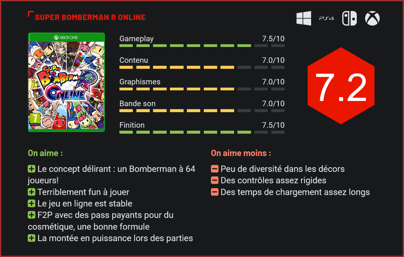 Après Tetris, c’est au tour d’un autre monument du jeu vidéo à s’essayer au battle royale. Exclusivité temporaire au catalogue de Stadia, Super Bomberman R Online a finalement droit à une sortie sur toutes les plates-formes plus de neuf mois après sa sortie sur Stadia. Le titre de Konami se positionne comme un jeu free-to-play, accessible gratuitement à tous, avec toutefois un système de pass payant pour du contenu cosmétique et l’accès aux parties personnalisées. Une formule économique plutôt séduisante, dans la mesure où ceux qui souhaitent juste s’amuser ne devront pas débourser un seul euro… 64 joueurs s’affrontent en temps réel. Qui dit Free-to-play dit toutefois un contenu assez léger. Super Bomberman R Online n’est d’ailleurs pas vraiment un nouvel épisode mais une déclinaison battle royale du précédent volet. Pas de solo à l’horizon donc, mais un mode multijoueur particulièrement séduisant. Le concept est simple ici : il faudra tenter d’être le dernier survivant en éliminant ses adversaires les uns après les autres. Le jeu se joue à 64 joueurs mais tous n’apparaissent pas sur la même carte. Les joueurs se retrouveront par groupes de quatre dans l’une des 16 arènes de jeu. Dans chaque arène, on retrouve des blocs qui, une fois détruits, permettront de récupérer différents bonus pour se déplacer plus rapidement, poser plus de bombes, ou créer des bombes de plus en plus destructrices. Les blocs sont assez vite détruits et il n’est pas rare qu’un ou deux des opposants soient éliminés dans les premières minutes de jeu. Toutes les minutes, 4 arènes se ferment et les joueurs qui ont survécu sont contraints de se rendre dans l’une des autres arènes le plus vite possible, ce qui amène à des affrontements de masse puisqu’à partir de ce moment, les zones de jeu peuvent accueillir plus de quatre joueurs. Et ainsi de suite jusqu’à ce qu’il ne reste plus qu’une zone et un seul survivant… Chaque personnage a ses qualités et défauts. Super Bomberman R Online est très rafraîchissant dans sa formule et résolument un jeu très fun. Les affrontements dans chaque arène peuvent être très intenses et on n’a souvent pas beaucoup de temps pour réfléchir lorsqu’un compteur apparaît à l’écran. Le titre sait toutefois se montrer stratégique. Tout ici est basé sur le risque et la récompense. Si un autre joueur meurt, il lâche tous ses bonus, que vous pourrez récupérer… Mais vous courrez également le risque de vous retrouver sous les bombes de vos opposants… Clairement, on pourrait reprocher à Super Bomberman R Online de ne pas proposer beaucoup de diversité dans ses environnements, ni de modes de jeu alternatifs. Toutefois, Konami est parvenu à créer un jeu très cohérent dans sa formule, à la fois accessible, fun et décalé. La formule reste la même qu’avec les précédents épisodes de la série, mais il ne faut pas s’attendre ici à beaucoup de diversité. Ce sera, encore et toujours, des parties à 64 joueurs. Super Bomberman R Online hérite également des petits défauts de son ainé, avec son gameplay assez rigide et sa réalisation certes plutôt soignée mais qui reste relativement minimaliste. Le design cartoonesque lui colle à la peau, mais on a également clairement l’impression de jouer à un titre qui n’est plus tout frais… Des arènes de jeu se ferment toutes les minutes, poussant les joueurs à se déplacer d’une zone à l’autre. La bonne nouvelle, c’est que si son contenu est relativement léger et si Super Bomberman R Online n’impressionne pas vraiment niveau réalisation, le jeu est très joliment optimisé. Pas de ralentissements à l’horizon, des parties en ligne funs, beaucoup de stabilité dans le réseau : Konami a assuré. L’éditeur réussit brillamment son pari d’adapter l’une de ses franchises cultes en battle royale. Le concept est accrocheur, les parties très funs et on se surprend vite à enchainer les compétitions avec ses amis… Même le modèle économique parvient à convaincre. Dommage tout de même que les parties soient entrecoupées de longs temps de chargement – mais c’est plutôt logique puisqu’il faut à chaque fois réunir 64 joueurs pour lancer la partie. Conclusion Avec Super Bomberman R Online, Konami nous livre l’un des battle royale les plus funs de ces derniers mois. L’éditeur nippon est parvenu à brillamment adapter sa franchise au genre en proposant des affrontements à 64 joueurs à travers une série de 16 arènes. Chaque minute, 4 arènes ferment leurs portes, poussant les joueurs à se rassembler dans un nombre de plus en plus réduit d’arènes, jusqu’à ce qu’il n’en reste plus qu’un. Très fun à jouer, Super Bomberman R Online conserve tout ce qui a fait le succès de la série : un univers cartoonesque coloré, une prise en main accessible et des combats intenses, qui ne laissent que peu de temps pour respirer. Si vous n’y passerez sans doute pas des journées complètes, Super Bomberman R Online n’en reste pas moins un très bon divertissement entre deux parties de Call of Duty ou de FIFA. Il présente également l’atout – non négligeable – d’être gratuit.