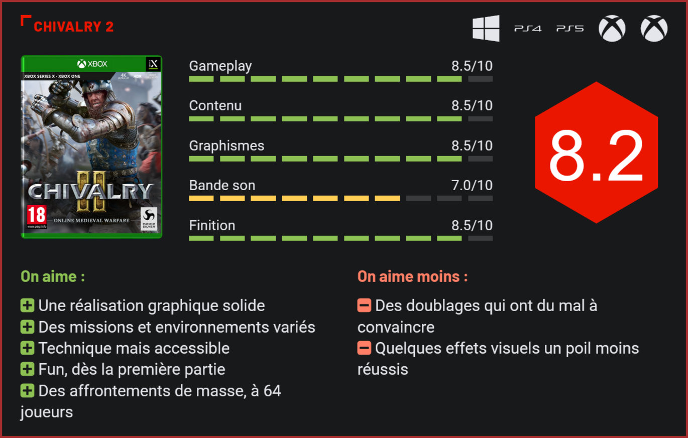 Près de neuf années après le premier volet, les créateurs de Chivalry: Medieval Warfare nous reviennent avec une suite bien plus ambitieuse. Après l’échec de Mirage Arcane Warfare en 2017, le studio canadien Torn Banner Studios avait annoncé son intention de revenir à ses premiers amours avec une suite directe de son premier jeu, l’excellent Chivalry: Medieval Warfare. Le premier épisode était à l’origine un mod très populaire proposant des affrontements de masse en période médiévale. Il s’était progressivement transformé en un projet de jeu multijoueur à part entière. Ses créateurs ne disposaient toutefois pas vraiment des ressources à l’époque pour en faire un titre triple-A. Depuis, le studio a parcouru un bout de chemin. De nouveaux talents ont rejoint l’équipe et surtout, Torn Banner Studios a eu beaucoup plus de temps pour affiner ses idées et préparer une suite digne de ce nom. Le mode de jeu principal propose des affrontements de masse à 64 joueurs. Chivalry 2 reprend les fondements de son ancêtre mais maîtrise beaucoup mieux la formule. Moins technique qu’un Mordhau dans son gameplay, le titre de Torn Banner Studios se présente comme un jeu de guerre à la première personne très fun à jouer entre amis. Le mode de jeu principal propose de participer à des affrontements de masse à 64 joueurs, répartis entre deux factions. Dans ce mode de jeu, il faudra participer à une succession de missions qui définiront le destin des deux armées. A l’exception de quelques combats en arène avec un nombre limité de renforts, qui rappellent furieusement Battlefield dans leur formule, la plupart des missions qui nous sont ici proposées suivent une trame narrative. Dans l’une d’elle, les attaquants devront par exemple prendre le contrôle d’une plage, pour ensuite avancer avec les béliers, défoncer la porte de la forteresse, progresser dans la cour du château et éliminer le maître des lieux. Les défenseurs de la place forte devront tout faire pour empêcher l’ennemi de réaliser chacun de ses objectifs dans le temps qui lui est imparti. En cas de victoire sur l’une de ces manches, les défenseurs de la place forte remporteront la partie. Etonnamment, le jeu est très joliment équilibré. Les parties s’enchainent sans que l’ennui ne pointe le bout de son nez. Chivalry 2 est un jeu brillamment conçu. Son level-design offre de nombreuses approches différentes du champ de bataille, qui favorisent tant les individualités que les attaques coordonnées. Il ne faut pas forcément concevoir une stratégie de groupe pour réussir. Les individualités peuvent également payer. La tension est palpable sur le champ de bataille. Le timer, présent en permanence sur l’écran, force les attaquants à changer continuellement de tactique pour progresser. L’archer peut faire de gros dégâts dans les rangs ennemis avant la confrontation directe. Chivalry 2 est à la fois un jeu très accessible mais aussi suffisamment technique pour garder les joueurs scotchés à leur pad durant des heures. Tout d’abord, parce qu’il est possible d’y incarner différents classes de guerriers : dans le rôle d’un archer, le joueur devra garder une certaine distance avec ses adversaires et veiller à être toujours accompagné de fantassins pour le protéger. Dans le rôle d’un chevalier, il faudra veiller à bien se protéger et maîtriser le maniement de l’épée. Le gameplay est relativement accessible mais suffisamment subtile pour qu’il soit possible d’utiliser des feintes et utiliser différents types de coups pour mettre K.O. ses opposants. Les combats sont techniques et il ne sera pas rare qu’un très bon joueur enchaine 5, 6, 7 ou 8 frags à la suite. En plus des quatre classes principales de guerriers, on retrouve différentes sous-classes. Au sein de celle des archers, le joueur pourra par exemple incarner un arbalestier, une fois la compétence débloquer. L’arbalète est plus précise et fait plus de dégâts, mais elle ne tire qu’un seul coup et prend du temps à être rechargée… Torn Banner Studios a très bien pensé son jeu, de sorte à ce que l’expérience continue d’évoluer au fil des parties. Au fil des victoires, le joueur débloquera de nouveaux éléments cosmétiques pour personnaliser son guerrier et de nouvelles sous-classes de combattants. Sur la durée, le jeu offre donc une expérience très solide. On retrouve une belle diversité de missions et d’environnements dans Chivalry 2. Les premières parties sont également grisantes pour les nouveaux joueurs, qui découvriront un jeu extrêmement fun à jouer, mettant en scène des dizaines de combattants sur un champ de bataille qui ne cesse d’évoluer… Les missions sont extrêmement variées et le jeu brille par par son immersion. On est plongé au coeur de la bataille dès les premières secondes de la partie avec une charge mortelle des deux factions. En cas de décès, le joueur respawnera ensuite à proximité directe de la ligne de bataille. De par son approche très arcade, le jeu n’est pas vraiment ce qu’on pourrait appeler une simulation, mais son univers reste suffisamment crédible pour qu’on s’y croit. La variété des situations permet également d’expérimenter des séquences de jeu très riches, de l’assaut des places fortes aux batailles rangées en passant par des escarmouches ou des escortes de PNJ. Ceux qui le souhaitent peuvent également participer à des parties en Deathmath ou Team Deathmatch beaucoup plus classiques. Malgré la pandémie, les développeurs sont parvenus à joliment optimiser leur jeu. Le titre est extrêmement fluide, les parties s’enchainent rapidement et nous n’avons croisé aucun bug en plus de 40 parties… Le temps d’attente entre deux parties est également très court, le jeu étant cross-platform dès sa sortie. Côté bande son, Chivalry 2 parvient également à convaincre ave