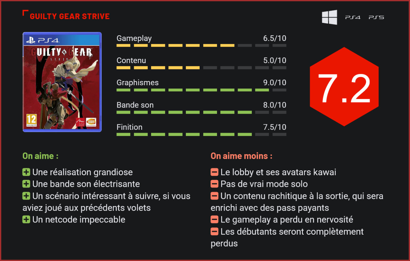 Six ans après Guilty Gear Xrd -REVELATOR-, Arc System Works revient à ses premiers amours avec Guilty Gear Strive, un reboot complet de sa franchise. Rangée au placard depuis des années, la série des Guilty Gear fait partie de ces icônes du jeu de baston. Contrairement à un King of Fighters ou un Street Fighter, elle n’a toutefois jamais connu un énorme succès populaire. Et c’est en grande partie ce qui explique pourquoi Arc System Works l’a rangée au placard il y a six ans pour se consacrer à des projets plus lucratifs, comme le dernier Dragon Ball FighterZ qui lui avait été confié par Bandai Namco. Le retour en grâce du jeu de baston 2D et le succès des dernières productions du studio semblent toutefois avoir redonné confiance en son éditeur dans ses projets. Avec Strive, Arc System Works espérait enfin faire entrer sa licence au panthéon des dieux du ring. Visuellement, Strive est une complète réussite. Pour séduire un nouveau public, le studio nippon n’a pas hésité à revoir complètement les mécanismes de son jeu et a concentré une grosse partie de ses efforts sur son esthétique. Exit la 2D pure, Guilty Gear Strive est un jeu de baston moderne – qui épouse la 3D avec un stylé animé absolument superbe. Difficile de ne pas tomber amoureux de la direction artistique du jeu, grandiose. On le sent, Arc System Works maîtrise désormais parfaitement l’Unreal Engine 4. Strive place la barre encore plus haut que ses deux précédents titres : Granblue Fantasy et Dragon Ball FighterZ. Les décors ressemblent à de superbes tableaux dans lesquels se déplacent des personnages en 3D superbement animés. Mais c’est surtout lors des super attaques que le jeu montre tout son potentiel, avec une rotation de la caméra qui montre une réelle modélisation en 3D des personnages et de jolis effets de style qui plongent littéralement le joueur au cœur de l’affrontement. Techniquement très impressionnant, Strive vous arrachera certainement quelques “wow” au cours des premières parties. Il décroche d’ailleurs sans trop de difficulté le titre du plus beau jeu de baston du moment. Côté gameplay, ce reboot risque toutefois de diviser les joueurs. Tout en restant un jeu de baston relativement technique, Guilty Gear Strive voit son gameplay sensiblement simplifié. Enormément d’éléments du jeu sont également revus, au point d’en faire perdre leurs repères aux fans de la série. L’interface du jeu a ainsi été totalement revue, avec de nombreux éléments graphiques changés et globalement, ça ne se dirige pas forcément dans la bonne direction puisqu’on a vraiment eu du mal à s’y retrouver au début. Plus inquiétant, les développeurs ont pensé que c’était une bonne idée d’afficher des messages qui recouvrent la quasi-totalité de l’écran à chaque contre – le rendu est franchement douteux. L’interface de jeu n’est pas une franche réussite. Le rythme du jeu a également changé. Si les anciens Guilty Gear était des jeux de combat plutôt nerveux, le nouveau est beaucoup plus pataud. Les personnages sont plus lents et le style de jeu a tout simplement changé. Le gameplay est beaucoup plus rigide. Les habitués de la série devront composer avec un système de combo simplifié et beaucoup de nouveaux handicaps. Impossible d’enchainer certains types de coups désormais ou de sauter pendant un combo. De façon générale, le jeu offre davantage de chances aux joueurs en difficulté de reprendre l’avantage en cours de partie. Il est beaucoup moins facile d’enchainer les combos car les développeurs ont entièrement revu le système de jeu, au point de rendre complètement fous les habitués qui devront entièrement réapprendre les mécanismes du jeu. On notera d’ailleurs que tous les personnages du jeu ont subi un lifting intégral, au point encore une fois que les habitués devront réapprendre tous les mécanismes avec chacun d’eux. Les combats aériens sont également relégués au second plan, avec globalement des affrontements qui paraissent beaucoup moins dynamiques. L’ennui, c’est que cette simplification des commandes n’en est pas forcément une car les nouveaux venus seront complètement perdus face à un scénario qui reprend là où on l’avait laissé dans le précédent volet, sans explications, et aucun tutoriel pour faire ses premiers pas. Le jeu tout entier d’ailleurs semble avoir été pensé pour les fans, avec son mode solo qui n’est qu’une longue cinématique (très bien réalisée, avec un scénario passionnant pour les fans) et un focus clairement placé sur le multijoueur en ligne. Il y a certes un mode Arcade pour se faire la main, mais les joueurs qui apprécient explorer le jeu en solo seront clairement déçus par le contenu proposé. Le casting compte en tout et pour tout 15 personnages. On notera d’ailleurs au passage que niveau casting, c’est assez léger, avec 15 personnages au lancement, dont seulement deux nouveaux. C’est peu, même si au demeurant, tous sont très différents et globalement très intéressants à explorer. L’ennui, c’est plutôt le format économique du jeu, vendu prix plein avec un contenu léger, et qui bénéficiera d’un support “payant”, avec déjà un premier season pass qui promet cinq personnages de plus… S’il déçoit coté gameplay et contenu, Guilty Gear Strive n’en apporte pas moins quelques très belles idées, comme la possibilité de briser des éléments du décor pour explorer davantage l’environnement, sa mise en scène beaucoup plus travaillée ou son code réseau en rollback, qui est une véritable révolution. En ligne, le jeu est d’une fluidité étonnante et parfaitement optimisé. Il faudra composer en revanche avec les avatars et le lobby hyper kawai, une caractéristique des productions du studio… Conclusion Impressionnant techniquement, Guilty Gear Strive est sans l’ombre d’un doute l