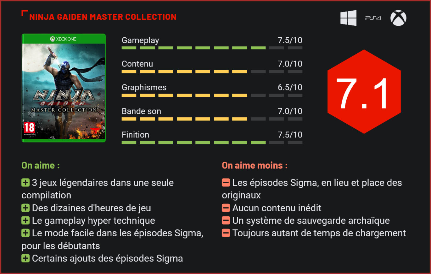 Treize ans après la sortie du troisième et dernier volet de la trilogie, Ninja Gaiden est de retour avec une compilation des trois premiers volets, idéale pour découvrir la franchise, mais qui ne plaira peut-être pas tant que ça aux puristes… Depuis le départ de Tomonobu Itagaki, la Team Ninja a bien du mal à maintenir en vie ses séries les plus emblématiques. Dead or Alive a bu la tasse avec le dernier volet. DOAX s’est enterré dans une niche. Quant à Ninja Gaiden, il n’a plus connu de nouveau volet depuis… 13 ans déjà! Si l’on met de côté l’épisode Razor’s Edge, qui était une refonte du troisième volet et le spin-off Yaiba Ninja Gaiden Z. La compilation rassemble les épisodes Ninja Gaiden Sigma, Sigma 2 et Razor’s Edge. Si elle trouve ses origines il y a plusieurs dizaines d’années sur NES, la série des Ninja Gaiden a vraiment pris son envol sur Xbox avec le reboot imaginé par l’indétrônable Tomonobu Itagaki. Ses deux suites directes ont moins convaincu les fans, mais n’en restaient pas moins des jeux d’action explosifs. Tous les fans de la série vous le diront toutefois, pas évident de s’y retrouver car les rééditions ont été nombreuses et tous les épisodes ne se valent pas. Dans le cas du premier épisode, la refonte “Black” a gagné au fil des années une aura prestigieuse. Les épisodes Sigma ont en revanche tendance à être les plus mal aimés de la franchise. Pour éviter que les nouveaux venus soient complètement perdus dans ce festival de rééditions, l’éditeur a choisi de n’intégrer que trois titres à cette compilation. Exit les épisodes originaux des trois premiers volets, et la version Black – il faudra se contenter ici des “remasters” sortis sur PS3 et de la version Razor’s Edge. Pour ce qui est de l’épisode Razor’s Edge, personne ne remettra en question la décision de l’éditeur tant cet épisode est en tout point supérieur à l’original. Pour les épisodes Sigma en revanche, les fans douteront sans doute du choix de l’équipe. Car si techniquement ces rééditions sont plus fines et plus jolies que les originaux, et si elles intègrent quelques petites nouveautés côté contenu avec de nouveaux personnages jouables, de nouveaux modes de difficultés et de nouveaux modes de jeu, elles sont pratiquement en tout point inférieures aux originaux. Sigma n’était pas juste un remaster du premier Ninja Gaiden. La Team Ninja avait entièrement revu le jeu en supprimant certains passages et en ajoutant d’autres. De façon générale, les fans lui reprochaient une surenchère au niveau du nombre d’ennemis qui avait tendance à faire s’éterniser les combats, de nouveaux segments peu intéressants à jouer, la suppression de passages plus calmes et notamment des quelques puzzles du jeu, et revoyant complètement la meta du jeu. Le titre avait également subi une vilaine censure avec la disparition des gerbes de sang et décapitations. Bonne nouvelle à ce niveau, cette compilation réintroduit un mode gore. Si l’on peut aussi comprendre la décision de Tecmo Koei de laisser de côté l’épisode Yaiba: Ninja Gaiden Z, vu la réception très négative qu’avait reçu le spin-off, l’absence des épisodes originaux et de la version Black sont beaucoup plus dommageables pour les fans. Car très clairement, les épisodes Sigma s’adressent avant tout aux débutants. Les fans de la série avaient détesté la plupart des nouveautés apportées par ces remasters à l’époque. Seuls les joueurs qui n’étaient pas parvenus à finir le jeu en raison de son niveau de difficulté avaient été ravis de découvrir un mode Facile beaucoup plus accessible. Les épisodes Sigma introduisaient de nouveaux personnages jouables. Si vous découvrez la franchise avec cette compilation, vous passerez sans doute à côté de la véritable expérience Ninja Gaiden. L’original était beaucoup plus difficile mais aussi beaucoup mieux rythmé et moins lassant. Ceci étant dit, l’épisode Sigma n’est pas pour autant un mauvais jeu. Certains de ses ajouts présentent même un réel intérêt. On regrette clairement que la Team Ninja n’ait pas pris la peine de mixer les deux titres pour proposer une expérience de jeu couplant le meilleur des deux mondes. Car c’est un fait, Ninja Gaiden reste un monument du jeu vidéo. Pour ceux qui n’y auraient jamais touché, Ninja Gaiden est très proche d’un Devil May Cry, à ceci-près que le titre de la Team Ninja s’inscrit dans l’univers de la série des Dead or Alive et se révèle globalement beaucoup plus exigeant avec ses combats de boss intenses et son gameplay extrêmement nerveux. L’original avait épaté avec ses superbes graphismes, son gameplay technique et ses combats de boss dantesques. Les suites ont perpétué la tradition sans vraiment apporter de réelles nouveautés. La direction artistique est toujours aussi réussie. Techniquement, ça a forcément vieilli. Le titre tourne toutefois désormais en 4K à 60 images par seconde sur Xbox One X, Xbox Series, PS4 Pro et PS5. On aurait aimé que certains modèles 3D soient retravaillés – mais, et c’est important de le rappeler, il s’agit ici d’une compilation et non pas d’un remake. Clairement, les joueurs qui découvriront aujourd’hui la série lui trouveront des défauts sur lesquels il est difficile de fermer les yeux : sa caméra qui a souvent beaucoup de mal à suivre l’action, la répétitivité de certaines séquences ou le système de sauvegarde d’un autre temps. A condition d’être patient, ils découvriront toutefois l’un des beat them all les plus intenses de l’histoire du jeu vidéo et ne regretteront par leur investissement. Pour les fans purs et durs en revanche, cette compilation aura sans doute un goût amer. La bonne nouvelle, c’est que sur Xbox en tout cas, les épisodes originaux sont toujours disponibles à la vente. Il y a donc moyen, 