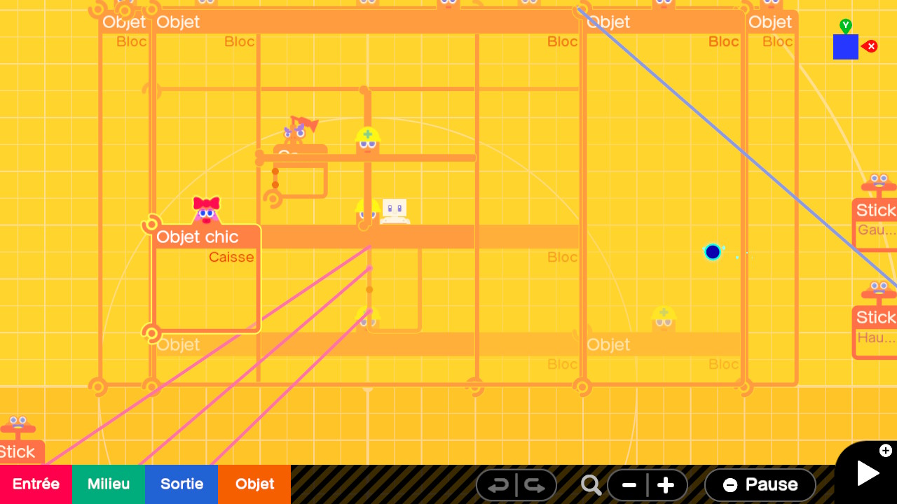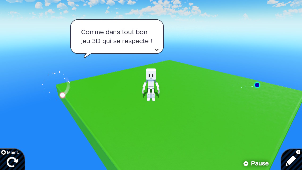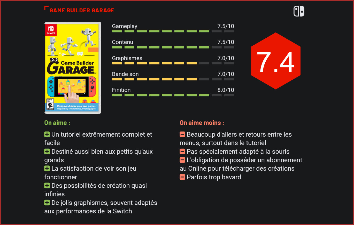 Que vous soyez initié à la programmation ou non, l’atelier du jeu vidéo entend vous faciliter la création de jeu vidéo. Annoncé il y a un peu plus d’un mois dans la surprise générale, L’atelier du jeu vidéo débarque sur Nintendo Switch en proposant un concept plutôt original : permettre à l’utilisateur de créer son propre jeu vidéo. Le titre n’est alors pas à proprement parler un jeu vidéo, mais plutôt une interface intuitive et facile à comprendre accompagnant l’utilisateur dans son processus de création. Le concept n’est pas sans rappeler les récents Roblox et Core, permettant eux aussi de s’essayer à la programmation. A l’instar de la majorité de ses concurrents, Game Builder Garage souhaite ici nous initier à la programmation d’un tout autre type que le C# ou le javascript : la programmation nodale. Dans ce type de programmation, il n’est nullement question de devoir apprendre des lignes interminables de code, puisque tout repose sur une architecture basée sur des nodes, des sortes de petits carrés à relier entre eux. Chaque node propose une action ou interaction bien spécifique, et associer les nodes entre eux débouche sur un résultat souvent visible à l’écran. L’atelier du jeu vidéo veut ici nous familiariser avec les nodons, tous catégorisés en quatre familles : Entrée, Milieu, Sortie et Objet. Les nodons d’entrée servent à envoyer une information lorsque l’on presse une touche sur un Joy-Con tandis que les sorties renvoient une information ou un effet à l’écran. Les objets permettent, en grande partie, de disposer sur l’écran des éléments 3D nécessaires à la construction de l’environnement tandis que les nodons de milieu permettent calculs, comparaison… Le titre propose un didacticiel extrêmement bien conçu permettant de très vite s’habituer à la programmation nodale. A première vue, tout ce beau monde peut paraître très perturbant et décourageant. Cependant, et c’est là toute la subtilité de GBG, tout est fait pour que l’utilisateur s’y retrouve très facilement et sans la moindre confusion. En effet, dès votre entrée dans le titre, deux petites boules du nom de Bob et d’Alice vous encouragent à suivre leurs tutoriels afin de vous familiariser à la programmation. Le tutoriel est ainsi très bien fichu, avec 8 leçons vous présentant tous les nodes dont vous pouvez vous servir. Si le tutoriel peut vous paraître fort longuet (chaque leçon dure entre 60 et 90 minutes), nous ne pouvons que vous conseiller de passer par chacun d’entre eux avant de vous lancer dans le développement de votre premier jeu. Un petit bémol subsiste malgré tout dans le tutoriel. Les deux orbes qui vous accompagnent sont terriblement bavards, ce qui force à passer de longues minutes dans les lignes de dialogues sans ne pouvoir rien faire. Une fois les différentes leçons et énigmes passées, on peut enfin se lancer dans le vif du sujet. Et nous ne nous cacherons pas de le dire et de le crier à voix haute : c’est un plaisir de programmer dans L’atelier du jeu vidéo. Tout est fait pour que l’on se sente à l’aise dans notre processus de développement. Les différents nodes proposés sont bien souvent très explicites et permettent sans trop de difficulté de savoir comment les combiner. Une fois que l’on a pris en main le concept et que l’on a compris comment associer les nodes, reste un seul obstacle : votre imagination. Sur ce point, Nintendo a très bien fait les choses puisqu’il ne semble y avoir que très peu de restrictions dans les possibilités de création. Que ce soit un FPS, un platformer ou un jeu de courses, rien ne semble impossible à créer. Evidemment, vous ne créerez pas un monde ouvert de la taille d’Assassin’s Creed ou un FPS à la manière de Battlefield, mais les possibilités restent malgré tout nombreuses et, petits comme grands, trouveront sans doute le moyen de développer le jeu “de leurs rêves”. Une chose pouvait en revanche sembler poser problème à l’annonce du titre : son ergonomie. L’atelier du jeu vidéo fonctionne selon deux écrans, à savoir l’écran de programmation et la vue du jeu. Si cette dernière est souvent configurée selon votre logique de création, ce qui ne devrait pas poser de problèmes, l’écran de programmation est quant à lui un peu plus problématique. En effet, si l’utilisation à l’écran tactile est vivement conseillée, les développeurs du titre vous proposent malgré tout de connecter une souris par USB au dock de la console pour profiter d’une souris comme sur ordinateur. C’est malheureusement bien moins ergonomique, puisqu’il est nécessaire de posséder une souris sans-fil compatible ou filaire, mais dont le câble serait suffisamment long pour parcourir votre salon. Dans le cas d’une souris filaire, dès que quelqu’un passe devant le signal envoyé par la souris au dock, une latence insupportable s’opère sur le déplacement du curseur. De plus, il est impossible d’accélérer ou de ralentir la vitesse de défilement du curseur, celui-ci étant bien trop lent. Il est possible de créer n’importe quel type de jeu : FPS, plate-formes 2D ou 3D, voiture… Une fois votre jeu terminé, vous pouvez ensuite en faire ce que vous voulez. Vous pouvez alors y jouer seul ou avec un ami s’il s’agit d’un jeu multi, mais également le partager avec d’autres utilisateurs de Game Builder Garage pour qu’ils s’essaient à l’expérience. Il n’est (malheureusement) pas possible de publier votre jeu pour espérer une rémunération. De plus, la communauté fonctionne selon un système relativement étrange et mal adapté. Il n’est ainsi pas possible de partager votre création afin qu’elle apparaisse dans une grande bibliothèque disponible pour tous. Il faudra en effet partager le code correspondant à votre titre avec qui vous le souhaitez, à condition que les autres person