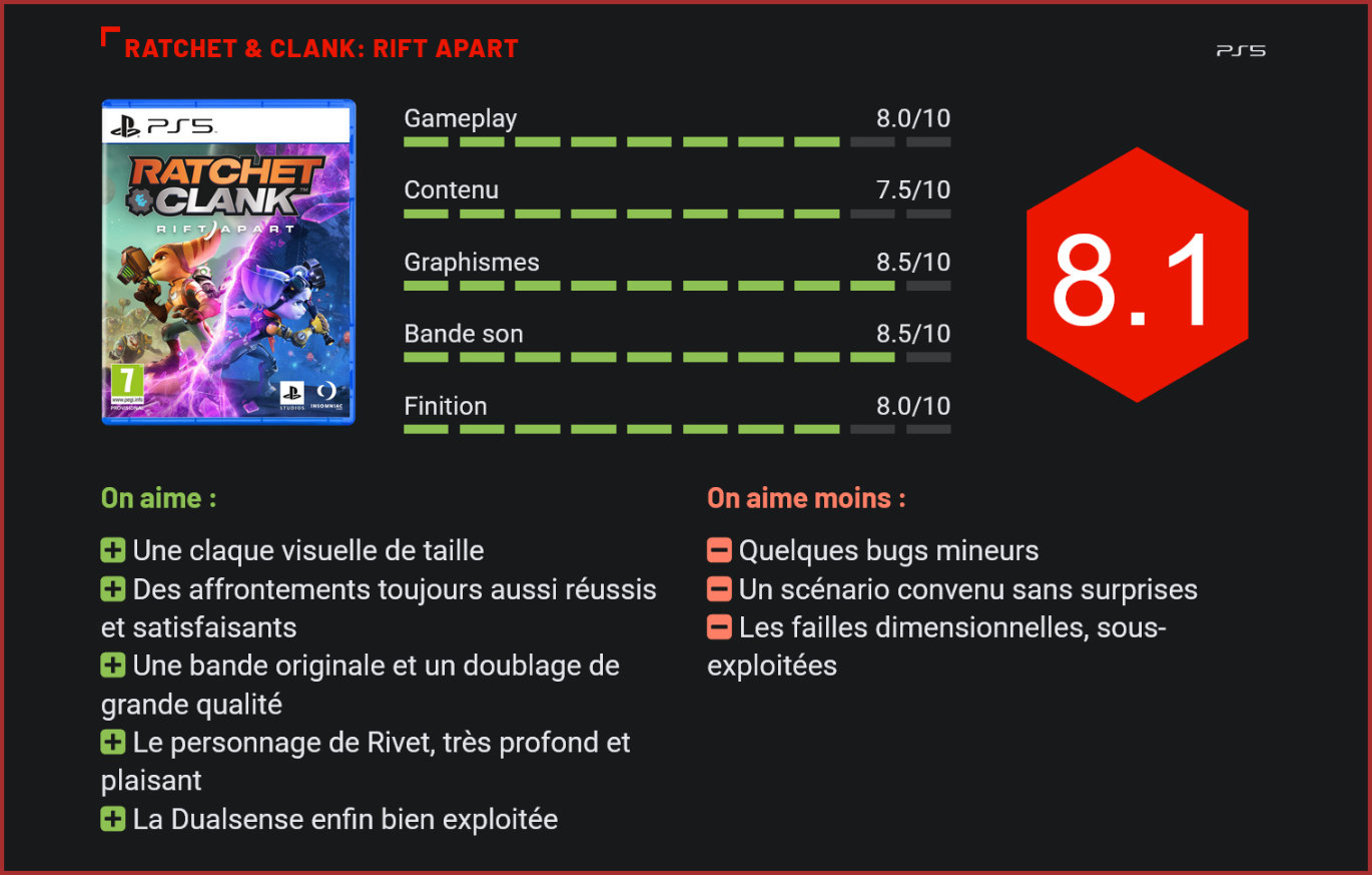 Sur le point de fêter les 20 ans, la franchise Ratchet & Clank revient avec son premier épisode “next-gen”. Rappelez-vous, il y a 19 ans de cela. La Playstation 2 était alors dans la deuxième année de son existence et s’apprêtait à accueillir le premier épisode d’une saga qui deviendra très vite culte auprès des joueurs : Ratchet & Clank. Le titre reçut un accueil extrêmement favorable de la presse comme de la part des joueurs, à tel point qu’il aura permis à Insomniac Games de faire perdurer sa franchise à travers les générations de consoles, avec plus de 14 épisodes sortis, dont deux spin-off sur PSP. La Playstation 5 venant à peine de sortir, il était évidemment normal qu’elle accueille elle aussi son propre épisode des aventures de notre Lombax préféré. Présenté comme une des premières vraies grosses exclus de la PS5, Rift Apart se devait d’être le porte-étendard d’une nouvelle génération de consoles, mettant en avant toute la puissance technique qu’apporterait la nouvelle console de Sony. Pour bien comprendre Rift Apart, il est nécessaire de bien le situer par rapport aux autres épisodes de la franchise. En effet, ce dernier épisode vient se positionner à la suite de tous les autres. Après leurs nombreuses aventures, toutes auréolées de succès, Ratchet et Clank sont considérés comme les grands héros de la galaxie. A la suite d’une grande célébration en leur honneur, Clank remet à son comparse un dimensionateur lui permettant de retrouver sa famille, qu’il cherche sans relâche depuis le premier épisode. Cependant, Ratchet & Clank oblige, tout ne va pas se passer comme prévu. Le Dr Nefarious va faire irruption, voler le dimensionateur et en abuser, à tel point qu’il le fera exploser. De nombreuses failles dimensionnelles apparaitront dans l’univers, séparant Clank de Ratchet. Le petit robot se retrouvera dans une dimension, avec … une Lombax du doux nom de Rivet. Si le scénario est relativement plaisant à suivre, il n’en demeure pas moins très classique. Il faut en revanche souligner la narration, qui est impeccable. Ainsi, vous vous en doutez, la mission de Ratchet et de Clank s’annonce comme très classique, comme à chaque fois dans la série. Clank, accompagné de Rivet, va devoir reconstruire un dimensionateur afin de fermer toutes les failles apparues, tandis que Ratchet devra affronter le Dr Nefarious et tenter de retrouver son ami robot. En soi, le scénario se suit très plaisamment, avec une intrigue plutôt agréable et une narration excellente. Cependant, on regrettera qu’Insomniac Games ait adopté une intrigue trop linéaire et classique, ne surprenant que très rarement le joueur, souhaitant, plus que probablement, éviter de gâcher cette si douce narration par un quelconque twist raté. Toutefois, on ne peut que saluer le talent des scénaristes quant à l’écriture des personnages et la narration. On se laisse sans trop de difficulté embarquer par cet univers si charmant et cette histoire sympathique, tandis que les nouveaux personnages sont une pure réussite. Si on est rodés avec des personnages comme Ratchet et Clank, qui ont pu être suffisamment exploités par les scénaristes en près de 20 ans, les nouveaux personnages donnent l’impression d’être présents dans la franchise depuis autant de temps. Rivet est une franche réussite, autant en termes de design que de sa personnalité. Afin de mener à bien notre mission, nous allons avoir l’occasion de parcourir pour la première fois un véritable petit monde ouvert relativement bien fichu. A l’aide du vaisseau spatial, nous aurons l’occasion de passer d’une planète à l’autre et de découvrir leurs magnifiques écosystèmes. L’objectif ? Evidemment progresser dans le scénario, mais également accomplir quelques petites tâches secondaires et récupérer plusieurs collectibles parsemés ici-et-là vous permettant d’améliorer votre arsenal ou d’acquérir de nouveaux équipements. Chaque planète dispose par ailleurs de sa propre ambiance, que ce soit au moyen des mélodies utilisées ou de l’écosystème présent sur place. On n’a d’ailleurs jamais l’impression que deux planètes se ressemblent, tant la diversité est au rendez-vous. Mais une des véritables nouveautés de la franchise reste indéniablement l’arrivée de ces fameuses failles interdimensionnelles. Provoquées par l’explosion du dimensionateur, ces failles provoquent de réels chamboulements dans le continuum espace-temps, à tel point que de nombreuses créatures se retrouvent piégées dans une dimension et sur une planète loin d’être les leurs. Ces failles, vous allez pouvoir vous en servir pour toute sorte de choses. La principale, et sans doute la plus répandue, sera d’envoyer votre grapin dans la faille afin d’atteindre des endroits qui seraient inaccessibles en temps normal dans le niveau. Les failles dimensionnelles apportent une nouvelle dynamique au gameplay, avec de chouettes transitions entre les mondes. Elles sont en revanche sous-utilisées. Enfin, et petite subtilité non moins sympathique, les failles dimensionnelles peuvent parfois conduire à un collectible à débusquer dans un tout nouveau monde avec une petite énigme. En effet, une fois que vous faites face à la faille, vous avez la possibilité de rentrer dedans comme si vous entriez dans une pièce. La transition est incroyable, puisque le changement est radical est instantané. Comme si on passait dans un nouveau monde après un petit temps de chargement, l’univers derrière cette faille est sensiblement différent de celui d’où on vient : musique, environnement et biotope différents. Malheureusement, on regrettera que ce principe de failles dimensionnelles n’ait pas été exploité à son plein potentiel. On ne les retrouve que par certains moments lorsqu’il faut accéder à une position éloignée, et on n’aurait pu que conse