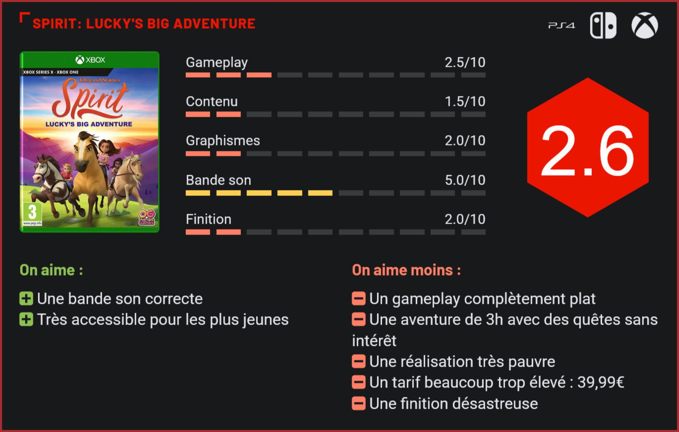 Depuis quelques années, Outright Games multiplie les adaptations de films en jeux vidéo, avec plus ou moins de succès. Spirit: La Grande Aventure de Lucky est la dernière tentative de l’éditeur pour séduire une audience très jeune. Outright Games fait partie des derniers éditeurs à proposer des adaptations de films & séries d’animation en jeux vidéo. L’éditeur américain multiplie ses productions, en misant sur des licences fortes et des coûts de production très bas. Dans l’ensemble, la qualité n’y est pas, mais quelques titres s’en sortent mieux que d’autres. On citera notamment la dernière adaptation de l’Age de Glace ou le sympathique Transformers Battlegrounds. Vu le public ciblé, il ne fallait pas s’attendre à une bonne surprise pour ce Spirit: Lucky’s Big Adventure, un jeu d’aventure en open world qui vous propose d’incarner la jeune Lucky et de partir explorer les vastes espaces sauvages de l’Amérique du Nord. Car c’est un fait, les jeux en open-world représentent en général un sacré défi et requièrent la plupart du temps un budget conséquent. L’open world du jeu est relativement vide. Spirit: Lucky’s Big Adventure transpire malheureusement le manque de budget. Tout d’abord, au niveau de son moteur graphique, très pauvre, même pour un titre porté sur Switch. Les environnements sont vides, les modélisations ultra-sommaires et par dessus le marché, le jeu est rempli de bugs et très mal optimisé, avec des ralentissements constants, même sur une console aussi puissante que la Xbox Series X. L’un dans l’autre, ce n’est pas forcément très gênant pour le public cible, qui se satisfait souvent de peu. Mais il faut bien l’admettre, on aurait clairement préféré un titre moins ambitieux et peut-être plus linéaire que ce Spirit et son open-world désespérément vide. L’ennui, c’est qu’au niveau du gameplay aussi, Lucky’s Big Adventure ne parvient pas à convaincre. On se retrouve ici face à un jeu d’aventure pour les plus petits, sans grande finesse ni profondeur. Le joueur contrôle Lucky dans un monde de taille très modeste. La jeune cavalière peut évoluer à pied ou appeler son fidèle destrier pour se déplacer plus vite. A cheval, le joueur a la possibilité de galoper en pressant sur une touche et de sauter en pressant sur l’autre. La plupart des quêtes du jeu consistent à se déplacer d’un point A à un point B en suivant les indications à l’écran. Il n’y a pas de combats à l’horizon, que quelques séquences de plates-formes chaotiques, et une seule et malheureuse course – pratiquement impossible à perdre. Les développeurs se sont contentés du minimum syndical. Le jeu ne propose pratiquement aucune quête annexe et ne se gêne pas pour vous faire faire des allers-retours incessants. S’il n’est pas complètement déplaisant à jouer, Spirit: Lucky’s Big Adventure n’est clairement pas ce qu’on pourrait appeler un bon jeu. La prise en main du jeu est d’ailleurs très raide et les déplacements paraissent globalement atrocement lents. Cerise sur le gâteau, l’aventure principale se boucle en moins de 3 heures. Ce qui fait cher l’heure de jeu, au vu du prix auquel le titre est facturé (39,99€). Les séquences de plates-formes sont une catastrophe, vu la rigidité des commandes. Pour autant, tout n’est pas à jeter dans le jeu. On le sent, les développeurs ont ciblé un public très jeune : les jeunes filles de 6 à 12 ans. L’univers coloré du jeu est séduisant, le scénario plein de bons sentiments, les quelques morceaux du jeu sont entraînants et l’éditeur semble avoir pris soin de glisser quelques features pour son public cible avec par exemple la possibilité de brosser Spirit dans une écurie pour nettoyer son pelage et lui redonner un coup de vigueur, ou de photographier paysages et animaux du jeu à tout instant. Si ses contrôles sont ultra-rigides, Spirit reste toutefois un jeu très accessible pour les plus petits. Il ne faut pas mémoriser plus de deux ou trois commandes. A une dizaine d’euros, la pilule serait sans doute passée sans soucis. En l’état, il reste difficile de conseiller l’achat du jeu au prix plein, au vu de sa durée de vie réduite et de ses nombreuses tares. Les plus jeunes pourraient toutefois y trouver un certain plaisir. Car c’est un fait, il n’existe pas beaucoup de jeux qui vous proposent de vous occuper de votre cheval et de partir à l’aventure. La promesse était pleine de charme. C’est au niveau de la réalisation que le projet s’effondre. Conclusion Acheter un jeu Outright Games, c’est un peu comme jouer à la loterie. Certaines productions du studio parviennent à agréablement nous surprendre. D’autres sont un désastre. Spirit : La grande aventure de Lucky appartient davantage à cette seconde catégorie. Outright Games a fait le choix de créer un jeu d’aventure en open-world très ambitieux. La formule peine toutefois à séduire, la faute à un monde qui manque de vie, des missions répétitives et un contenu très léger, même pour un jeu vendu à 39,99€. Spirit: La grande aventure de Lucky s’adresse toutefois à un public très jeune. Avec ses graphismes colorés, son gameplay très accessible et quelques bonnes idées, malgré ses très gros défauts, le titre pourrait séduire quelques très jeunes joueuses. Il ne faut toutefois pas s’attendre à un grand jeu.