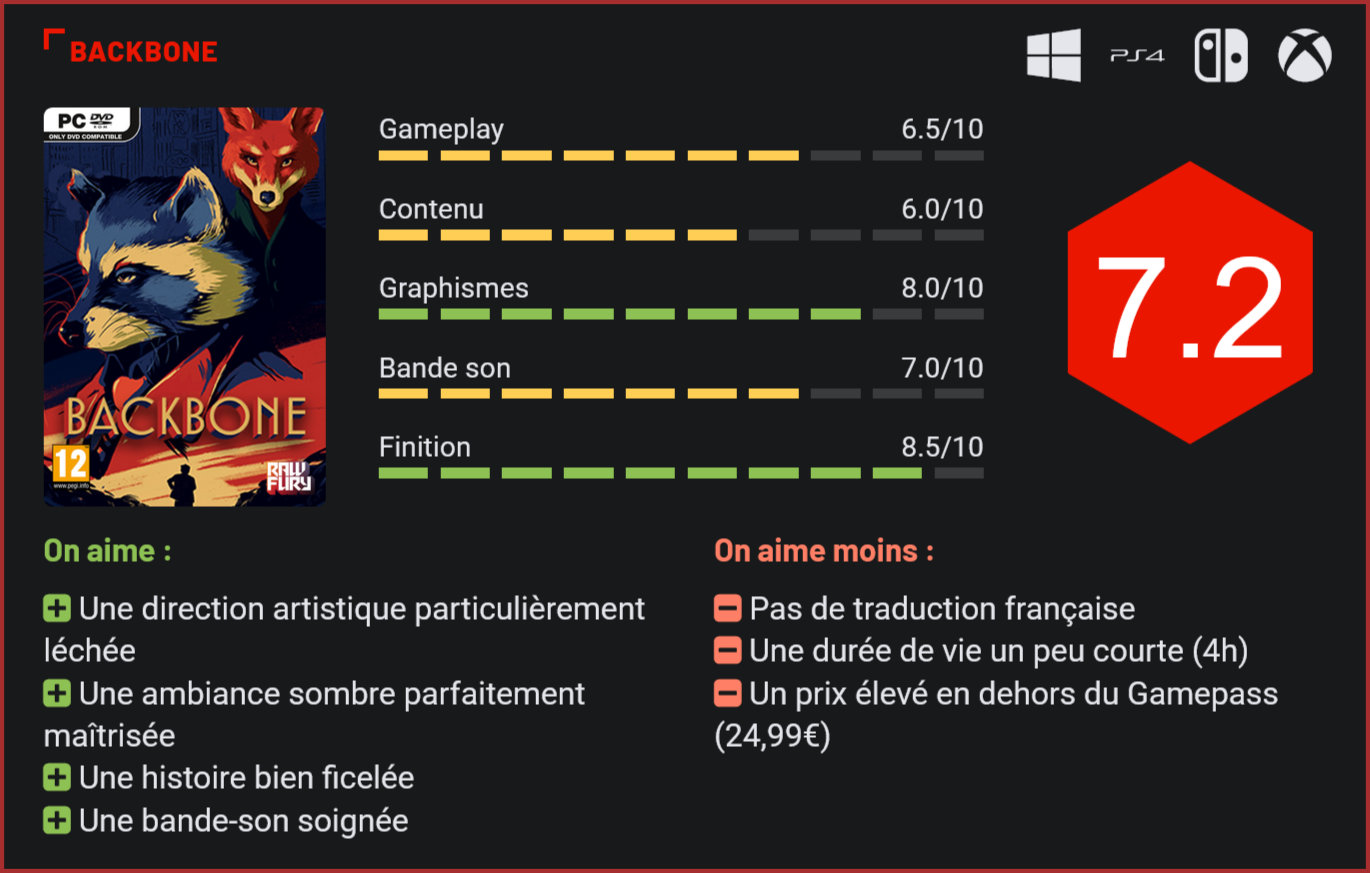 Financé grâce à une campagne de financement participatif sur Kickstarter, Backbone est un projet de point & click ambitieux sur fonds de polar. La première création du studio EggNut a de quoi séduire, notamment par sa direction artistique. Backbone nous transporte dans un Vancouver dystopique, au milieu des années 50 et nous fait incarner Howard Lotor, un raton laveur détective privé qui vient d’accepter une nouvelle affaire des plus banales ; un mari se comporte bizarrement depuis un moment, rentrant tard le soir et sentant une odeur étrange. Mais cette affaire à première vue sans intérêt va le mener à enquêter sur une sombre affaire de drogue, de corruption et de pouvoir. On se laisse assez facilement porter par le scénario du jeu qui – n’ayons pas peur de le dire – emprunte beaucoup de caractéristiques aux romans noirs. Le cadre dans lequel le joueur progresse est sombre et pessimiste, la violence est présente, de même que la corruption, la discrimination entre les races d’animaux et les jeux de pouvoir sont monnaie courante. L’ambiance de Backbone est loin d’être joviale, à l’image de son personnage principal qui se positionne plutôt en antihéros, embarqué dans une quête pour la justice bien malgré lui, mais cette dernière n’en reste pas moins plaisante. Particulièrement réussie, répondant parfaitement aux codes du genre “noir”, l’ambiance est d’ailleurs l’un des points forts du jeu. Avec son détective privé et ses personnages anthropomorphiques, difficile de ne pas faire le parallèle entre Backbone et la BD Blacksad. La comparaison s’arrête toutefois là. Le personnage principal, le détective privé Howard Lotor, est un antihéros des plus classiques. Côté gameplay, on est ici face à un point & click très classique. On se retrouve ainsi à arpenter les rues et bâtiments de la ville pour interroger des personnages, récolter des indices et poursuivre son enquête. Pour progresser dans cette dernière, il faudra discuter avec le plus d’habitants possible et faire attention aux choix de réponse. Cela peut en effet avoir une incidence sur le déroulement de l’enquête, en partie en tout cas. Car si vous ne répondez pas correctement à un personnage, ce dernier pourrait se braquer et vous envoyer balader, mais reprendre plus tard la conversation vous permettra de changer votre réponse et de poursuivre votre aventure. Les dialogues s’emboitent malgré tout assez bien, de manière organique et surtout humaine. On regrette cependant que le choix des réponses n’ait pas plus d’impact sur le déroulement du jeu. Bien choisir sa réponse permet simplement d’accélérer la résolution de l’enquête – sachant que cette dernière se boucle en 4 heures seulement –, mais si vous vous impliquez véritablement dans le jeu, on se laisse vite prendre dans l’enquête. Tenter de faire parler un brigand sans se faire repérer, tirer des informations à un badaud du coin ou encore jouer au jeu du chat et de la souris avec des criminels sera grisant. Backbone propose une aventure principalement narrative, basée sur les dialogues entre les différents personnages. Il faudra cependant avoir une bonne maitrise de l’anglais pour ne pas faire d’erreur lors des dialogues. Disponible uniquement dans la langue de Shakespeare, Backbone utilise en effet un vocabulaire et des tournures de phrase soutenus qui compliqueront la tâche aux anglophobes. Le jeu met en tout cas plus l’accent sur le côté narratif que celui de l’énigme. Les puzzles et l’enquête en général sont loin d’être complexes et ne demandent pas une véritable réflexion de la part du joueur qui sera d’ailleurs aidé par des fenêtres contextuelles. Les décors, détails et jeux de lumière sont particulièrement réussis dans Backbone. Si Backbone propose une aventure classique, mais tout de même bien ficelée, le jeu dévoile toute son originalité au niveau de sa direction artistique. L’environnement pixel-art dans lequel le joueur progressera est en effet particulièrement beau et travaillé. Le jeune studio EggNut est parvenu à développer une ambiance sombre dans les décors, tout en proposant des touches de lumières et de couleurs très belles. On a été époustouflé par les détails des décors, mais aussi leur diversité, ainsi que les jeux de lumière. Difficile de ne pas s’arrêter pour admirer la devanture du cinéma ou l’entrée du bar. Backbone propose en effet des effets de lumières dynamiques et des animations particulièrement bien réalisées, notamment au niveau de la pluie ou du brouillard, etc. C’est beau, on en a plein les yeux du début à la fin. Si le jeu ne propose aucun doublage, les développeurs ont tout de même apporté une attention toute particulière à la bande-son du jeu. On se retrouve ainsi à entendre très régulièrement des musiques de jazz très agréables qui viennent renforcer le contexte des années 50. Les développeurs ont également pris soin de peaufiner les bruitages. On entend la pluie, les passants, les voitures, etc. Malheureusement, ces moments en rue ne sont pas accompagnés de musique ce qui provoque une coupure trop nette avec les passages musicaux. Or, vu qu’on passe beaucoup de temps à arpenter les rues, nos oreilles s’ennuient grandement. Conclusion Première création d’un tout petit studio, Backbone se présente comme un point & click classique dont l’histoire nous est présente sous la forme d’une enquête. Reprenant beaucoup d’éléments aux romans noirs, le jeu propose une ambiance sombre particulièrement soignée qui met plus que jamais en avant certaines thématiques comme la corruption ou la discrimination des races. On se laisse totalement prendre au jeu du chat et de la souris pour mener une enquête qui gagne en intensité et en profondeur. Backbone vaut surtout le détour pour sa direction artistique en pixel art absolument superbe, et son u