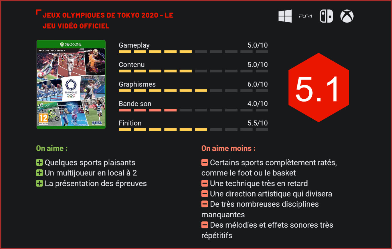 Après avoir fait l’impasse sur les jeux de Rio, Sega revient en 2021 avec une nouvelle adaptation des Jeux Olympiques en jeu vidéo. S’il est un rendez-vous que les amateurs de sports en tout genre attendent avec impatience tous les quatre ans, c’est sans conteste les Jeux Olympiques. L’évènement, suivi à chaque édition par quelques centaines de millions de téléspectateurs, est le rendez-vous incontournable de l’été. Initialement prévus en 2020, les jeux de Tokyo ont été repoussés à l’été 2021 en raison de la pandémie. Fidèle à ses habitudes, Sega a sauté sur l’occasion pour nous proposer une adaptation en jeu. Dans ses premiers essais avec les adaptations officielles des Jeux Olympiques, Sega proposait plus d’une trentaine d’épreuves en tous genres. Cette année, les équipes de Sega semblent s’être accordées sur un nombre bien moins conséquent, puisqu’il n’y a désormais plus que 18 épreuves disponibles. Il y a donc énormément d’épreuves immanquables qui pointent aux abonnés absents, comme l’escrime, le saut à la perche, le tir à l’arc, le plongeon… Le manque aurait pu être justifié si les mini-jeux présents étaient irréprochables, ce qui est très loin d’être le cas. En effet, la moitié des épreuves présentes sont tout simplement injouables. Le foot est de loin l’une des pires disciplines du jeu. Prenons le football par exemple. Les contrôles du jeu sont très rigides, les joueurs se déplacent souvent en ligne droite, quitte à devenir des cibles faciles pour les tacles. Les passes s’effectuent sans la moindre précision, au même titre d’ailleurs que les tacles, qui se font au petit bonheur la chance. L’IA des adversaires est au raz des pâquerettes. Il ne sera ainsi pas rare de courir en ligne droite sans jamais être inquiété. Plus agaçant encore : une latence se fait sentir à chaque action. Le basket et le rugby suivent malheureusement la même direction… Difficile de ne pas comparer le résultat (désastreux) à ce qu’on peut voir dans un FIFA ou un NBA 2K. Clairement, il aurait été préférable pour Sega de faire l’impasse sur ces disciplines. D’autres sports sont un peu plus convaincants, mais bénéficient toutefois toujours de gros soucis de prise en main. La natation par exemple, et principalement le 200m quatre nages, forcera le joueur à bien mémoriser les commandes. Il faut accorder l’utilisation des sticks, tout en prenant soin de conserver son endurance. De plus, les adversaires deviennent très performants une fois les qualifications passées, ce qui n’est pas pour nous déplaire. Le tennis de table et le tennis sont également plutôt plaisants, même si là encore, passé le cap des deux ou trois parties, on se rend compte que la prise en main est si simple qu’on n’a en fait plus vraiment envie d’y retourner… Pour ce qui est des séquences d’athélisme, la formule est un peu différente : il faudra appuyer, au bon moment, sur les bonnes touches. Certains sports sont très réussis, comme le beach-volley. Ceci étant dit, on retrouve également quelques disciplines plus réussies, comme le beach-volley, qui est une petite réussite, avec des échanges parfois compliqués, mais plaisants à faire. Le BMX Freestyle est une autre réussite, avec ses séquences entraînantes. Et puis, bien sûr, il y a la course à pied, qui va chercher son inspiration du côté d’un Track & Field avec du matraquage pur et dur de bouton. Côté contenu, on vous l’expliquait plus haut : il manque énormément de disciplines. Mais pas que. Pas de vrai mode solo scénarisé à l’horizon. On note en revanche la présence d’un mode multi en local à deux et d’un mode multi en ligne. Même pour un jeu proposé à 40€, c’est un peu léger. Visuellement, la franchise délaisse le réalisme au profit de personnages très cartoonesques. Sega possédant les droits sur les Jeux Olympiques, ils ont jugé bon de mettre la musique officielle de l’édition 2020 pour rythmer les menus. Soit, ce n’est pas une si mauvaise idée en soi. En revanche, n’attendez pas la fin de l’hymne pour en écouter une autre, puisqu’il n’y a pas d’autres mélodies. A chaque temps d’attente ou dès qu’on revient dans les menus on entend encore et toujours cette même musique qui nous tape très vite sur le système. Ce n’est d’ailleurs pas le seul son que vous entendrez en boucle. Les voix off se répètent sans la moindre diversité. Autre bavure : le character design. Ca ne vous aura peut-être pas échappé à la vue des visuels ci-dessus : les développeurs ont adopté un virage très important en matière de character design. Si, autrefois, on avait le droit à des personnages réalistes et plutôt bien modélisés, ce sont désormais des petits bonshommes animés que l’on contrôle, aux looks forcément très cartoonesques. Évidemment, cela divisera. On s’en doute, Sega vise un public très jeune, mais le rendu est loin d’être réussi et le tout manque cruellement de personnalité. La technique n’est quant à elle pas vraiment au rendez-vous. Sans être laid, Les Jeux Olympiques de Tokyo est très loin de tirer parti des capacités des consoles actuelles ou de la précédente génération. La technique est elle aussi très mauvaise. L’IA est ratée dans la plupart des épreuves, tandis que certaines, comme le tennis de table évoqué plus haut, sont illisibles et presque injouables en duo. De plus, les allers-retours entre les épreuves et les menus sont récurrents, et nous devons à chaque fois faire face à des temps de chargement relativement longs, même sur consoles next-gen. Logique, puisque le titre n’est pas optimisé. Conclusion Amputé de plus de la moitié des épreuves officielles, Les Jeux Olympiques 2020 Tokyo est une piètre adaptation d’un événement sportif majeur. Le jeu de Sega rate le coche au niveau de la prise en main avec des contrô