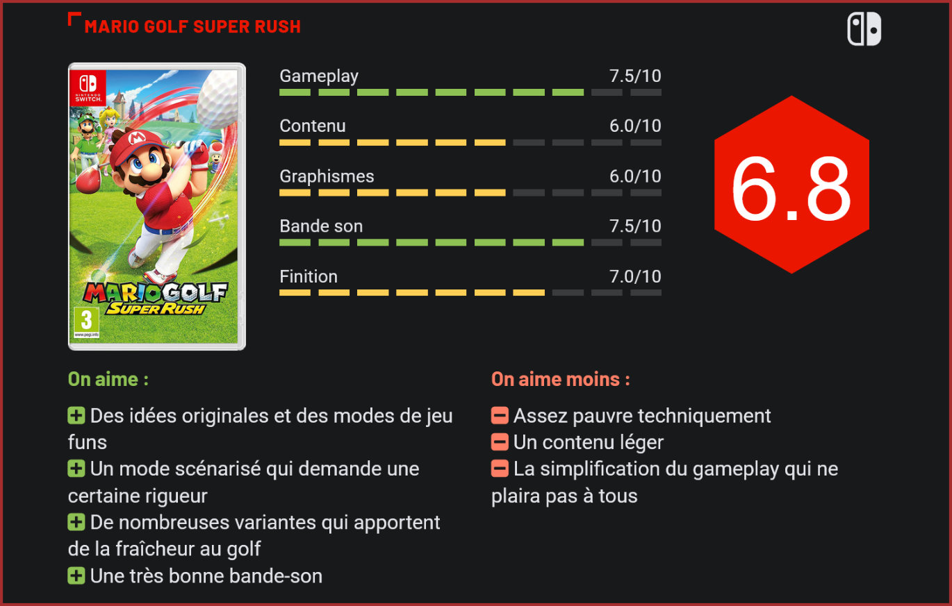 Mario revient pour une nouvelle aventure sportive, un nouveau jeu de golf prenant place dans l’univers du royaume champignon. C’est aujourd’hui devenu une habitude, Nintendo n’hésite pas à décliner l’univers de sa fameuse mascotte dans différents jeux de sports. Karting, football, tennis, baseball, tout y est passé, et même le golf. Si on peut retracer l’origine de l’idée jusqu’à NES Open Tournament Golf en 1992, c’est véritablement sur Nintendo 64 que la franchise Mario Golf est née. Un titre sorti en 1999 et développé par le studio Camelot, également connu pour être à l’origine de Golden Sun, pour avoir travaillé sur la série Shining Force de SEGA, mais qui se concentre aujourd’hui uniquement sur les jeux de sports Mario. On les retrouve bien sûr au développement du sujet d’aujourd’hui, Mario Golf Super Rush, un épisode tout neuf qui débarque 7 ans après le dernier jeu de golf du plombier. Ce nouvel épisode reprend les règles principales du jeu de golf mais permet d’y jouer de différentes manières. Que ce soit en solo ou en multijoueur (en ligne ou local), plusieurs variations sont disponibles. Le golf standard peut être joué au tour à tour, de manière classique. L’autre mode de jeu principal est le Speed Golf, une variante où tous les participants jouent en même temps et doivent déplacer leur personnages sur le terrain. Le résultat est visuellement un peu brouillon puisque tout se passe en même temps et que la lisibilité en prend un coup, mais le mode n’en reste pas moins fun. Plusieurs variations des règles existent alors, les points peuvent être distribués selon le nombre de coups joués avant d’atteindre un trou mais également selon le temps qu’il aura fallu à chaque joueur pour atteindre l’objectif. Le Golf Mêlée est une autre variation qui se joue dans un stade. Il s’agit d’une épreuve de rapidité où tous les trous sont disponibles et où tous les participants jouent simultanément. De nombreuses informations sont à prendre en compte pour être efficaces. Le gameplay est assez arcade et rapide à prendre en main. Celui-ci ne manque pas de subtilité pour autant. La puissance de votre coup, le club utilisé qui influe sur la précision ou encore la direction du vent sont autant de paramètres à prendre en compte pour jouer efficacement. Il devient alors assez grisant d’apprendre à maîtriser tous les outils. Un peu plus de quinze personnages sont jouables et chacun d’entre eux ont des statistiques différentes et des habilités propres utilisables dans les différents modes de jeu. Le gros morceau du titre c’est son mode “aventure golfique”, un mode scénarisé où on incarne un Mii qui va lancer sa carrière de golfeur. Notre personnage débarque dans la ville d’Erascotte, reconnu dans le royaume champignon comme étant un village où de grands golfeurs ont appris à jouer. Nous allons alors participer à diverses épreuves pour augmenter notre rang et avoir une chance d’affronter les professionnels. Comptez une dizaine d’heure pour voir le bout de ce mode scénario. Plusieurs zones sont explorables à souhait dans le mode Aventure Golfique. Ce mode prend la forme d’un petit RPG avec quelques villes explorables et magasins permettant de s’équiper de tenues et de clubs différents. Chaque partie rapporte de l’argent et de l’expérience à notre Mii, et chaque niveau gagné permet de dépenser un point dans l’une des cinq catégories, à savoir puissance, endurance, vitesse, précision et effet. S’il n’est pas très ambitieux, le mode aventure golfique offre tout de même un bon moyen de découvrir le titre et ses différents modes de jeu. Chaque ville possède son propre parcours de golf ainsi que de petites spécificités qui apportent de la variété à cette aventure, à l’image de la seconde ville qui transforme le jeu en du golf “tout-terrain”, où il faudra atteindre plusieurs trous dans une grande zone libre remplie de relief et d’obstacles. Les néophytes pourront s’acclimater grâce à de nombreux tutoriels disponibles dans le menu principal. Le mode aventure propose également un apprentissage progressif des règles du golf. Un lexique est également à disposition, ce sport utilise de nombreux termes spécifiques employés souvent dans le jeu. S’il est plutôt aisé d’apprendre à y jouer, ce Mario Golf Super Rush demande tout de même une certaine rigueur. C’est particulièrement le cas du mode aventure à la difficulté parfois un peu exigeante, rien d’insurmontable mais les nouveaux joueurs devront être attentifs durant les leçons. Il est possible d’utiliser des sprints et pouvoirs différents selon notre personnage. Le titre nous régale d’une bande-son de très bonne qualité. Une soundtrack composée par Motoi Sakuraba, un musicien ayant travaillé sur les jeux Dark Souls ou encore les Tales of, qui est également un habitué des jeux de sport Mario. Graphiquement, le titre est plus que correct sans pour autant être impressionnant. Quelques petits soucis de distance d’affichage et d’aliasing sont tout de même présents. Il est plutôt recommandé d’y jouer sur une télévision plutôt qu’en mode portable, la plus grande résolution permettant une meilleure visibilité. Super Rush est un titre satisfaisant qui arrive à apporter du dynamisme et de la variété à la formule classique du golf. Il faut cependant souligner un petit manque de contenu puisque le titre ne propose pas grand chose de plus que les parties standard et le mode scénarisé. Un aspect qui sera peut-être corrigé avec le temps puisque des mises à jour gratuites sont prévues. Mario Golf fait tout de même preuve d’une grande flexibilité puisqu’il est possible d’y jouer comme on le souhaite. Le jeu prend en charge la Manette pro, les joy-cons ensemble ou individuellement, et même le motion contrôle est utilisable. Les parties tour 