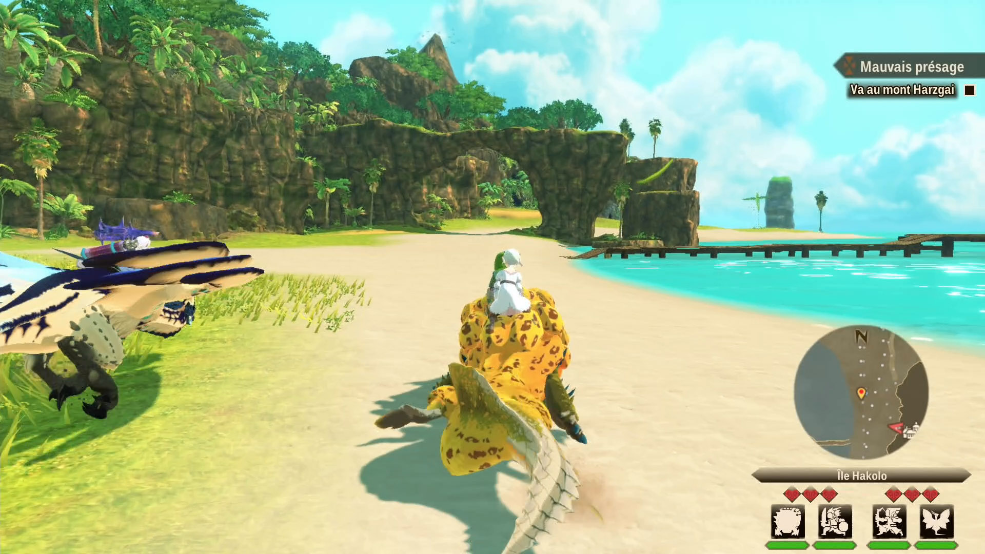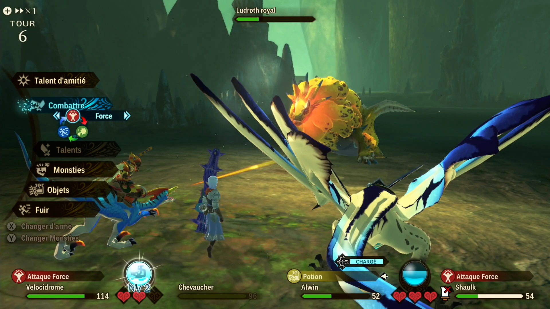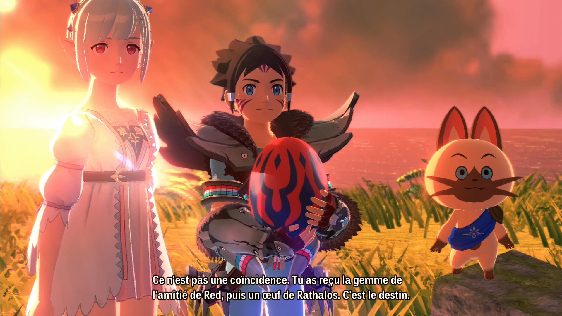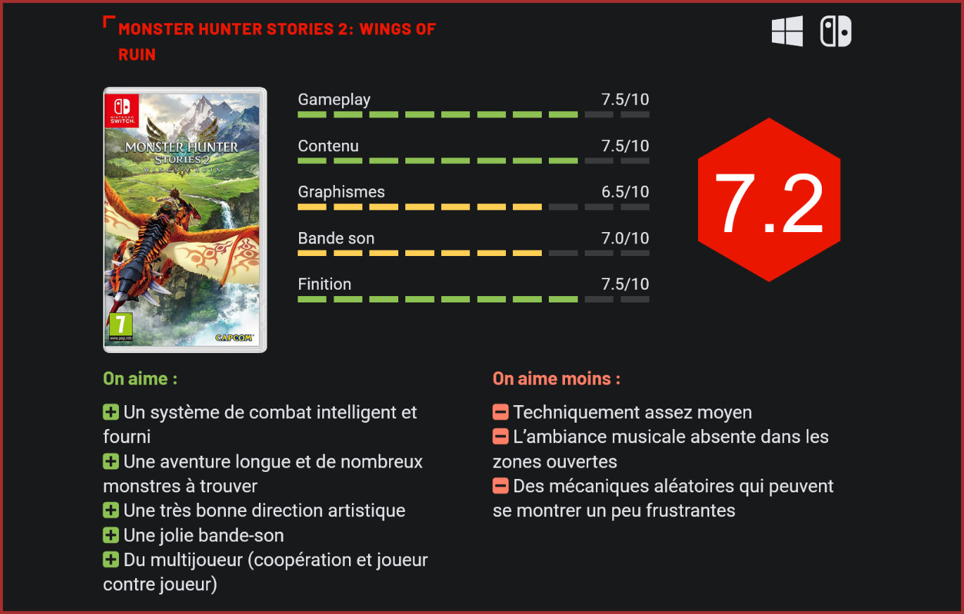 Capcom nous propose un nouvel épisode du spin-off de sa série phare. Monster Hunter Stories est de retour avec un deuxième jeu reprenant et améliorant la formule du précédent. Malgré la popularité écrasante de la série Monster Hunter aujourd’hui, le premier épisode de Monster Hunter Stories n’avait pas fait grand bruit. Il est pourtant sorti sur mobile et sur une 3DS en fin de vie dont le public était enclin à accueillir un titre qui s’inspire beaucoup de Pokemon. Capcom retente cette fois sa chance sur Switch et PC à peine quelques mois après la sortie de Monster Hunter Rise. Contrairement aux jeux traditionnels, Monster Hunter Stories 2: Wings of Ruin est un JRPG nous mettant dans la peau d’un apprenti Rider vivant sur l’île d’Hakolo, où de mystérieux événements se produisent. Les monstres deviennent de plus en plus agressifs et le Rathalos gardien de l’île disparaît, laissant un œuf particulier derrière lui. Cet œuf sera confié à notre personnage et deviendra un Rathalos aux ailes sombres et incapable de voler. Celui-ci pourrait être lié à une légende annonçant l’arrivée d’un cataclysme. Accompagné de Navirou, un felyne déjà présent dans le premier jeu, nous partons à l’aventure dans le but de percer tous ces mystères. Il est possible de chevaucher nos monstres pour accélérer les déplacements. À l’inverse des chasseurs, les Riders tissent des liens, apprivoisent les monstres et se battent à leur côté. Nous allons alors explorer tout un tas de zones, affronter des monstres mais également pouvoir pénétrer dans leur tanières, sortes de petits donjons générés aléatoirement, pour voler un œuf et en faire un membre de notre équipe. Cette mécanique est truffée d’éléments aléatoires, que ce soit le placement des tanières dans les environnements, les œufs que vous pourrez y trouver mais également les statistiques des monstres qui vont éclore. Tout cela donne de bonnes raisons de prendre du temps pour passer dans les tanières, en particulier celles qui sont rares. Il sera possible de recruter un peu moins d’une centaine de créatures différentes tout au long du jeu. Chaque espèce de monstre possède ses propres capacités ainsi que des gènes donnant des effets passifs distribués aléatoirement à la naissance. Ceux-ci pourront être transférés d’un monstre à l’autre grâce au rite de transmission, ce qui fait que chaque exemplaire de chaque monstre peut contribuer à renforcer votre équipe. Les combats se déroulent au tour par tour, nous sommes aux commandes de notre personnage accompagné d’un monstre (et parfois d’autres personnages du scénario). Le système fonctionne en suivant les règles de pierre-papier-ciseaux puisqu’il est possible de choisir parmi trois types d’attaques (Les attaques “Force” efficaces face aux attaques “Techniques”, elles-mêmes fortes face aux attaques “Vitesse”…). Les effets ne s ‘activent que lorsqu’un allié et un ennemi se ciblent mutuellement, le perdant de la confrontation verra son attaque totalement annulée. Des personnages du scénario nous accompagnent parfois. Si le système de combat est original, il n’échappe cependant pas à un peu de frustration lié à l’aspect aléatoire de pierre-papier-ciseaux. Il est possible de choisir les actions de notre personnage mais pas de nos monstres qui agissent de manière autonome et qui ne font pas preuve d’une grande intelligence. Nous avons tout de même du contrôle sur ce système puisque les monstres, qu’ils soient alliés ou ennemis, ont tendance à utiliser un type d’attaque en particulier. Réussir ces confrontations permet de remplir la jauge d’amitié qui peut être utilisée pour activer des capacités spéciales mais également pour chevaucher votre monstre une fois celle-ci pleine. Chevaucher permettra de contrôler votre monstre et d’avoir accès à une attaque ultime qui variera selon son espèce. De nombreuses autres nuances sont présentes, les différents types d’armes qu’il est possible d’équiper à notre personnage, les faiblesses à certains éléments, les différentes parties des gros monstres qu’il est possible de casser… Malgré ces petites touches d’aléatoire, le système de combat se révèle riche et intelligent. La bande-son est de très bonne qualité, s’accordant parfaitement avec l’univers du jeu. Il est pourtant étrange de voir que l’exploration des environnements n’est accompagnée d’aucune musique, ne laissant que les bruits de pas de notre monture comme ambiance sonore. Un autre point qui fâche c’est la technique du jeu, en tout cas sur la version Switch. Le framerate est très inconstant, les grottes et autres petites zones restent stables tandis que les environnements ouverts et les villes font drastiquement chuter la fluidité. C’est particulièrement le cas du jeu en mode portable qui semble souffrir encore plus que sur une télévision. Les environnements ne sont pas non plus visuellement très impressionnants mais la direction artistique fait tout de même des merveilles au niveau du rendu des personnages et des monstres. Le rendu des cinématiques est très convaincant. Les fameux monstres sont beaucoup moins réalistes que dans les jeux Monster Hunter principaux. Monster Hunter Stories fait le choix d’une direction artistique plus proche d’un animé Japonais, plus coloré et mignon qu’à l’accoutumé. Le scénario prend également un autre ton, quelque chose d’un peu plus “shonen” avec de l’humour, de la détermination, de l’amitié et d’autres poncifs du genre. Une ambiance qui séduira peut-être un public un peu plus jeune. Les fans de Monster Hunter y trouveront tout de même leurs marques puisque de nombreuses mécaniques de jeu sont adaptées pour cette formule. Tout comme dans les jeux principaux, affronter des monstres permet aussi de gagner des matériaux pour crafter arm