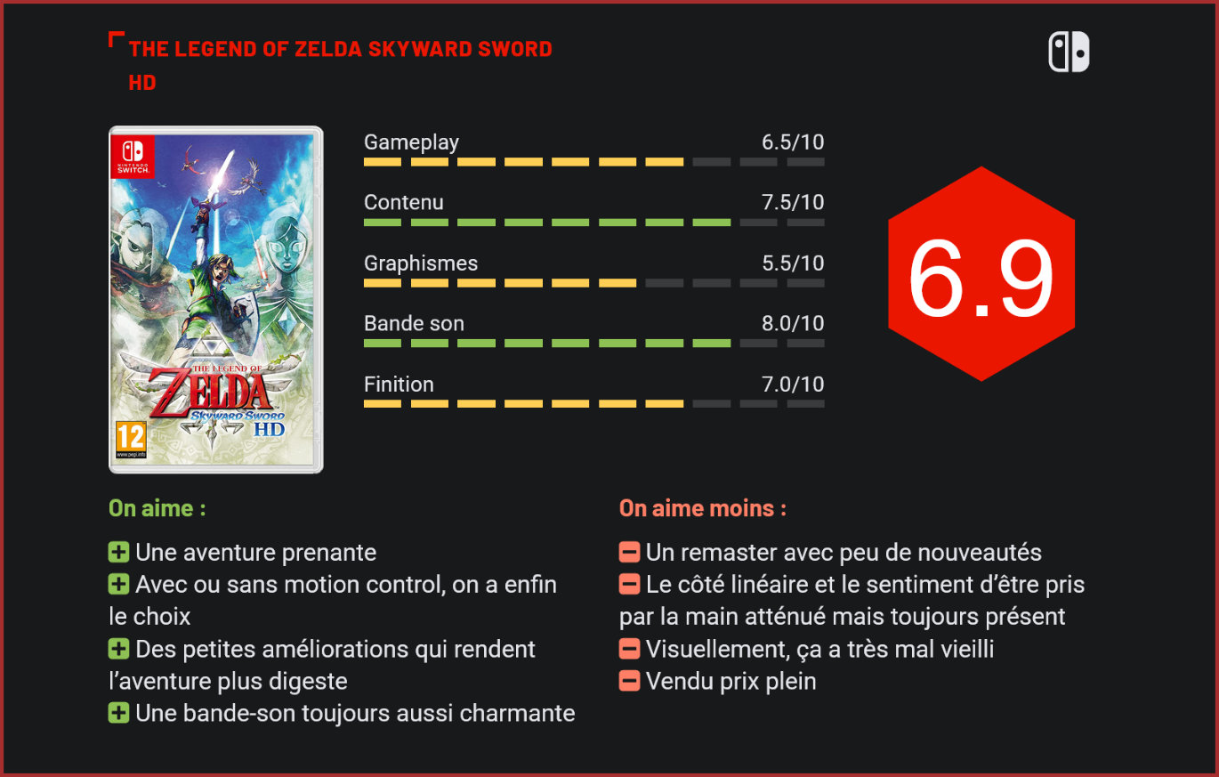 Il y a presque 10 ans débarquait un nouveau jeu Zelda sur nos Wii, celui-ci est de retour dans une version remasterisée en HD pour la Switch. The Legend of Zelda: Skyward Sword a-t-il résisté à l’épreuve du temps ? Paru en novembre 2011, The Legend of Zelda Skyward Sword est peut-être l’un des épisodes les plus controversés de la saga. Sorti à l’époque sur la Wii, le titre s’avérait très linéaire, trop enclin à prendre les joueurs par la main, mais faisait également le pari d’utiliser à fond les capacités de la Wii et du gameplay tout en mouvement des Wiimotes+. Il était également le représentant d’une formule qui stagnait, celle-là même installée par Ocarina of Time qui n’avait pas beaucoup évolué depuis la Nintendo 64. Skyward Sword a alors été le dernier jeu Zelda en 3D reprenant cette structure avant l’arrivée du novateur Breath of the Wild venu bouleverser les codes de la série. Le titre fait un triomphant retour sur Switch dans une version HD, bien décidé à corriger ses torts. Skyward Sword est un épisode important dans l’univers de Zelda, puisqu’il est le tout premier jeu de l’ordre chronologique. Celui-ci aborde donc l’origine de l’univers que l’on parcourt dans les autres jeux de la saga. Des centaines d’années avant les évènements du jeu, la déesse envoya les humains dans les cieux, sur une île flottante, dans le but de les protéger des créatures des ténèbres vivant à la surface de la terre. On incarne alors Link, un habitant des cieux qui va rejoindre la surface pour chercher Zelda, son amie d’enfance emportée par une tornade. Celui-ci sera guidé dans sa quête par Fay, un esprit envoyé par la déesse qui lui remet l’Épée Divine. Il est possible d’explorer différents lieux de la surface. Ce statut de préquelle rend le scénario de cet épisode particulièrement important dans la mythologie de la saga. En accord avec cette idée, Skyward Sword est l’un des jeux Zelda les plus scénarisés et l’un des épisodes les plus linéaires. Cette aventure nous laisse explorer les cieux mais également différentes régions de la surface ainsi que plusieurs donjons. Ces derniers sont un mélange d’exploration, de réflexion et de combat particulièrement réussis. Enfin, les cieux peuvent être explorés librement à dos de Célestrier, de grands oiseaux qui nous permettent d’atteindre les nombreuses petites îles flottantes qui entourent la ville principale de Célesbourg. Ce petit monde ouvert est malheureusement assez vide à moins de trouver les cubes de la déesse cachés un peu partout à la surface. Frapper ces derniers avec notre épée va faire apparaître de nombreux coffres dans le monde ouvert. Switch oblige, la maniabilité a également été revue, en particulier les combats dont la prise en main varie. Il existe deux types de contrôles, l’un similaire aux contrôles originaux utilisant les joycons détachés qu’il faut brandir tel une épée et un bouclier, et le second plus adapté au jeu en mode portable, utilisant le stick analogique droit pour attaquer. Les mécaniques de combat ainsi que de nombreuses énigmes reposent sur les mouvements de Link. Ces deux configurations permettent de laisser le choix même s’il est beaucoup plus naturel et amusant d’y jouer avec les mouvements des joycons. Attaquer avec le stick droit demande de s’y habituer et de faire quelques compromis, son utilisation enlevant par exemple le contrôle de la caméra. Il faut taper les ennemis dans la bonne direction pour éviter leurs défenses. Le reste est relativement classique dans la série, reprenant une recette qui a fait ses preuves. On obtient des objets dans les donjons qui servent en combat ou pour résoudre des énigmes. Cet épisode propose pourtant les prémices de quelques mécaniques qu’on retrouve dans Breath of the Wild. Link possède une certaine agilité qui lui permet de courir et d’escalader certains murs grâce à une jauge d’endurance. Il est également possible de trouver tout un tas de matériaux permettant d’améliorer les objets, certains comme les boucliers ont même une jauge de durabilité. Comme souvent dans la série, cet épisode démontre un savoir-faire musical impressionnant. On y retrouve de nombreuses musiques marquantes. Pour la première fois, Skyward Sword affiche un 60 images par seconde irréprochable, apportant beaucoup à la fluidité de l’aventure. Le bilan est un peu moins brillant en ce qui concerne les graphismes. Les visuels inspirés de courants artistiques comme l’impressionnisme sont tirés vers le bas par des textures floues que l’on devine d’époque. Le rendu est forcément plus agréable en mode portable à cause de la taille de l’écran plus petite. Explorer les cieux est sympathique, dommage qu’il n’y ait pas grand-chose à y faire. En dehors de l’apport de la HD et de la maniabilité, les plus grands changements de cette nouvelle version de Skyward Sword se trouvent être des petites retouches qui amènent plus de confort et de praticité à l’expérience. Le titre original avait tendance à excessivement prendre les joueurs par la main, cet aspect est désormais réduit, laissant tout de même la possibilité d’écouter les nombreux conseils de Fay en appuyant sur un bouton. Les fenêtres d’informations sont également beaucoup moins fréquentes. Comptez un peu plus de trente heures pour voir le bout de cette aventure, et plus pour terminer le jeu à 100%. Loin d’être indispensable, ce remaster permet de revivre ce très bon titre dans de meilleures conditions. Conclusion Sorti il y a presque 10 ans sur Wii, The Legend of Zelda Skyward Sword est de retour sur Switch. Cet épisode se déroule au tout début de la chronologie et permet aux fans de découvrir les origines de cet univers. Nous y incarnons Link, un apprenti chevalier vivant sur une île flottante qui va partir explorer la surface suite à la