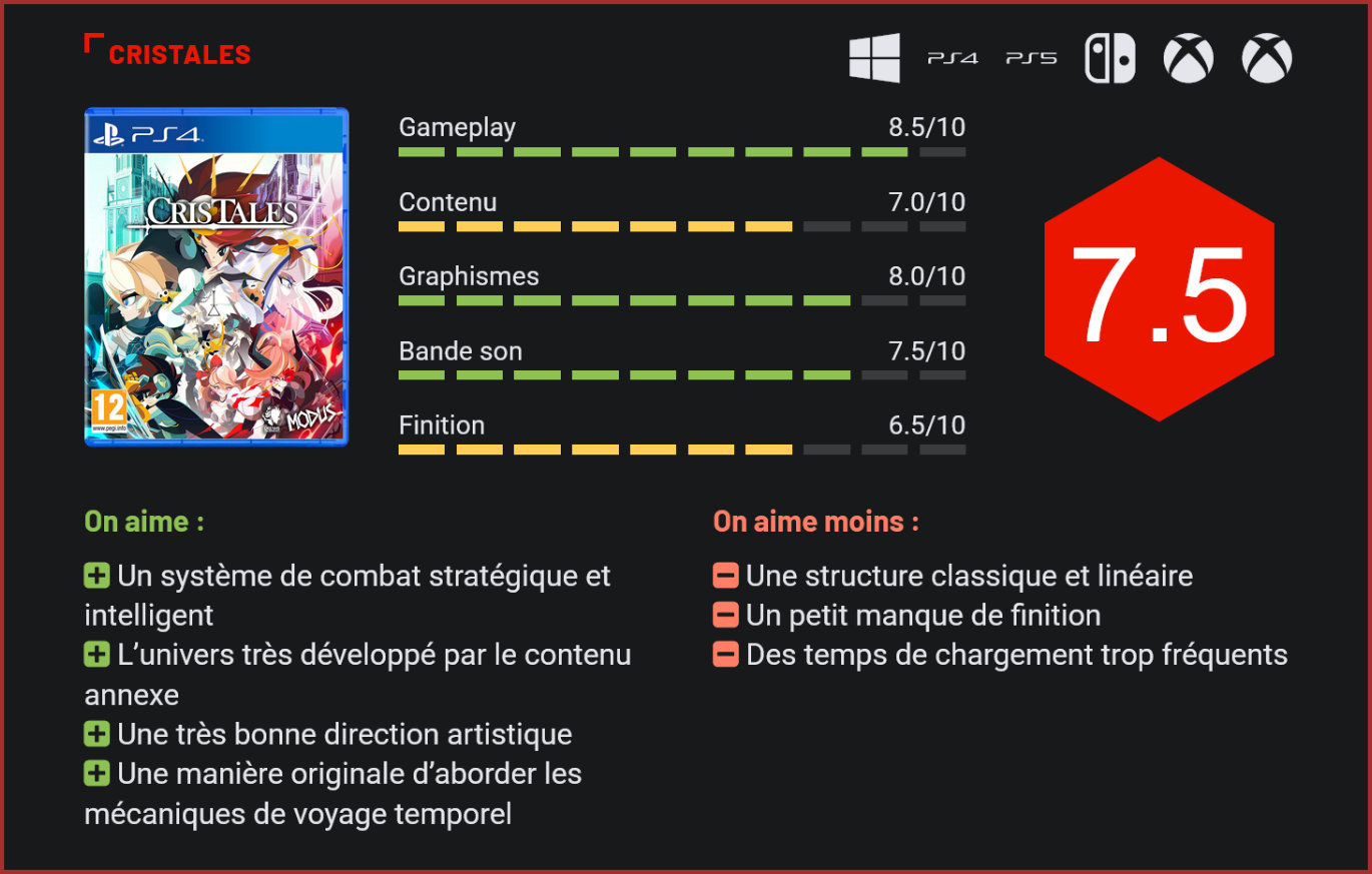 Véritablement inspiré par des JRPG classiques tels que les Final Fantasy ou encore Chrono Trigger, CrisTales est un titre indépendant perfectible mais qui impressionne sur de nombreux aspects. Il fait de l’œil aux fans de RPG depuis son annonce en 2019, Cris Tales est désormais disponible sur toutes les consoles actuelles et sur PC. On doit ce nouveau jeu à Dreams Uncorporated, un studio indépendant colombien dont c’est le premier projet. Le titre raconte l’histoire de Crisbell, une jeune orpheline qui se découvre des pouvoirs de manipulation du temps. Celle-ci a la possibilité de voir le passé et le futur des endroits qu’elle visite mais également d’agir un peu sur les différentes époques. Accompagnée de Christopher et de Willhelm, un autre mage temporel, Crisbell va voyager dans différents lieux dans le but de trouver des cathédrales qui renferment de nouveaux pouvoirs. Les héros vont vite faire la rencontre de l’Impératrice du Temps, l’antagoniste du jeu qui compte bien dominer le monde. Le titre prend place dans un univers rempli de conflits politiques où l’ombre de la guerre plane. Crisbell a la capacité de voir le passé, le présent et le futur en même temps. L’aventure est linéaire et structurée de manière classique pour le genre, avec une carte du monde où sont disposés les différents lieux à visiter. Une grande importance est mise sur les villes et les problèmes que rencontrent les habitants. Nos personnages vont s’impliquer, nos actions et les pouvoirs temporels de l’héroïne vont alors pouvoir modifier l’avenir de la ville et de différents personnages. L’écran est bien souvent divisé en trois parties. Le présent est représenté au centre, tandis que le passé est à gauche et le futur à droite. Il est donc possible à tout moment de voir les différentes époques, ce qui amène des interactions et des énigmes bien pensées. Des moments clés du scénario demanderont à Crisbell de faire des choix qui décideront du futur. En plus de la quête principale, des quêtes annexes permettent d’apporter plus de contexte concernant les événements de l’histoire et de développer l’univers, celui-ci étant un point central du jeu. Il est fortement recommandé de réaliser ces quêtes puisqu’elles débloquent de nouvelles possibilités concernant les choix du scénario. La direction artistique du titre est particulièrement réussie. S’il souffre tout de même de quelques soucis de framerate, Cris Tales bénéficie d’un style très marqué et très agréable à l’œil. Les personnages sont magistralement dessinés et animés à la main. Nous évoluons dans des zones en 3D aux décors très colorés. Ceux-ci paraissent parfois assez simplistes, réalisés avec de grands aplats de couleurs, mais de nombreux détails viennent y ajouter une certaine richesse visuelle. Les musiques ne sont pas en reste, le titre propose de très belles mélodies et des thèmes de combats motivants. Cris Tales est aussi entièrement doublé, un doublage uniquement anglais de très bonne qualité. Des moments clés sont également représentés par des cinématiques animées du plus bel effet. Certaines zones regorgent de détails. Cris Tales brille également par son système de combat. Les affrontements se déroulent en tour par tour mais incluent quelques éléments d’action, à la manière des RPG de l’univers Mario. Il est par exemple possible d’appuyer sur un bouton au moment de recevoir une attaque ennemie pour minimiser les dégâts ou encore juste après avoir porté un coup pour en donner un deuxième. Il est cependant dommage de voir que les timings nécessaires pour ce genre d’actions ne sont pas toujours très clairs. Plusieurs personnages composent notre équipe et chacun d’entre eux possède des capacités uniques. Mais la véritable force de ce système c’est l’utilisation des capacités temporelles de Crisbell qui apportent une nouvelle dimension stratégique. En échange de CP, celle-ci a la possibilité d’envoyer les ennemis dans différentes époques, à savoir le passé si les ennemis sont du côté gauche de l’écran et le futur s’ils sont du côté droit. Chacune des époques va avoir des répercussions sur les créatures que nous affrontons. Envoyer un gobelin dans le passé va l’affaiblir considérablement, alors qu’envoyer un loup dans le futur va le rendre beaucoup plus fort. Cela va grandement dépendre des ennemis en question qui vont réagir différemment selon les époques, il faut alors prendre garde à ne pas se mettre dans une situation délicate. Le système de combat est intelligent et engageant. Les autres personnages viennent renforcer nos possibilités en lien avec ces capacités temporelles. A l’image de Wilhelm, l’un des premiers membres à rejoindre notre équipe, qui a la capacité de planter des petites créatures porteuses d’effets. Il est alors possible de faire des combos en empoisonnant un ennemi pour ensuite l’envoyer dans le futur, ce qui lui infligera de lourds dégâts liés à l’empoisonnement. Le système est ingénieux et ajoute même d’autres mécaniques comme l’utilisation d’éléments et de faiblesses. Le titre se veut être un véritable hommage aux JRPG classiques. Sans être insurmontable, le challenge est présent et le jeu ne prend pas les joueurs par la main. Il sera question ici de parcourir les donjons en gérant nos objets et points de magie pour parvenir au bout. Il est dommage de voir que le titre souffre de temps de chargement trop fréquents et d’un petit manque de finition à certains endroits. Certaines zones montrent des petits problèmes d’affichage, d’autres moments auraient bénéficié d’un peu plus de travail sur le son… Cela n’enlève en rien les nombreuses qualités de Cris Tales qui reste un très bon RPG. Conclusion Vibrant hommage aux classiques du JRPG, Cris Tales est pourtant un petit jeu indépend