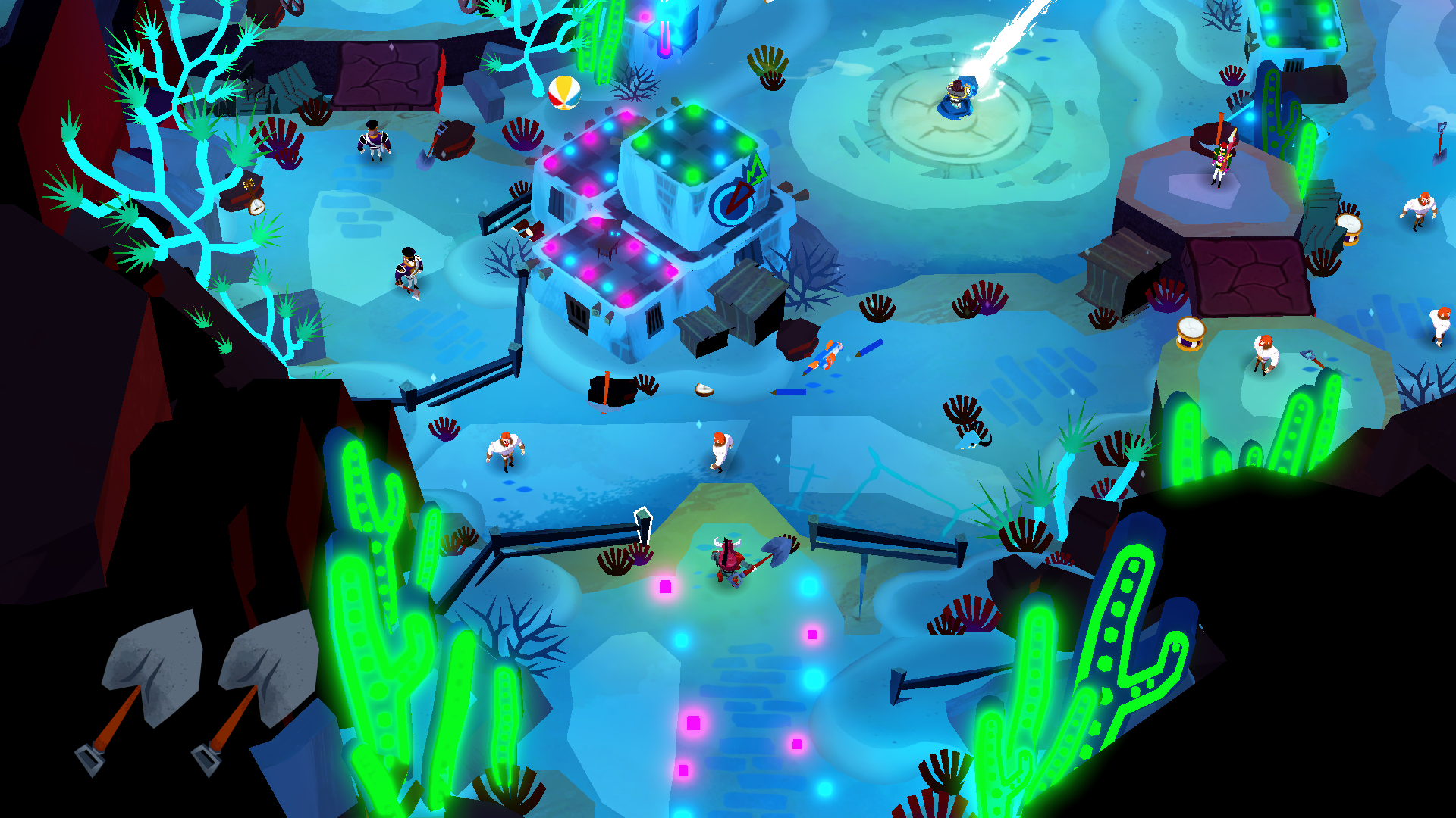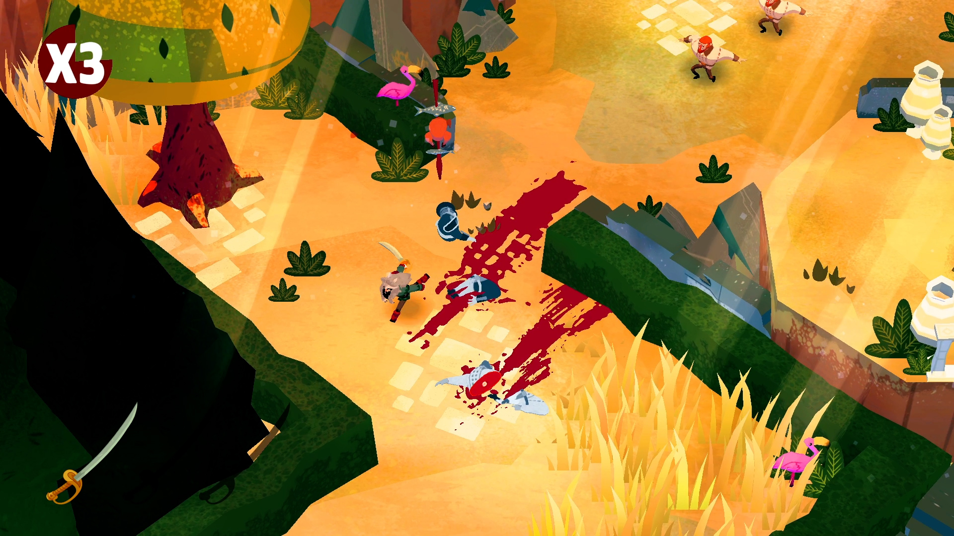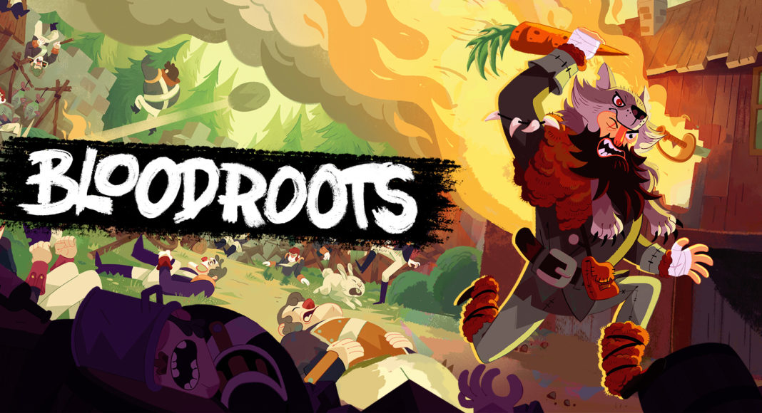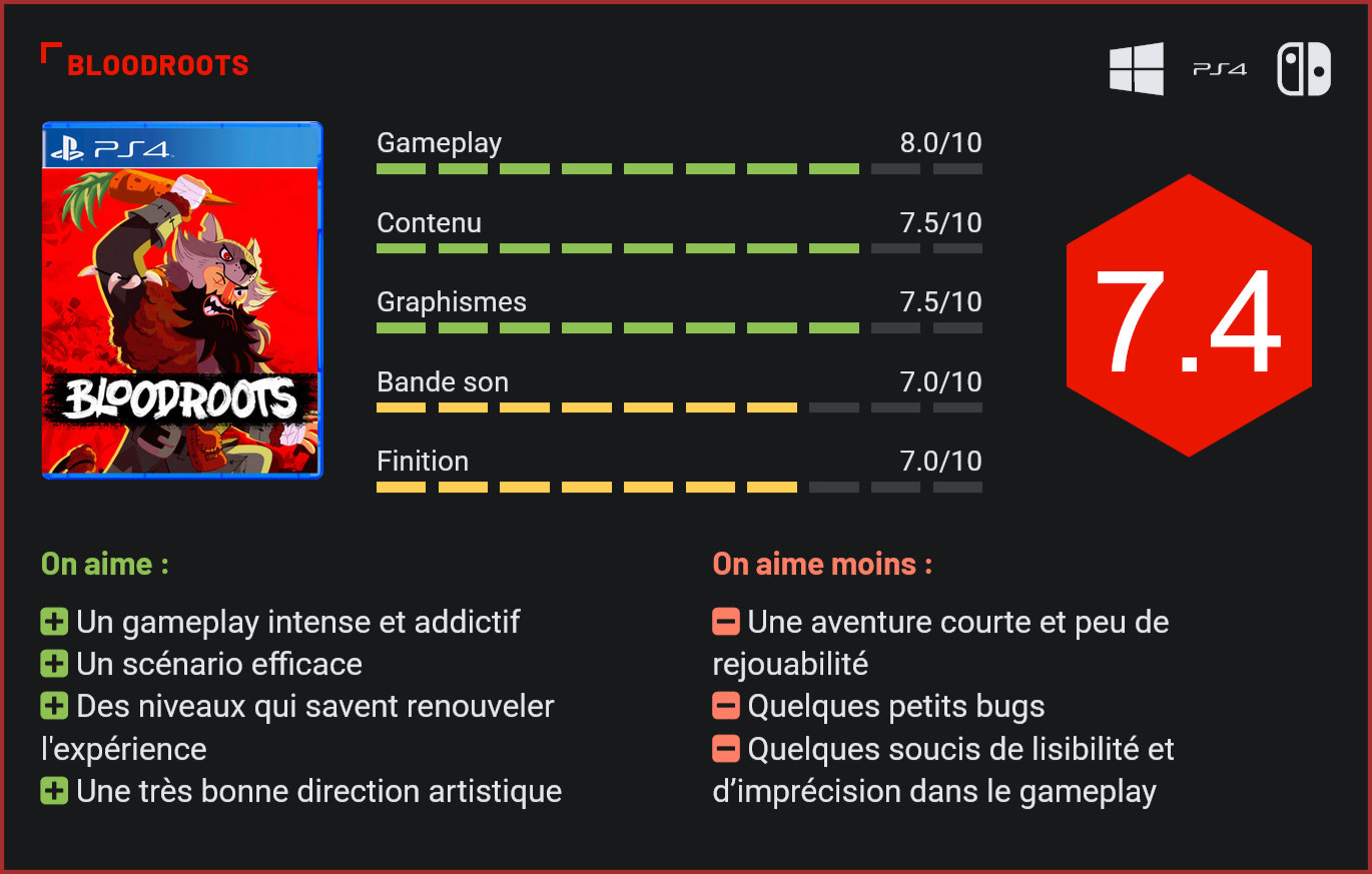 Tout récemment arrivé sur le Game Pass, Bloodroots est un jeu indépendant québécois. Avec cette nouvelle production, Paper Cult nous propose un jeu d’action frénétique avec de nombreuses qualités. S’il était déjà disponible depuis début 2020 sur PC, PS4 et Switch, Bloodroots a débarqué durant ce mois de juillet dans le Game Pass. Il s’agit d’un jeu d’action en vue du dessus qui ne fait pas dans la dentelle. On le doit à Paper Cult Games, un studio indépendant basé à Montréal qui montre son savoir-faire en matière de jeux nerveux grâce à ce titre. Bloodroots nous met dans la peau de M. Loup alors qu’il débarque dans la petite ville de Tarrytown dont les habitants ont tous été massacrés. Celui-ci croise alors la route de quatre mystérieux individus qui le laissent pour mort. Bel et bien vivant, notre protagoniste compte bien se venger et découvrir les raisons derrière les actes de ses agresseurs. Le scénario est simple et plaisant à suivre, l’écriture y est sympathique et le ton parfois décalé. La narration se montre assez discrète, celle-ci n’est présente qu’entre les phases de jeu et est parfois optionnelle. Cette histoire réserve tout de même quelques surprises, même si l’intérêt du jeu réside bien plus dans son gameplay. Tuer tous les ennemis est loin d’être facile. À la manière d’un Hotline Miami, le but du jeu est de tuer tous les ennemis dans un environnement fermé. Que ce soit les ennemis ou notre personnage, un seul coup fait passer l’arme à gauche. Chaque niveau est assez long et divisé en segments, chaque mort nous fait réapparaître au début du segment dans lequel on se trouvait. Notre protagoniste peut utiliser ses poings mais il est impossible d’enchainer les coups et ceux-ci ont une portée limitée, vous laissant à la merci des ennemis s’ils sont nombreux. Il est alors bien plus efficace d’utiliser les nombreuses armes et objets trouvables dans les niveaux. Il est possible d’y trouver beaucoup de choses utiles et à peu près tout peut être utilisé pour tuer, les épées, les armes à feu, les arcs et flèches mais aussi les bouts de bois, les chaises voire même les légumes qui trainent peuvent servir. Ces objets ont une utilisation limitée, les armes se détruisent après deux ou trois coups portés sur des ennemis, tandis que les éléments de décors ne prennent qu’une seule utilisation. Il faut alors constamment changer d’outils et improviser avec ce qu’on a sous la main sous peine de devoir recommencer le segment. Tous ces objets agissent différemment, étant parfois des outils de déplacements comme les échelles et autres hélices qui nous donnent la possibilité de sauter plus haut. Certaines sont des armes à distances, d’autres comme les harpons nous projettent directement sur les ennemis… De quoi varier nos approches sur le champ de bataille. Les niveaux sont très efficacement conçus, avec beaucoup de variété et différents types d’ennemis permettant de proposer de nombreuses situations originales. Les décors sont aussi très destructibles, permettant d’ajouter encore plus de possibilités d’improvisation. Tuer le dernier ennemi de la zone déclenche une cinématique très dynamique. La prise en main est immédiate et le feeling de jeu très agréable. Notre personnage est très rapide et enchaîner les attaques et les combos correctement à un rythme effréné procure un véritable plaisir, une frénésie addictive qui donne envie de continuer à chaque erreur. Certains niveaux n’échappent cependant pas à un peu de frustration, certains requiert d’apprendre par cœur les placements des ennemis. On est aussi parfois victime de quelques petits bugs de collision avec les décors et de quelques fautes de précisions et de lisibilité qui s’ajoutent à cette frustration. Bloodroots est un titre à la difficulté relevée, un véritable die & retry qui demande du sang-froid et une certaine maîtrise des niveaux sans pour autant être très punitif. La direction artistique colorée fonctionne très bien. Les personnages ont un design un peu cartoon et des décors sentent le western et parfois les forêts enneigées du Canada. La bande-son est également de bonne facture, avec un sound design qui met bien dans l’ambiance et quelques morceaux qui restent en tête. La mise en scène est assez minimaliste, même si certains passages du scénario sont plus travaillés. La mort du dernier ennemi de chaque vague est aussi accompagnée d’une cinématique très dynamique et gore, celle-ci dépend de l’arme utilisée. Certains décors sont originaux. Si l’aventure se boucle en environ cinq heures et que le titre ne propose que peu de choses après la fin, l’intérêt réside aussi dans le scoring et la recherche de la note parfaite sur chaque niveau. Il est possible de recommencer les parcours pour améliorer son score mais également pour fouiller les environnements à la recherche de quelques collectables, dont des chapeaux à équiper qui octroient différents avantages qui changent un peu la manière de jouer. Le titre compense sa maigre durée de vie par un prix qui reste très compétitif. Le jeu est vendu 19,99€ mais a aussi le mérite d’être intégré au Gamepass. Conclusion Passé relativement inaperçu au moment de sa sortie sur PS4 et PC, le dernier jeu du studio Paper Cult Games est toutefois parvenu à se forger une solide réputation. Suffisamment pour attirer notre attention à l’occasion de sa sortie sur Xbox. Dans ce titre, le joueur incarne M. Loup, un homme laissé pour mort par quatre mystérieux individus. Celui-ci décide de pourchasser ses assaillants et de se venger. Une histoire simple à la mise en scène minimaliste qui réserve tout de même quelques surprises. Le scénario se montre assez discret pour laisser la place à son excellent gameplay. Dans le même style qu’un Hotline Miami, le titre est divisé en segme