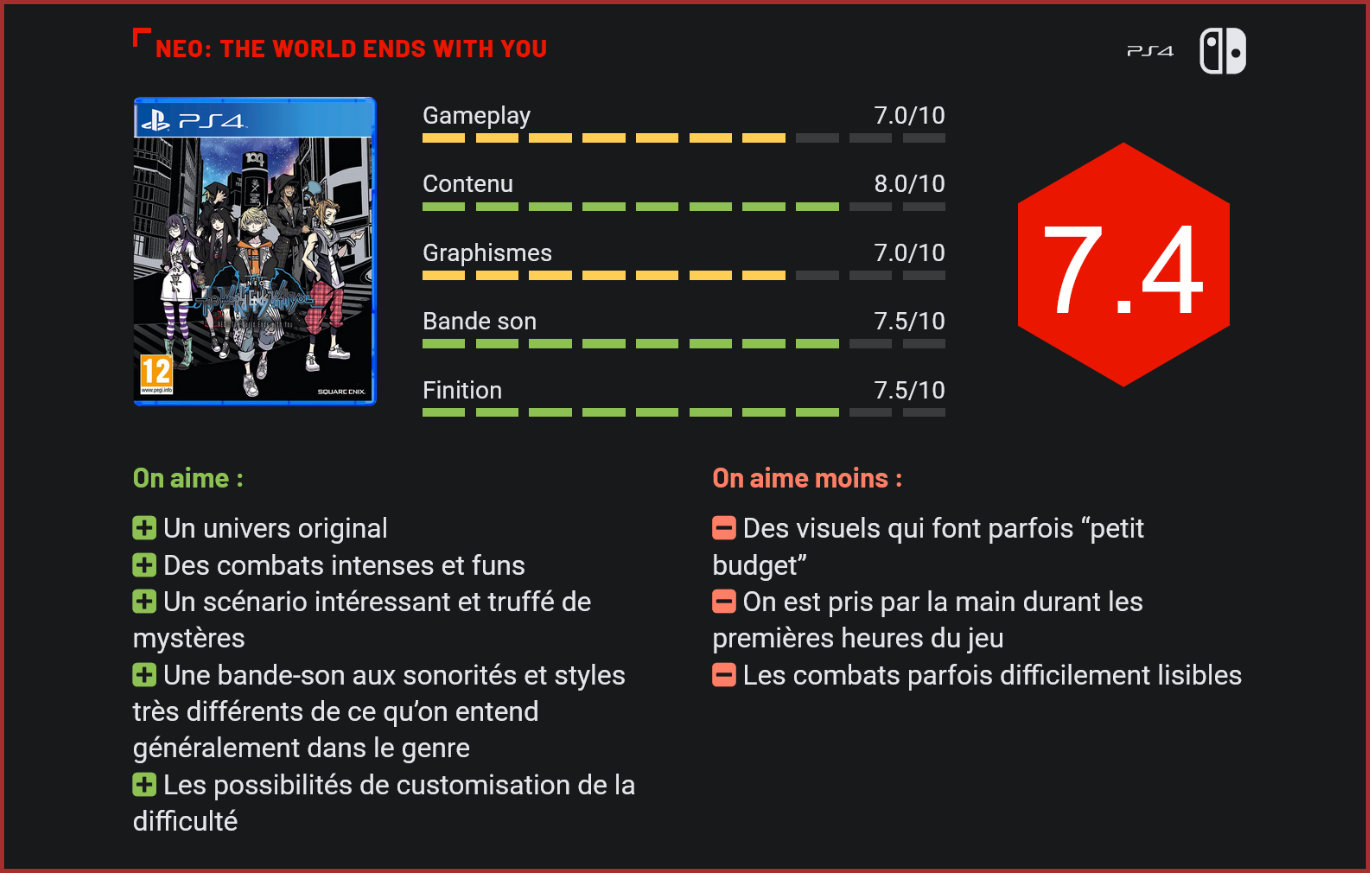 Après 14 ans d’absence, The World Ends With You refait surface avec un nouvel épisode plus ambitieux que l’original. Si on connaît Tetsuya Nomura pour son travail sur Kingdom Hearts et Final Fantasy, il est aussi l’un des réalisateurs et producteurs d’un jeu sorti en 2007 sur Nintendo DS, à savoir The World Ends With You. L’original avait rencontré un petit succès grâce à son univers tokyoïte urbain et son gameplay original, celui-ci avait la particularité d’avoir une prise en main déconcertante puisqu’il utilisait beaucoup les fonctionnalités tactiles et les deux écrans de la DS. Square Enix nous propose aujourd’hui une véritable suite de cette licence. NEO: The World Ends With You est un Action-RPG prenant place à notre époque dans la capitale japonaise, plus particulièrement dans le quartier de Shibuya. Nous suivons alors les aventures de Rindo et de son ami Fret qui vont tous deux être contraints de participer au jeu des Reapers. Il ne s’agit pas d’un jeu ordinaire puisque les protagonistes mettent leurs vies en péril en affrontant des créatures nommées “échos”. Durant sept jours, les participants doivent former des équipes et effectuer des missions dans le but de gagner des points et de finir en haut du classement, sous peine de finir “effacés”. L’univers est assez complexe, répondant à des règles particulières, et de nombreux mystères autour du jeu des Reapers rythment ce long scénario. Les protagonistes sont coincés à Shibuya durant toute la durée du jeu des Reapers. L’expérience est assez linéaire, en particulier les premières heures de jeu qui prennent bien le temps d’expliquer comment tout cela fonctionne. NEO: The World Ends With You propose quelques idées originales et tout à fait en accord avec son univers. Les pièces d’équipements sont des vêtements disponibles dans des boutiques de mode. Pour augmenter leurs statistiques, il est également nécessaire de nourrir nos personnages en allant dans des fast-foods ou restaurants. Le jeu des Reapers octroie de nouvelles capacités aux personnages, dont la possibilité de scanner les environs et de lire ce que pensent les passants. C’est par le biais de ce scan qu’il est possible de se battre contre les échos. Il est d’ailleurs possible de provoquer plusieurs combats à la chaîne nous forçant à affronter des vagues d’ennemis sans pouvoir nous soigner mais avec plus de récompenses à la clé. La difficulté fait partie de l’expérience. Celle-ci est réglée sur “normal” au départ mais on débloque ensuite un mode plus aisé et deux autres plus compliqués. Il est possible d’en changer en dehors des combats et également de volontairement baisser les niveaux de nos personnages, toujours dans le but d’obtenir plus de récompenses comme des badges, éléments centraux du gameplay. Les badges sont des objets qui permettent d’utiliser des Psych, des pouvoirs utiles en combat. Tirer des projectiles, faire des attaques au corps-à-corps où même se soigner, les badges ont de nombreuses capacités. Chacun d’entre eux n’est cependant pas unique, certains fonctionnent de la même manière mais il en existe tout de même plusieurs centaines. Les différents types de badges amènent de la diversité dans nos capacités offensives. Côté gameplay, NEO: The World Ends With You se révèle beaucoup moins original que son prédécesseur. Au lancement d’un combat, nos personnages sont transportés dans une arène en 3D où chacun peut utiliser un badge préalablement équipé pour vaincre les ennemis. Chaque badge équipé est attribué à un bouton de la manette, il est également possible de réaliser des esquives, mais c’est à peu près tout. Enchaîner les combos avec un bon timing permet d’augmenter notre jauge de Groove qui, une fois à 100%, donne accès à une attaque très puissante. Le gameplay n’est pas très profond, il suffit d’appuyer constamment sur un bouton et d’alterner de temps à autre pour être efficace. L’action est souvent brouillonne à cause des nombreux éléments à l’écran, mais les combats arrivent à rester fun grâce à la simplicité de la prise en main et à leurs durées très courtes. L’identité visuelle très marquée de la série est toujours présente dans ce nouvel épisode. Les rues bondées de Shibuya sont des décors très plaisants à parcourir. Ceux-ci sont remplis de passants à la modélisation sommaire, le style fonctionne si on n’y regarde pas de trop près. La majorité des dialogues sont mis en scène avec des illustrations des personnages dans ce qui ressemble un peu à des cases de bande-dessinée. Si ce genre de procédé est très souvent un moyen un peu cheap de représenter un dialogue, NEO arrive à rendre la pratique très dynamique, multipliant les bonnes idées et les petites animations dans sa présentation. La présentation est plus dynamique qu’il n’y paraît. On doit également le dynamisme de ces passages aux doublages tout à fait réussis, en anglais et en japonais. Tout comme le premier épisode, la bande-son est composée de chansons et de musiques aux styles très variés. Que ce soit du rock, du métal, en passant par du hip-hop et de la musique électronique, le jeu utilise tout un tas de genres différents. Si cette bande-son risque de diviser selon les goûts, force est de constater qu’elle apporte une ambiance très originale au titre. Conclusion Après une absence de 14 ans, la licence The World Ends With You fait son retour avec une véritable suite sur Playstation 4 et Switch. Ce nouvel épisode se déroule de nouveau à notre époque à Tokyo, dans le quartier de Shibuya. Nous suivons alors Rindo et son ami Fret qui vont tous deux être contraints de participer au jeu des Reapers. Ceux-ci doivent alors affronter des monstres et réaliser des tâches dans le but de survivre. Cette aventure assez longue et linéaire sera entrecoupée d
